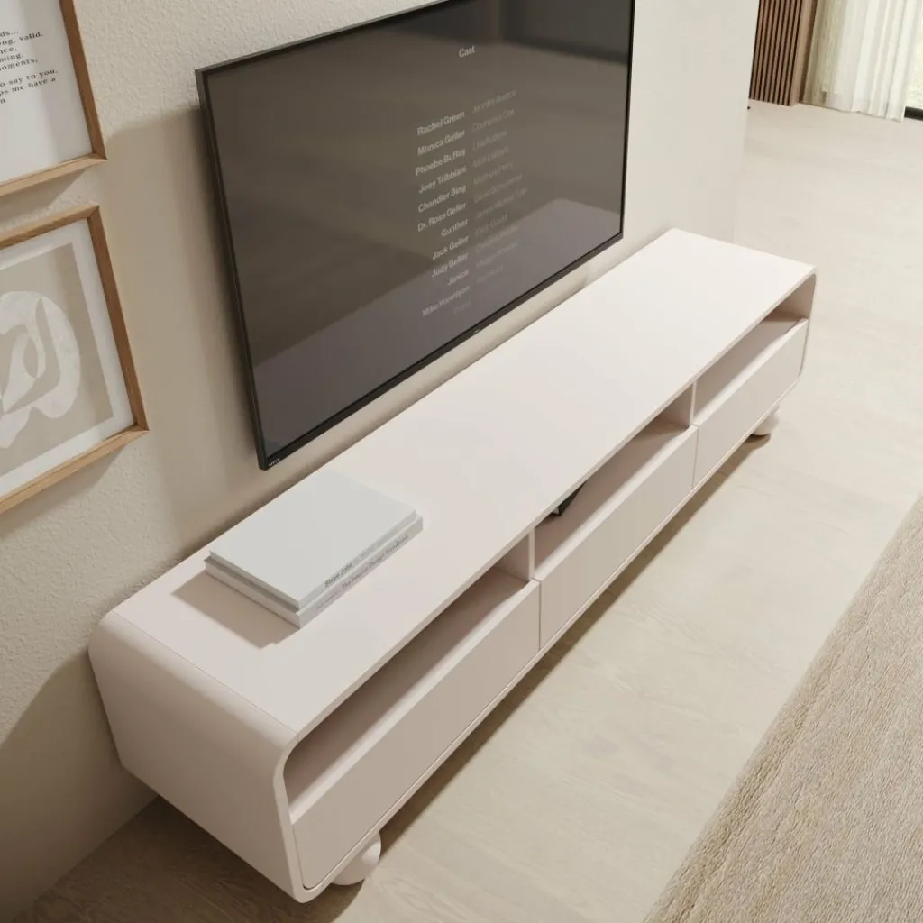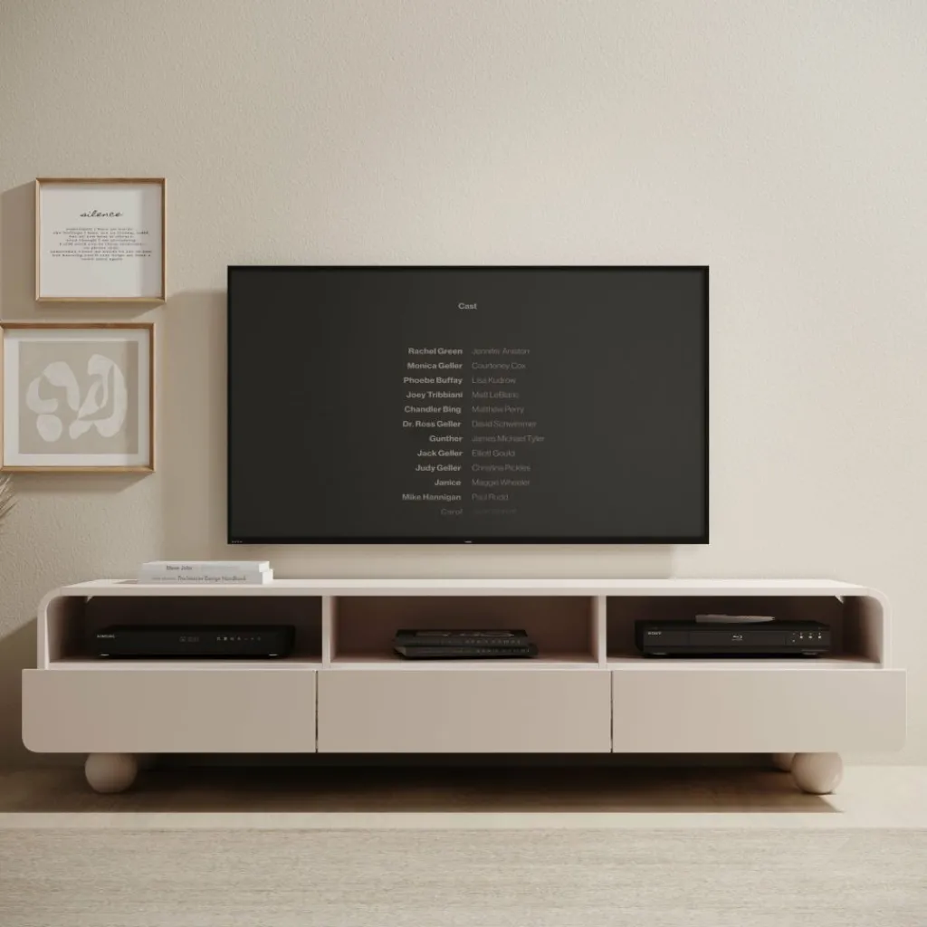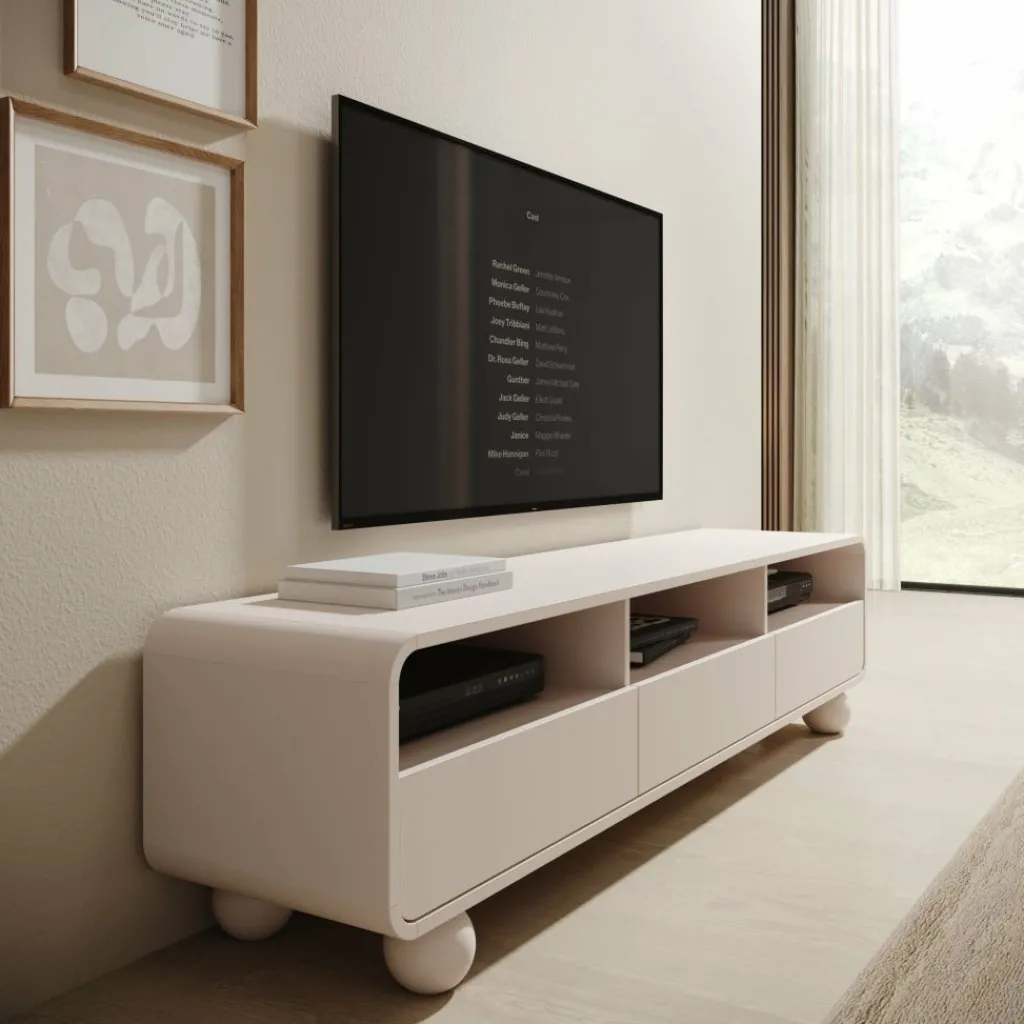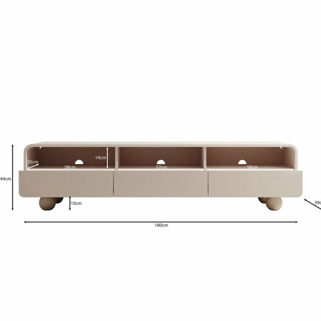 Het Anobo tv-meubel van 180 cm combineert moderne elegantie met een speels karakter. De afgeronde hoeken en bolvormige poten geven het meubel een unieke uitstraling, terwijl de beige kleur zorgt voor een rustige en stijlvolle basis in je interieur.