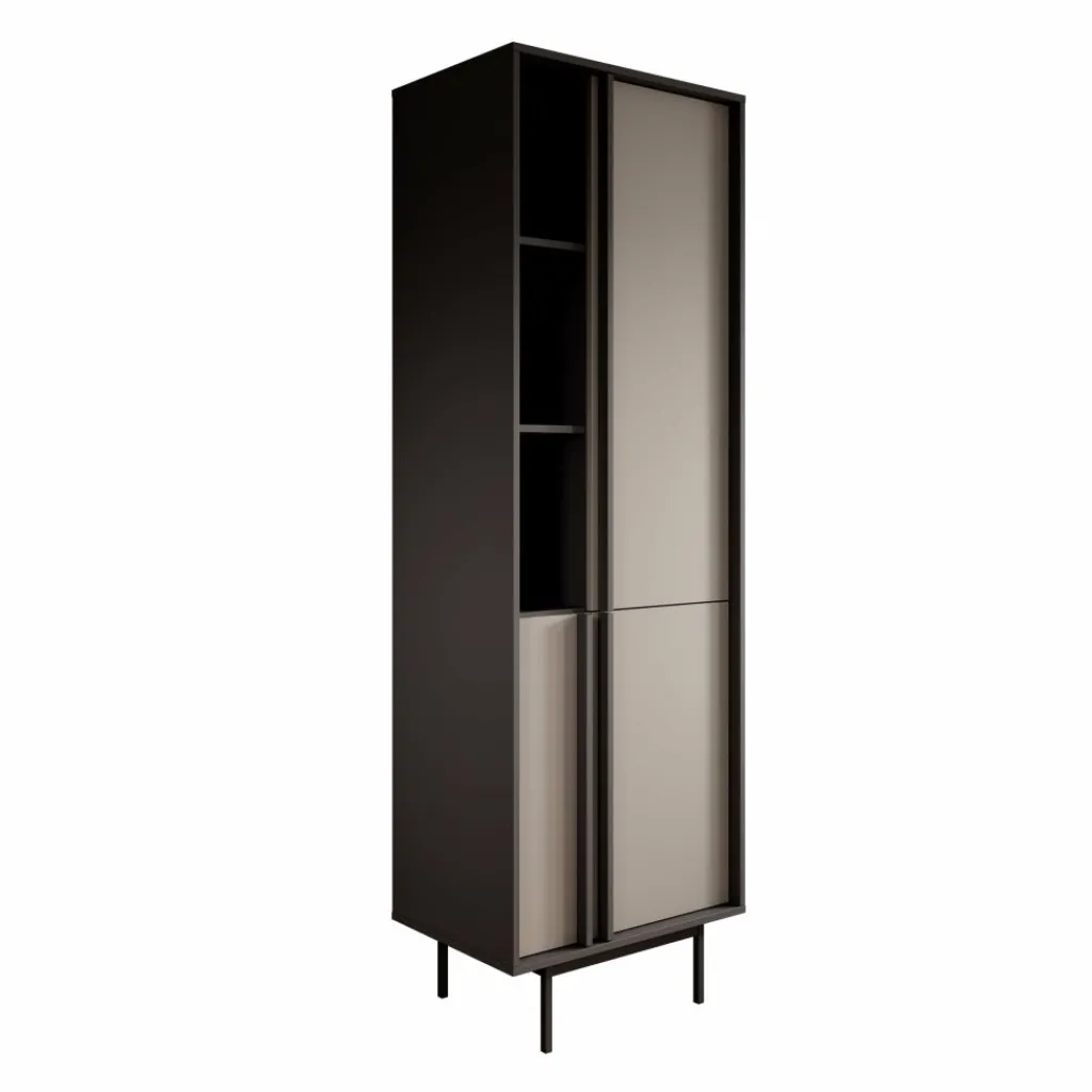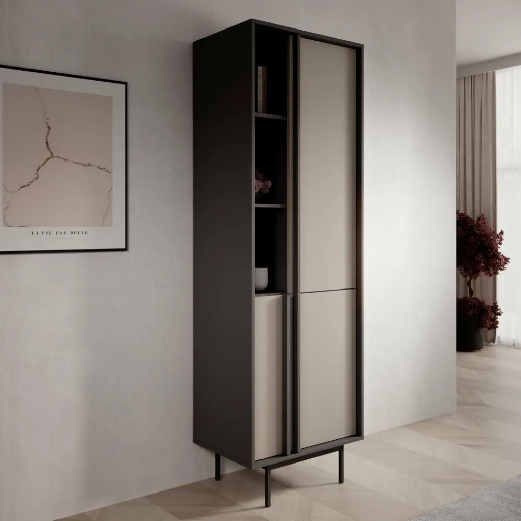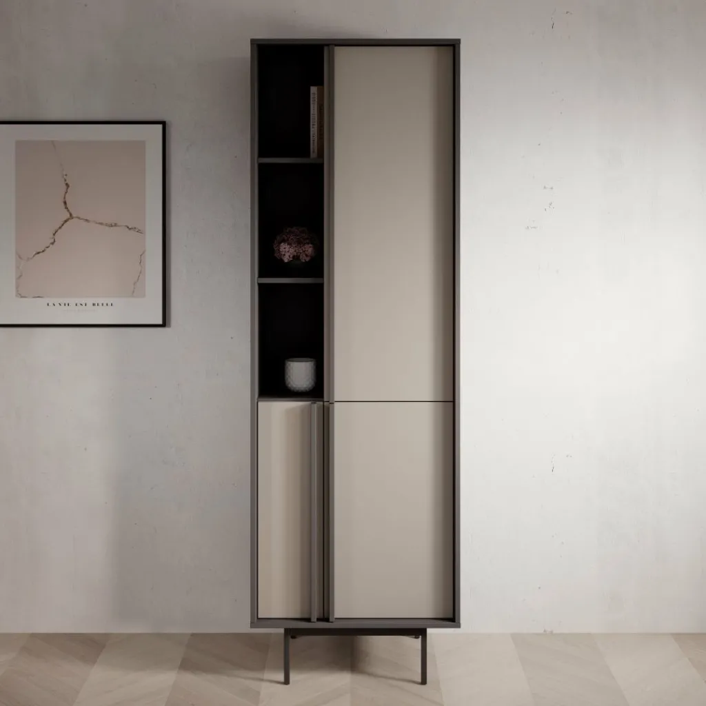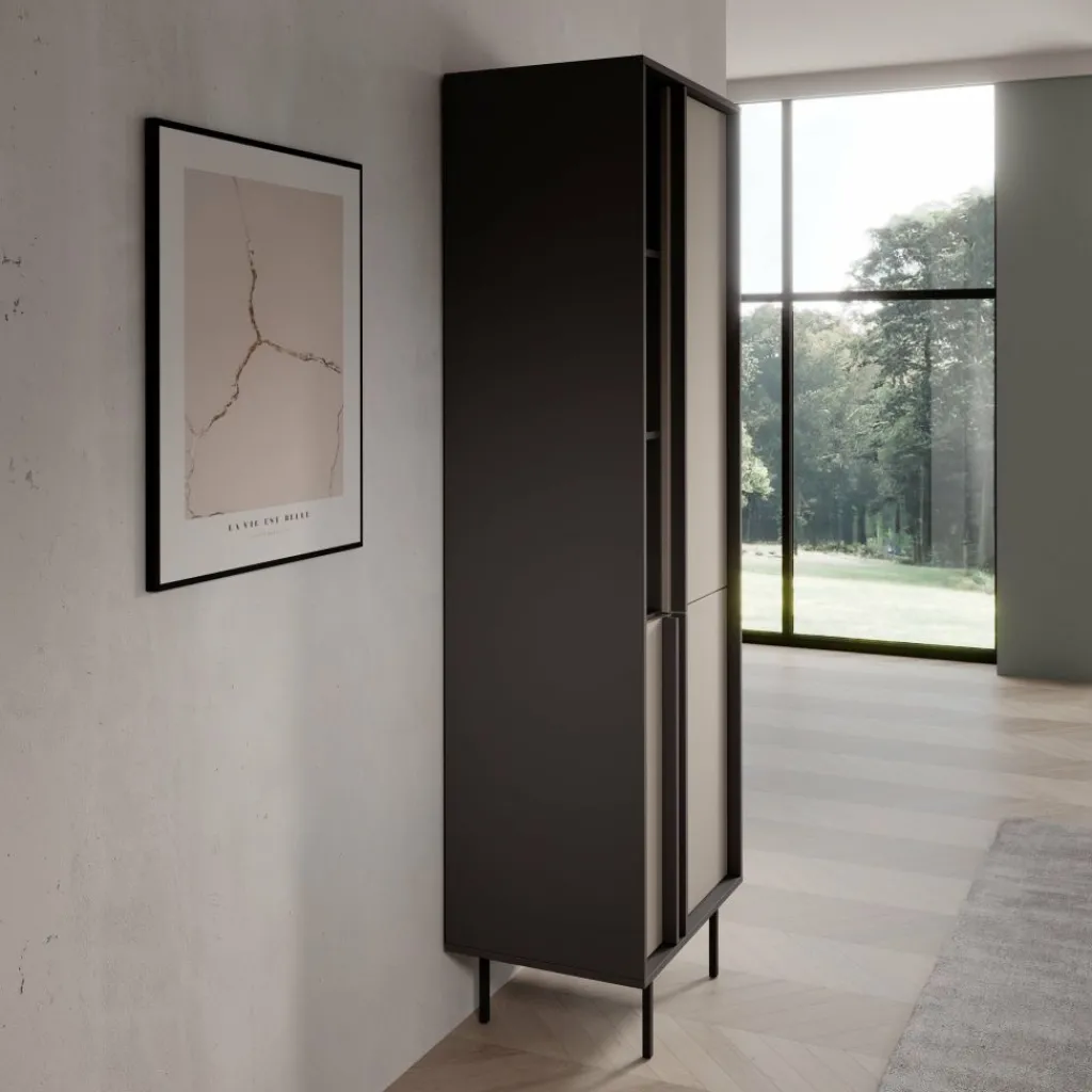 De beige fronten contrasteren mooi met het antracietkleurige frame, wat zorgt voor een eigentijdse uitstraling. De metalen poten geven de kast stabiliteit en een luchtige look. Een stijlvolle keuze die goed past in een modern of industrieel interieur.