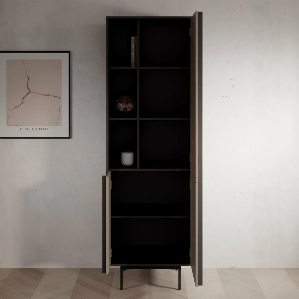 Boekenkast Antigo in beige en antraciet biedt een moderne oplossing voor het opbergen en uitstallen van boeken en decoratie. De open vakken aan de zijkant geven ruimte aan accessoires, terwijl de gesloten kastdeuren zorgen voor een opgeruimd geheel.