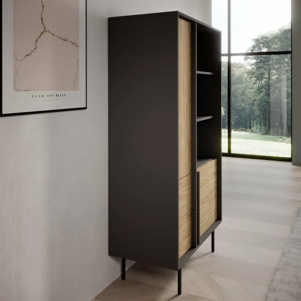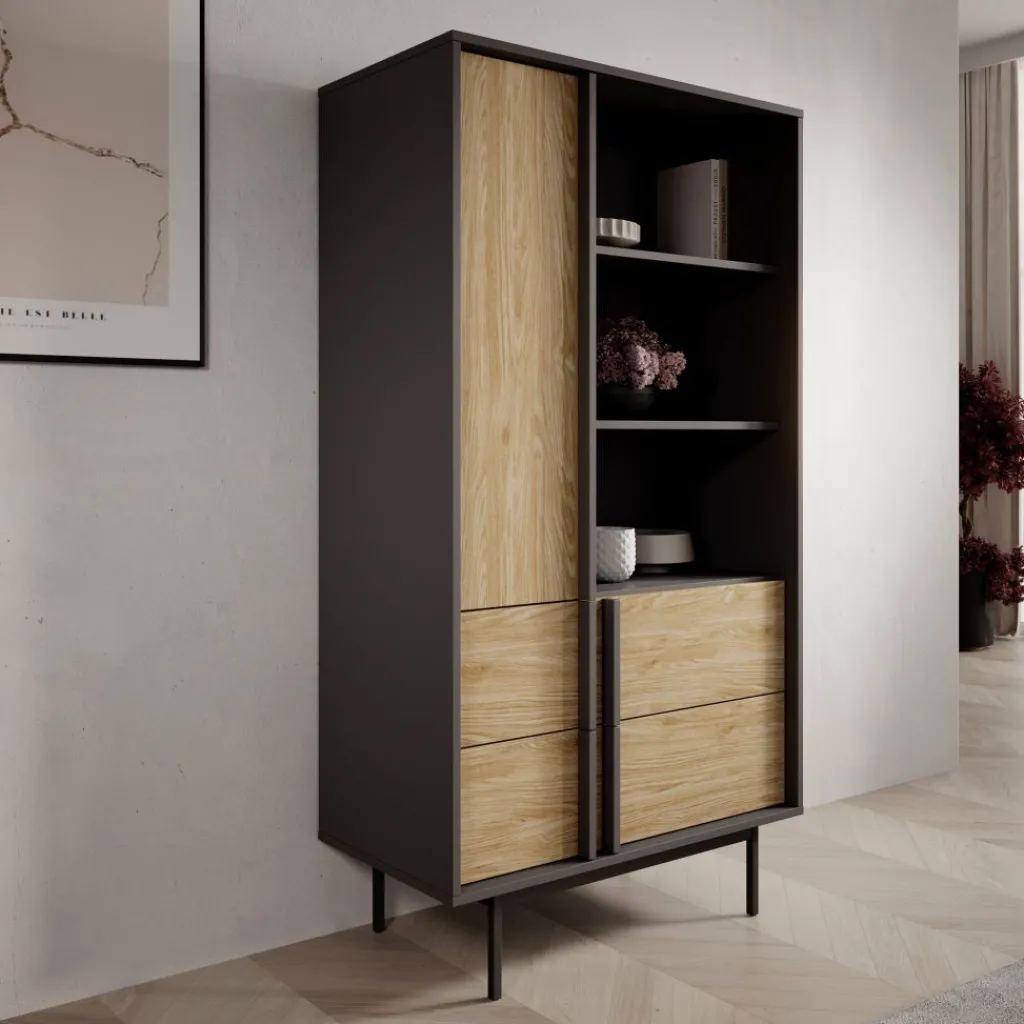 De eiken fronten brengen een warme, natuurlijke toon in het interieur, terwijl het antracietkleurige frame zorgt voor een modern contrast. Dankzij de metalen poten staat de kast stevig en krijgt het geheel een lichte, stijlvolle uitstraling. Perfect voor in de woonkamer of werkkamer.