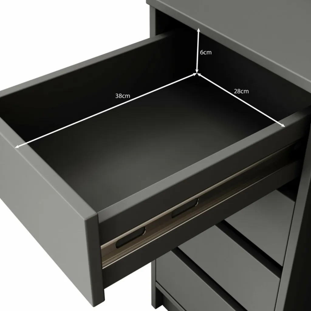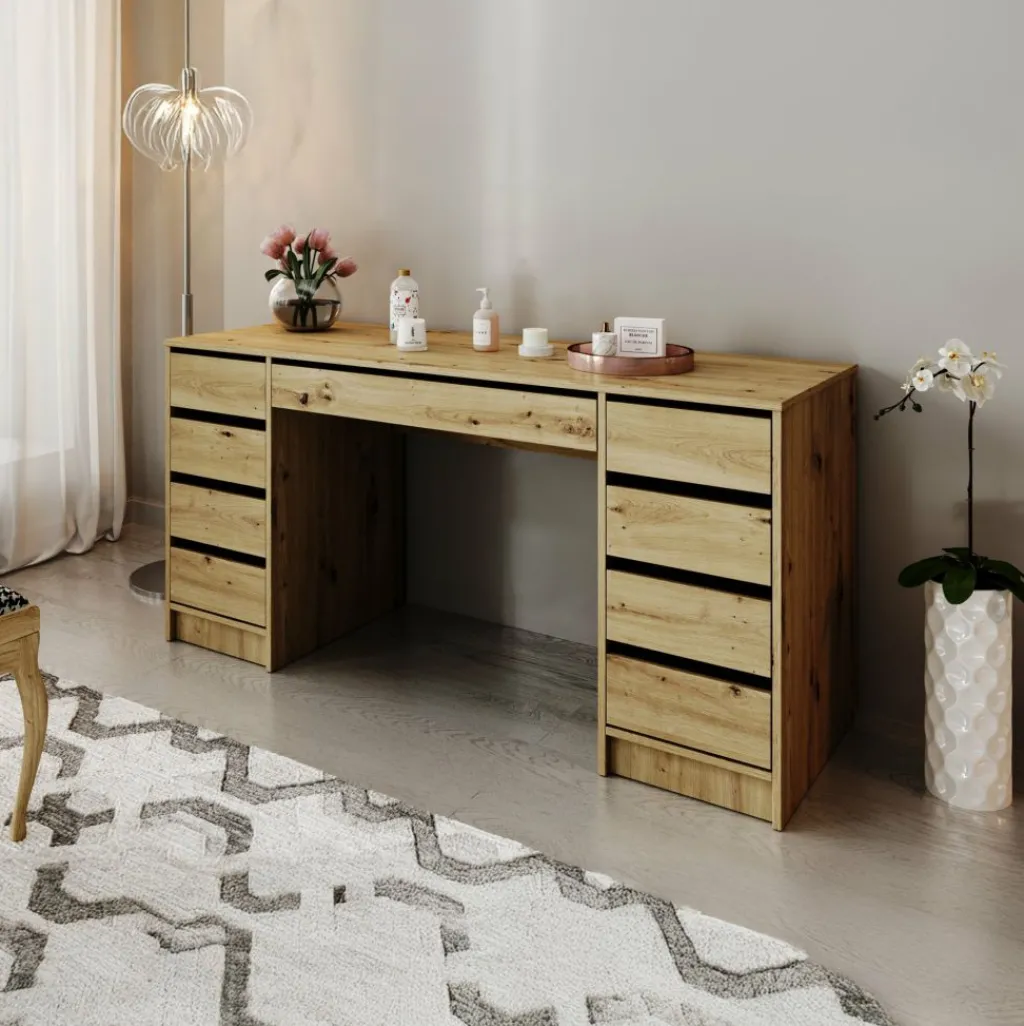 Deze kaptafel is gemaakt van stevig spaanplaat en afgewerkt in een moderne eiken kleur, waardoor hij perfect past in zowel strakke als industriële interieurs. De greeploze push to open lades zijn eenvoudig te openen en sluiten, en de brede middenlade is ideaal voor de spullen die je dagelijks gebruikt.