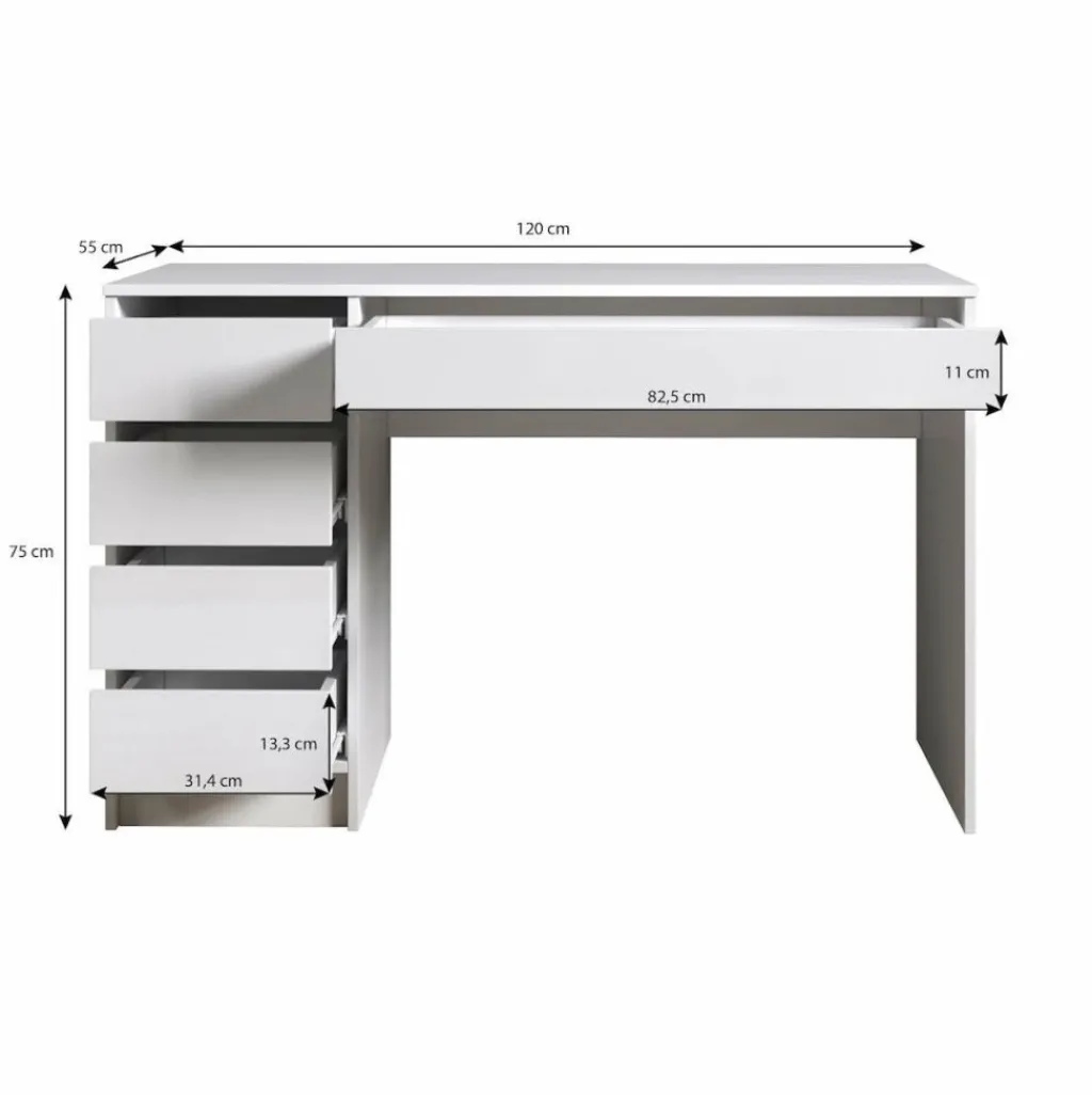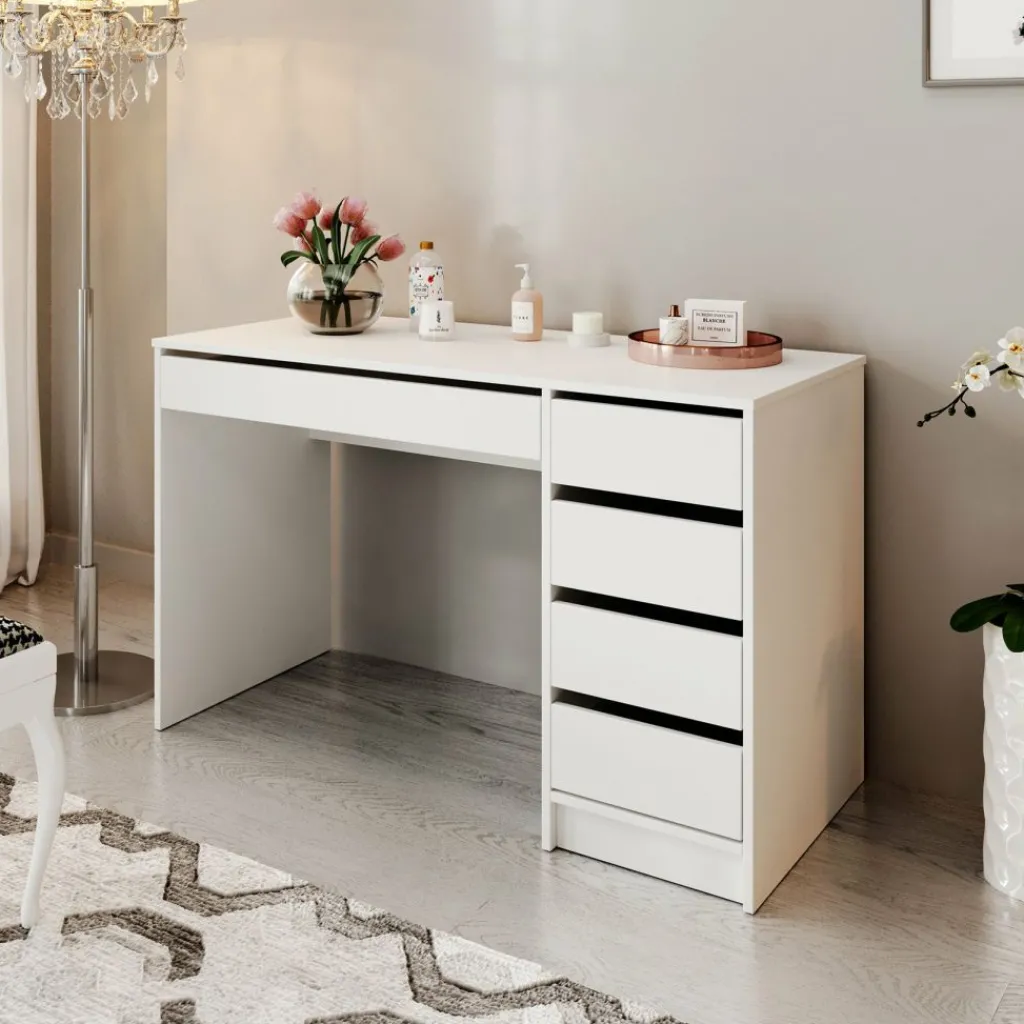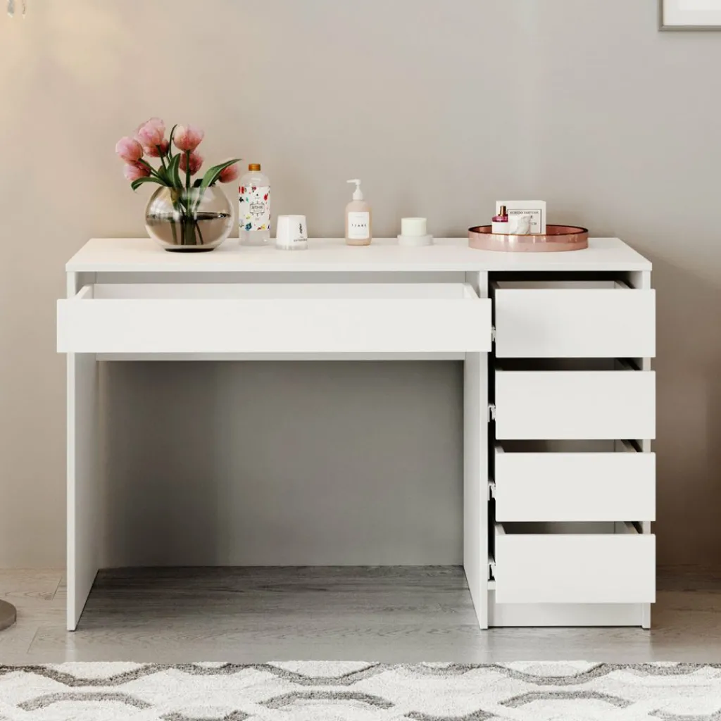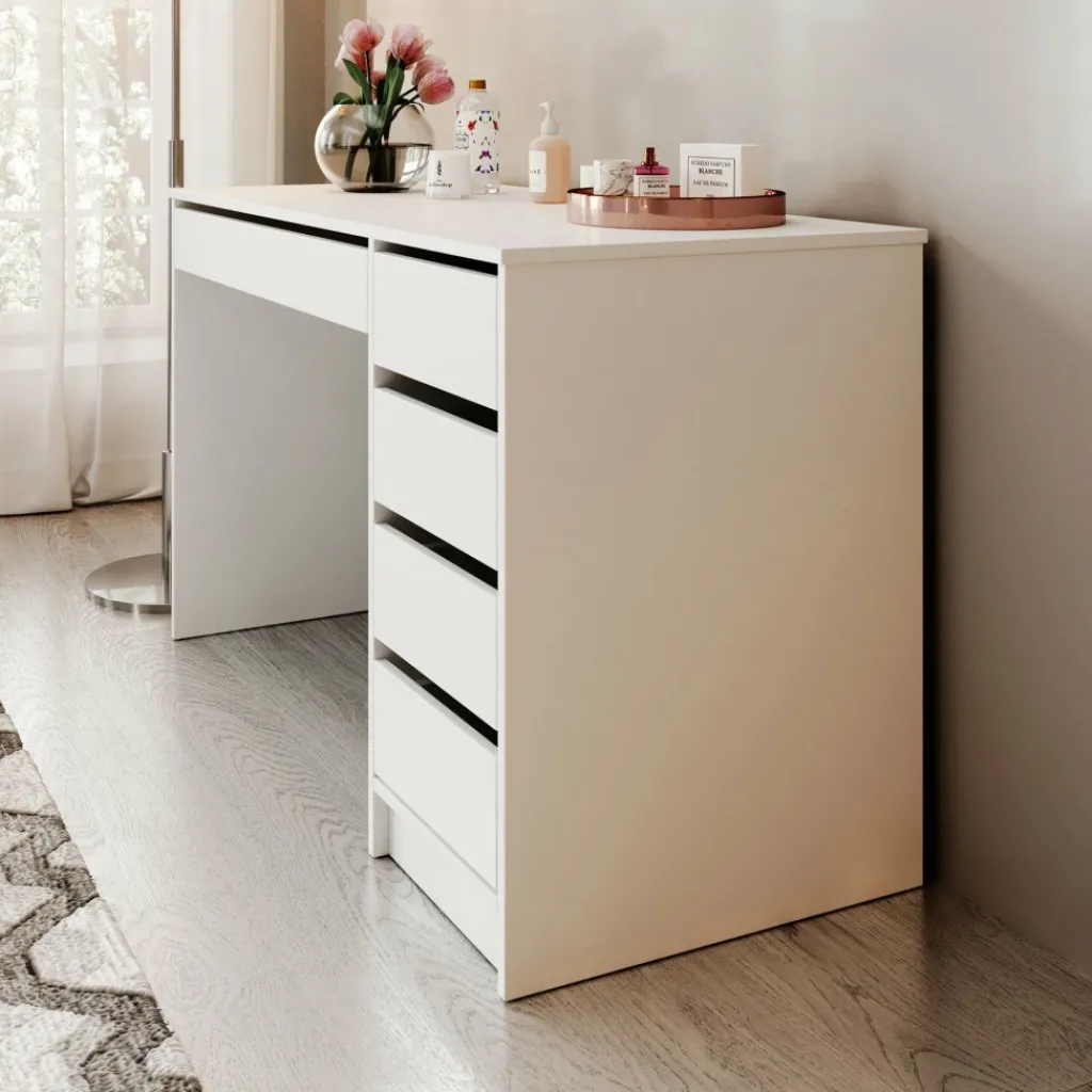 Kaptafel Arco is een kaptafel met voldoende opbergmogelijkheden. Dit meubel is uitgevoerd in een witte kleur. De make-up tafel Arco beschikt over een werkblad van 120 centimeter breed en 4 ruime lades. Onder het blad zit een handige uitschuifbare plank. Er is voldoende ruimte om make-up, accessoires en sieraden op te bergen. De lades van deze kaptafel zijn zowel links als rechts te monteren.