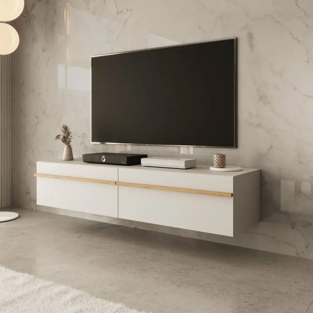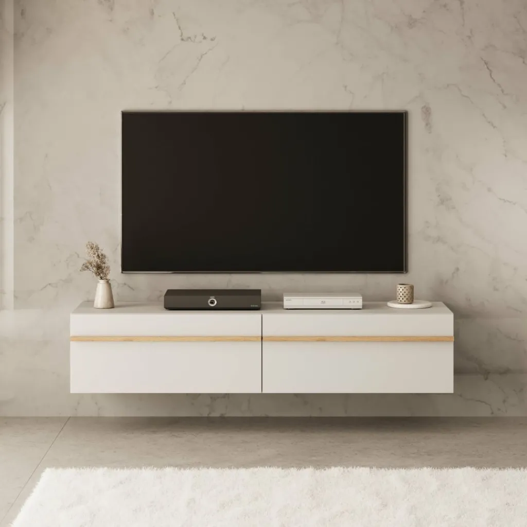 Achter de twee kleppen vind je twee ruime opbergvakken. Ideaal voor het opbergen van apparatuur, afstandsbedieningen of andere spullen die je graag uit het zicht houdt. Doordat het meubel aan de muur hangt, blijft de vloer vrij – dat oogt ruimtelijk en is makkelijk bij het schoonmaken.