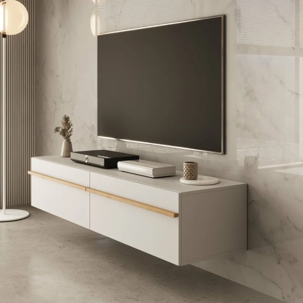 Strak, modern en praktisch: TV-Meubel Arda is een stijlvol hangend meubel in een zachte beige kleur met warme houtaccenten. De brede, eiken kleurige handgrepen geven het meubel karakter en maken het openen van de kleppen eenvoudig.