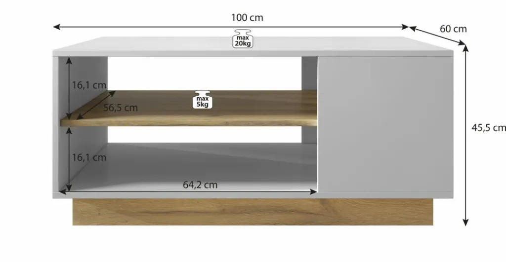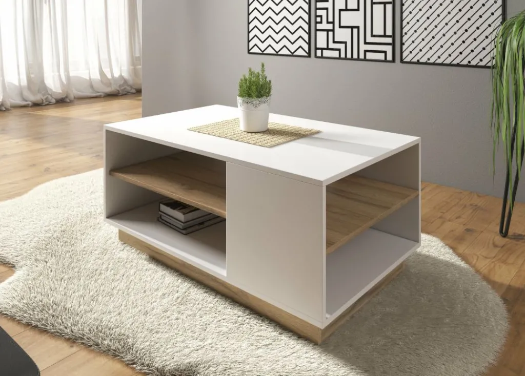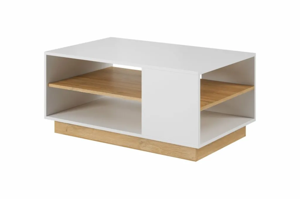 Salontafel Ashley is een salontafel met een moderne uitstraling. De tafel is gemaakt in een witte kleur en staat op een eiken kleurig onderstel. In het midden van de salontafel is een extra eikenkleurige plank geplaatst, zodat er opbergruimte ontstaat. Handig voor tijdschriften of afstandsbedieningen. Het blad heeft een lengte van 100 cm.