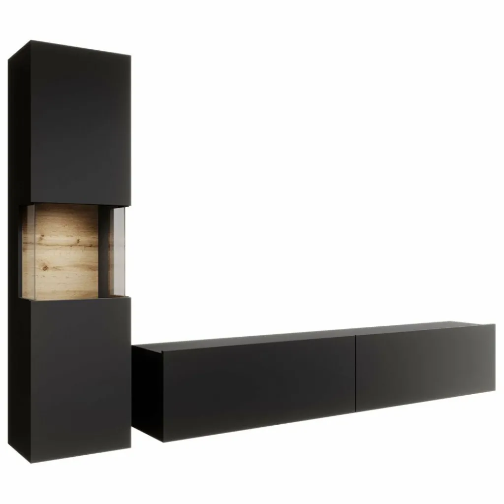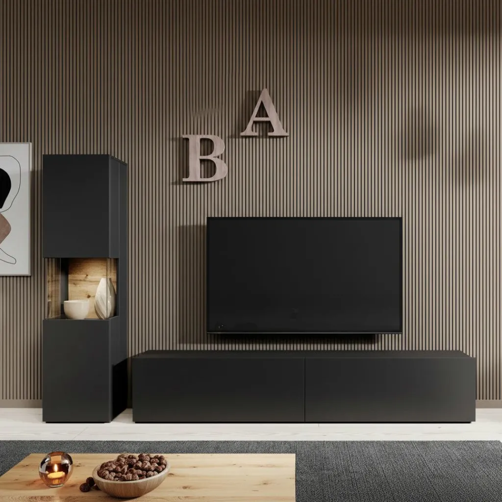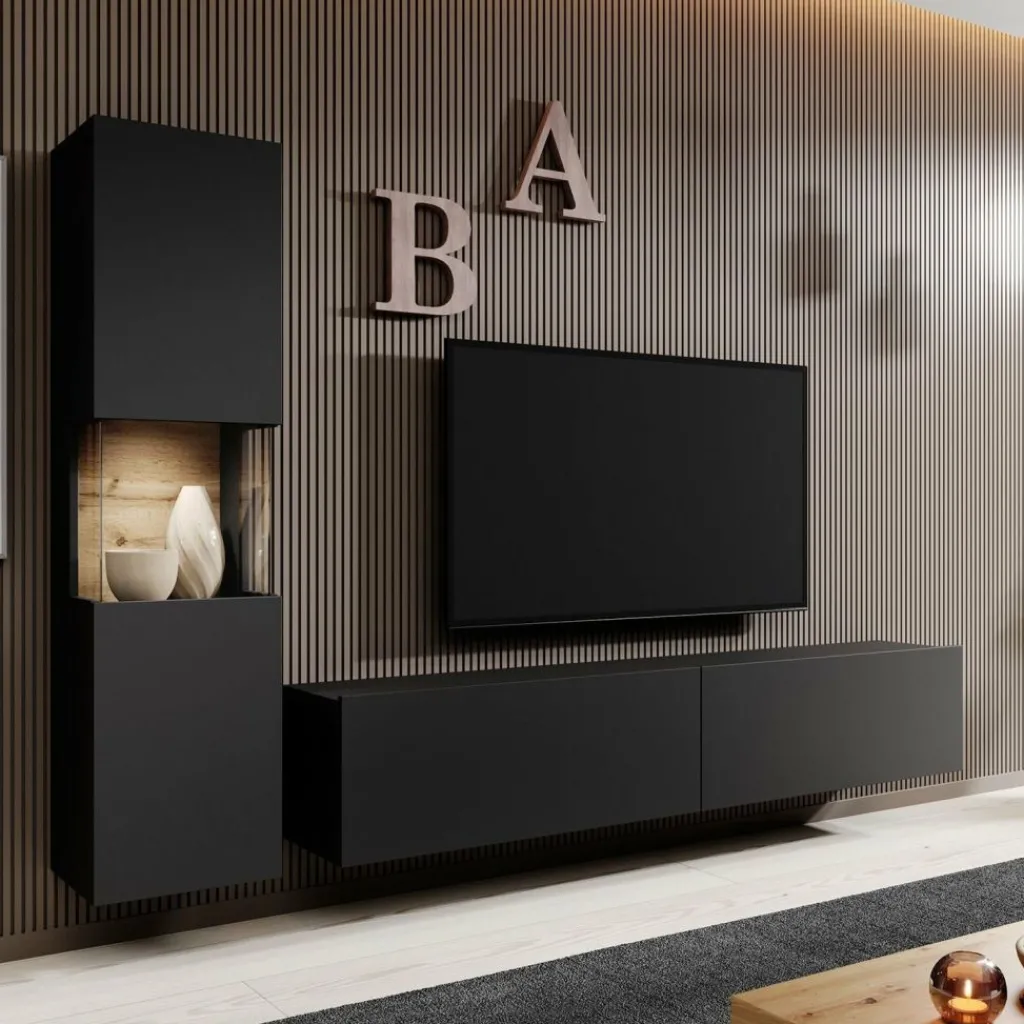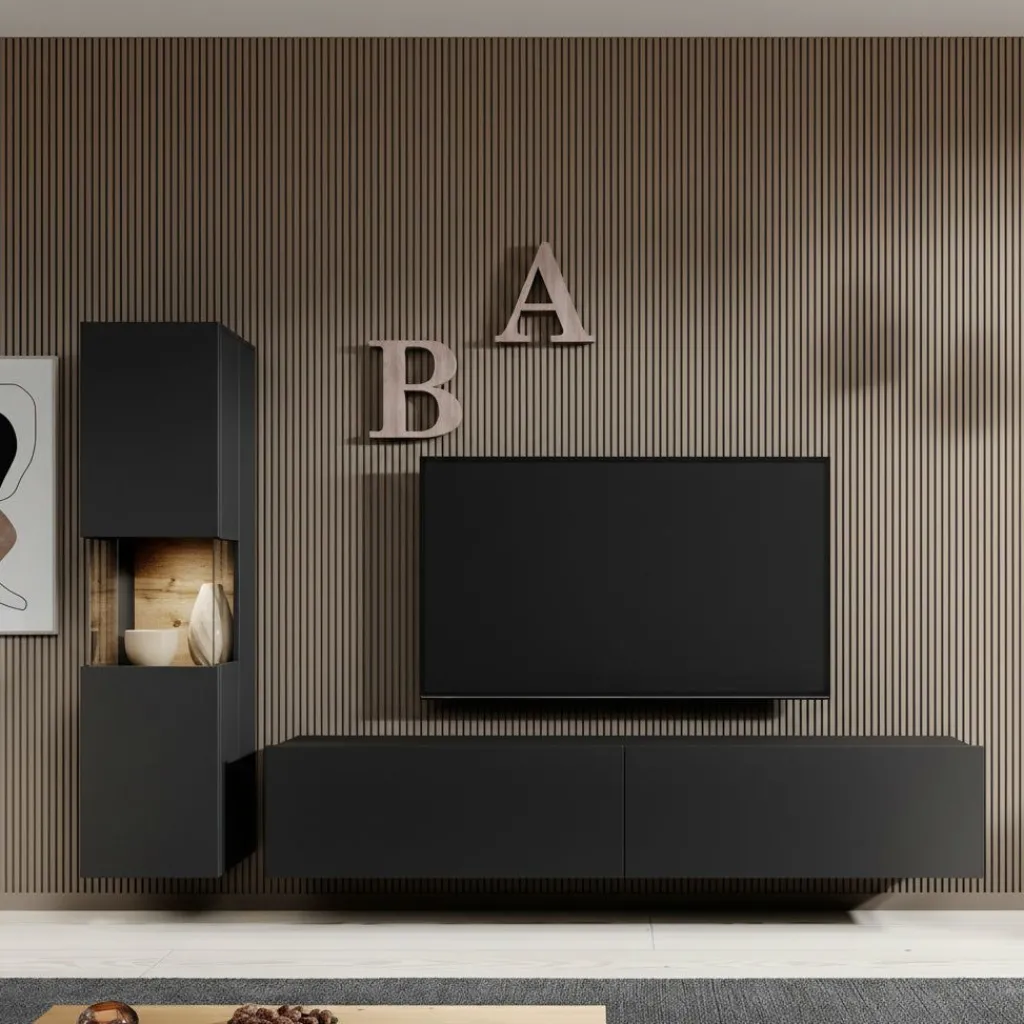 Wandmeubel Asilento 1 is een set van 2 meubels met ruime opbergmogelijkheden, uitgevoerd in spaanplaat met een imitatieprint (melamine coating) in mat zwarte kleur. De set bestaat uit een tv-meubel en een opbergkast. Deze meubels kunnen gezamenlijk in dezelfde ruimte geplaatst worden, maar natuurlijk ook individueel in verschillende ruimtes. Door zijn strakke uitstraling is dit meubel perfect passend in een modern interieur.