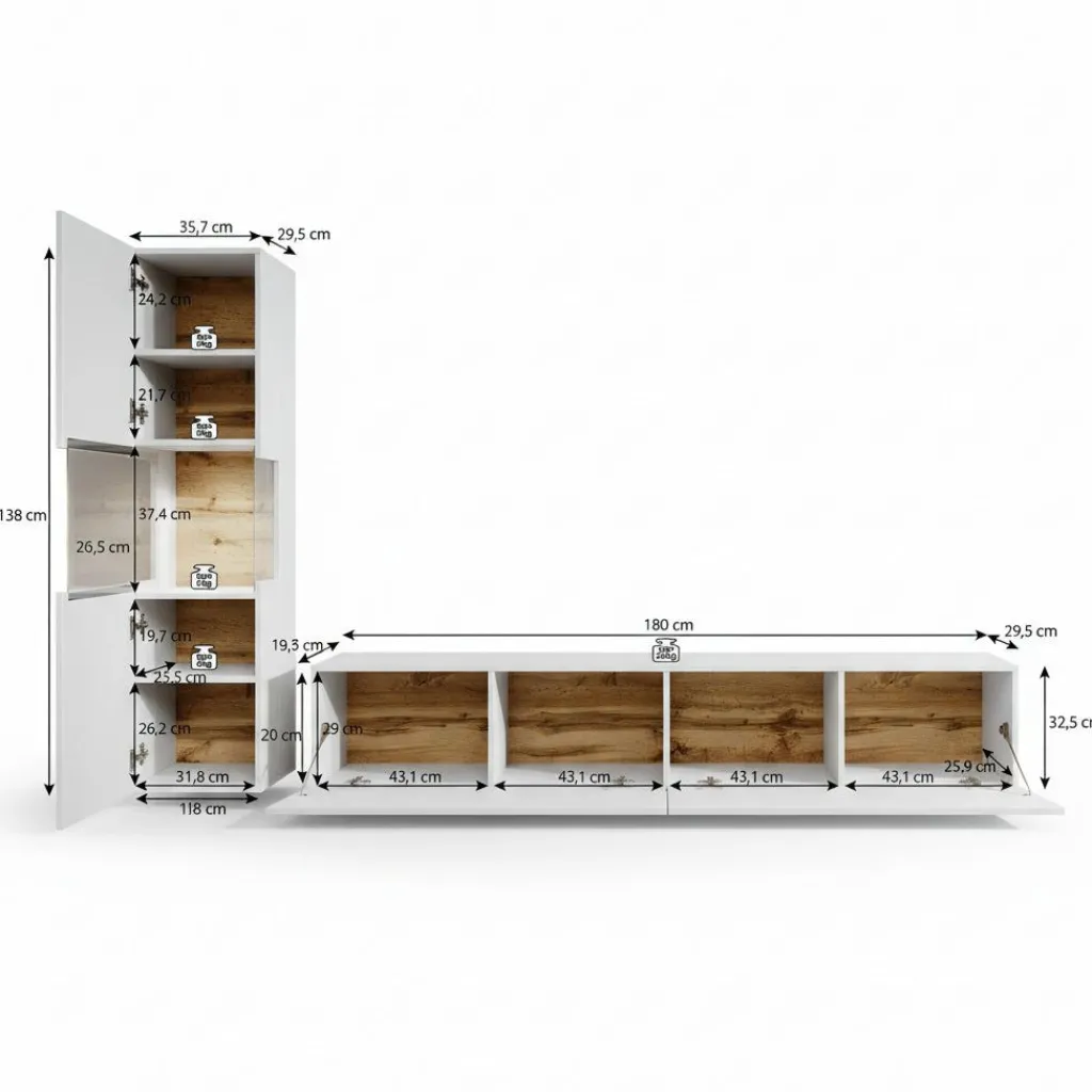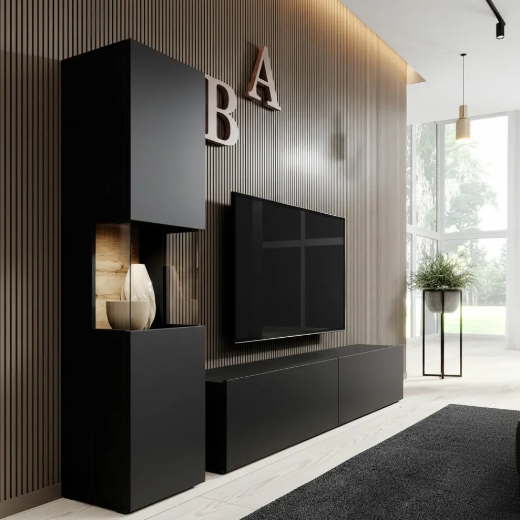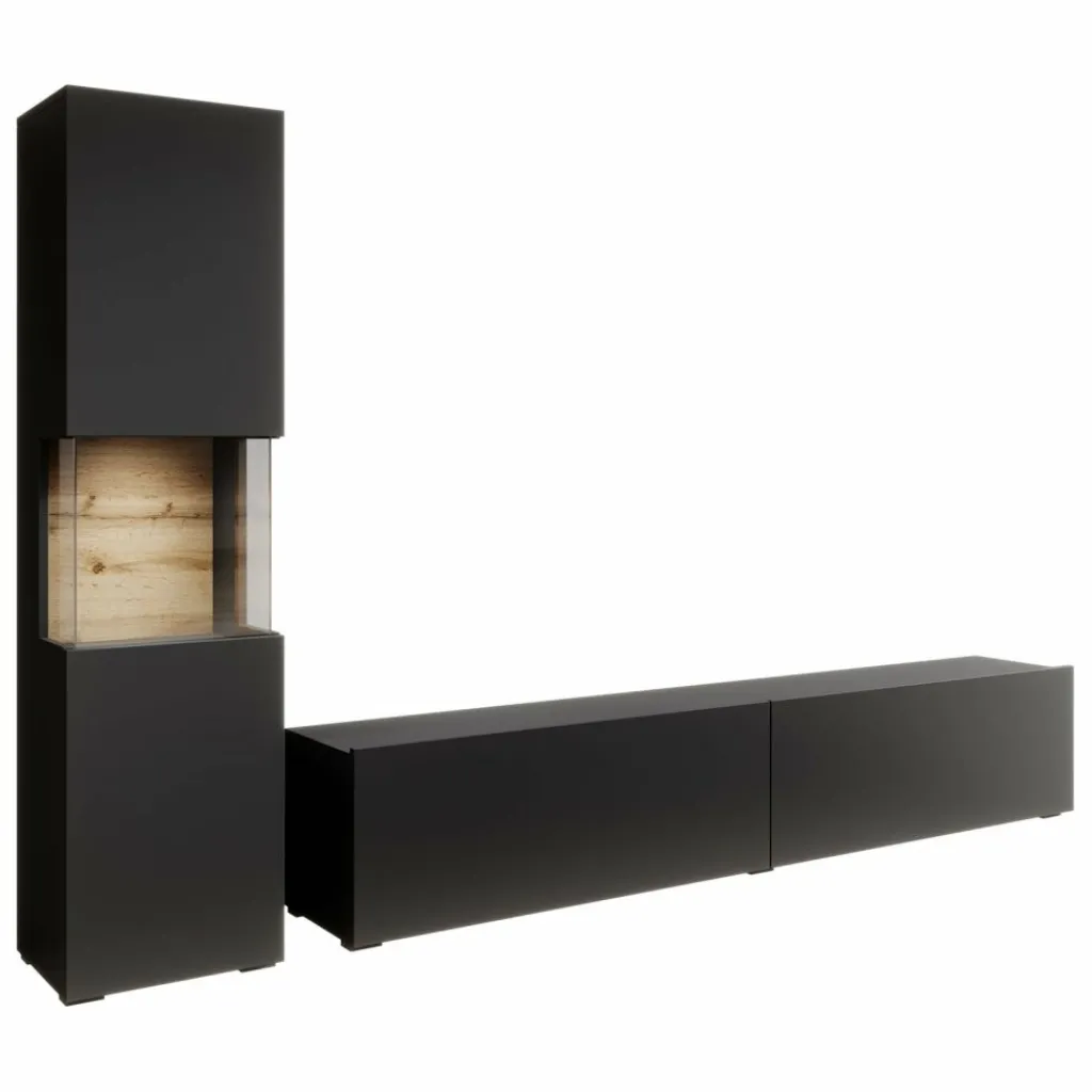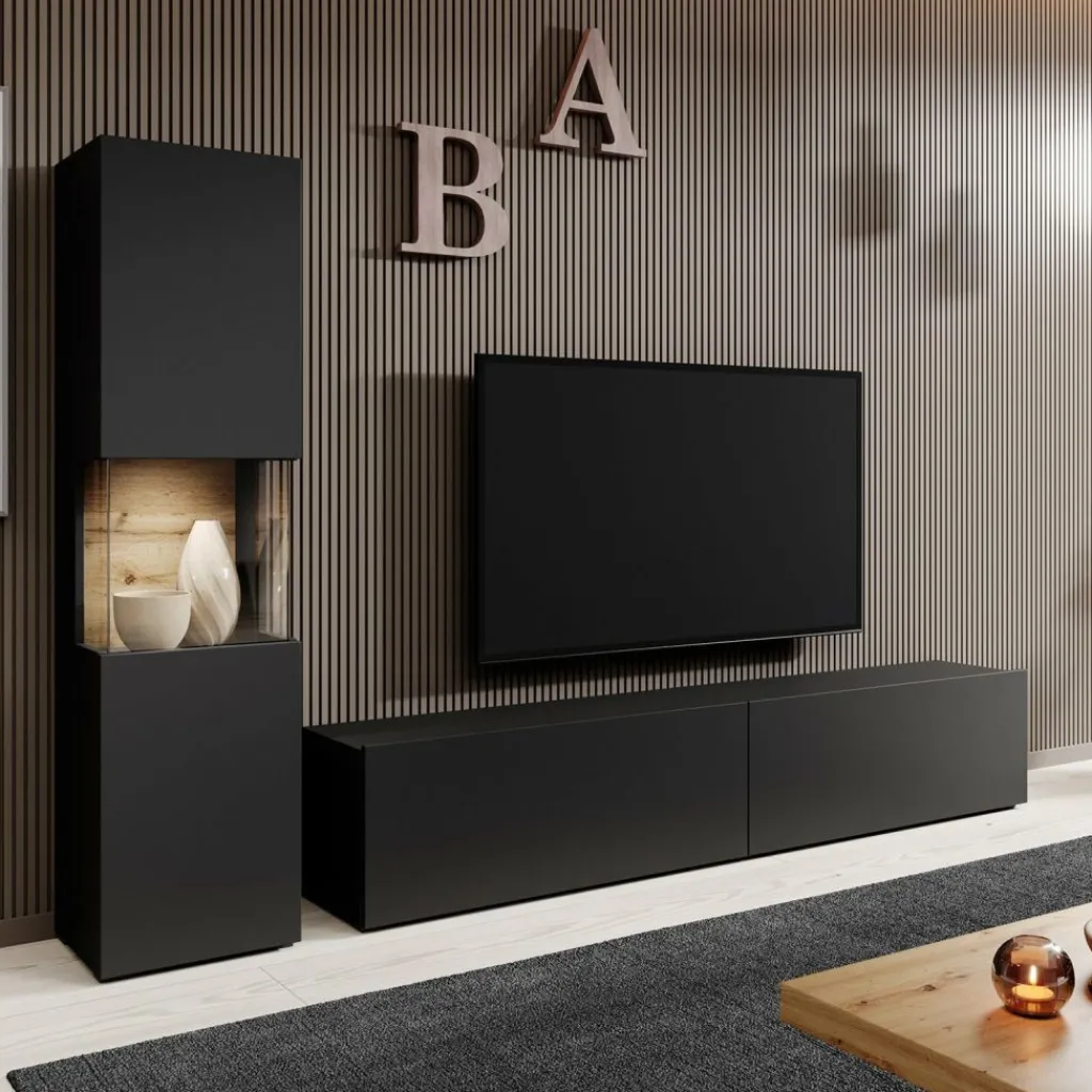 Wandmeubel Asilento 1 is een set van 2 meubels met ruime opbergmogelijkheden, uitgevoerd in spaanplaat met een imitatieprint (melamine coating) in mat zwarte kleur. De set bestaat uit een tv-meubel en een opbergkast. Deze meubels kunnen gezamenlijk in dezelfde ruimte geplaatst worden, maar natuurlijk ook individueel in verschillende ruimtes. Door zijn strakke uitstraling is dit meubel perfect passend in een modern interieur.