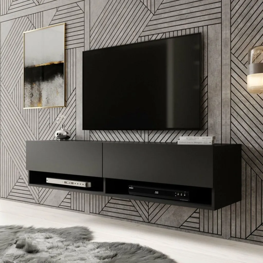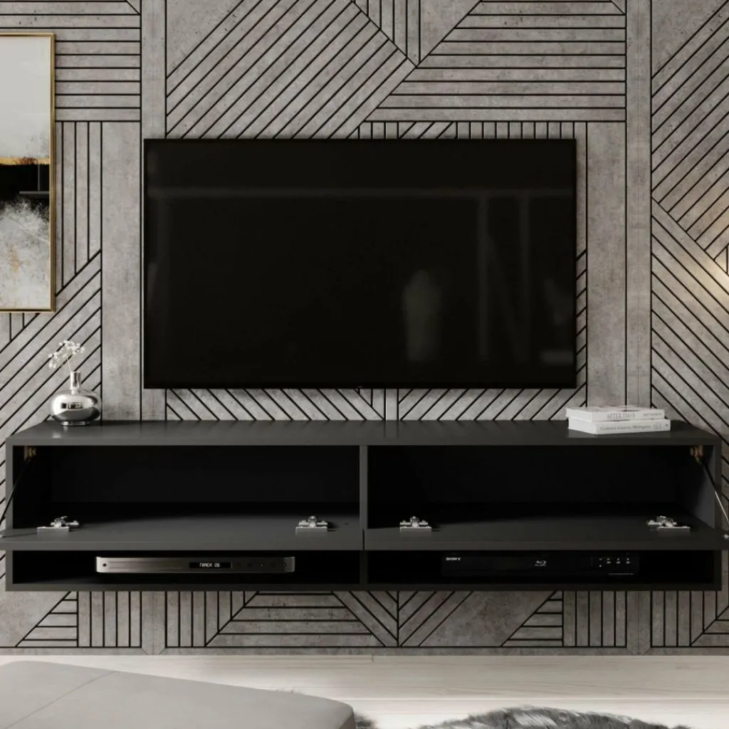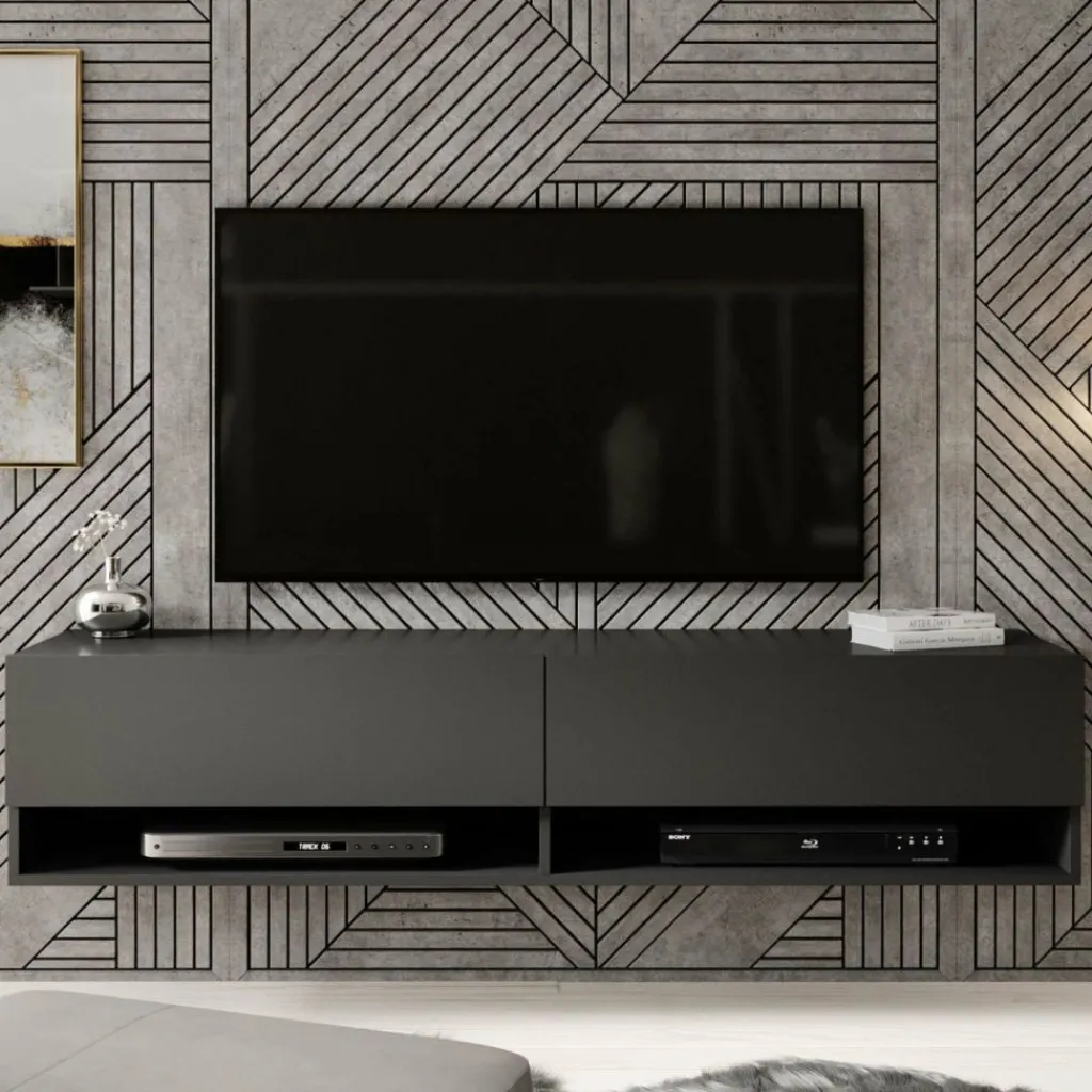 Het tv-meubel Asino is aan de muur op te hangen. Toch liever een staand model? Dat kan ook, door eenvoudig de bijgeleverde pootjes te monteren onder het meubel. De pootjes zijn zilverkleurig, gemaakt van kunststof en hebben een hoogte van 2 cm.