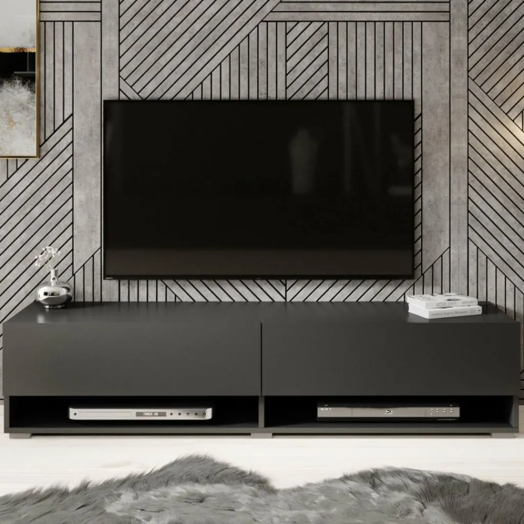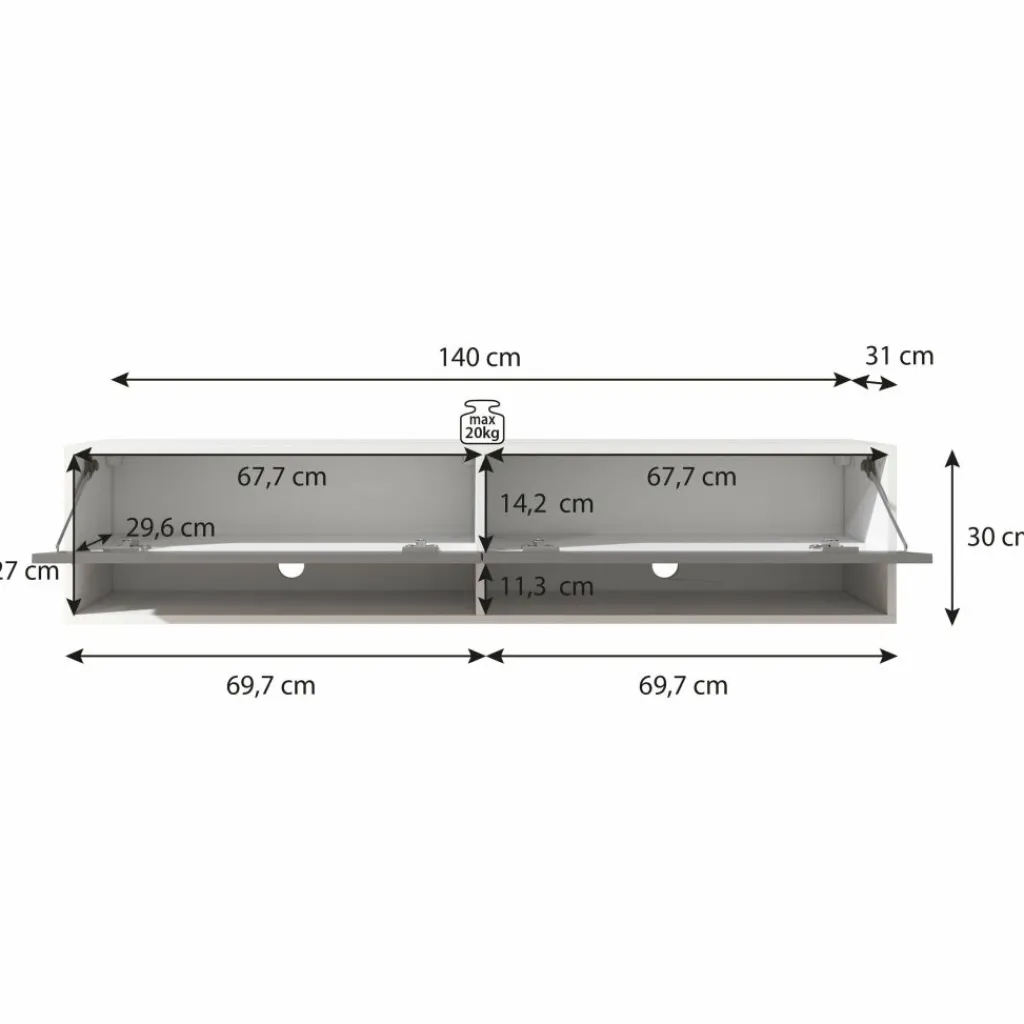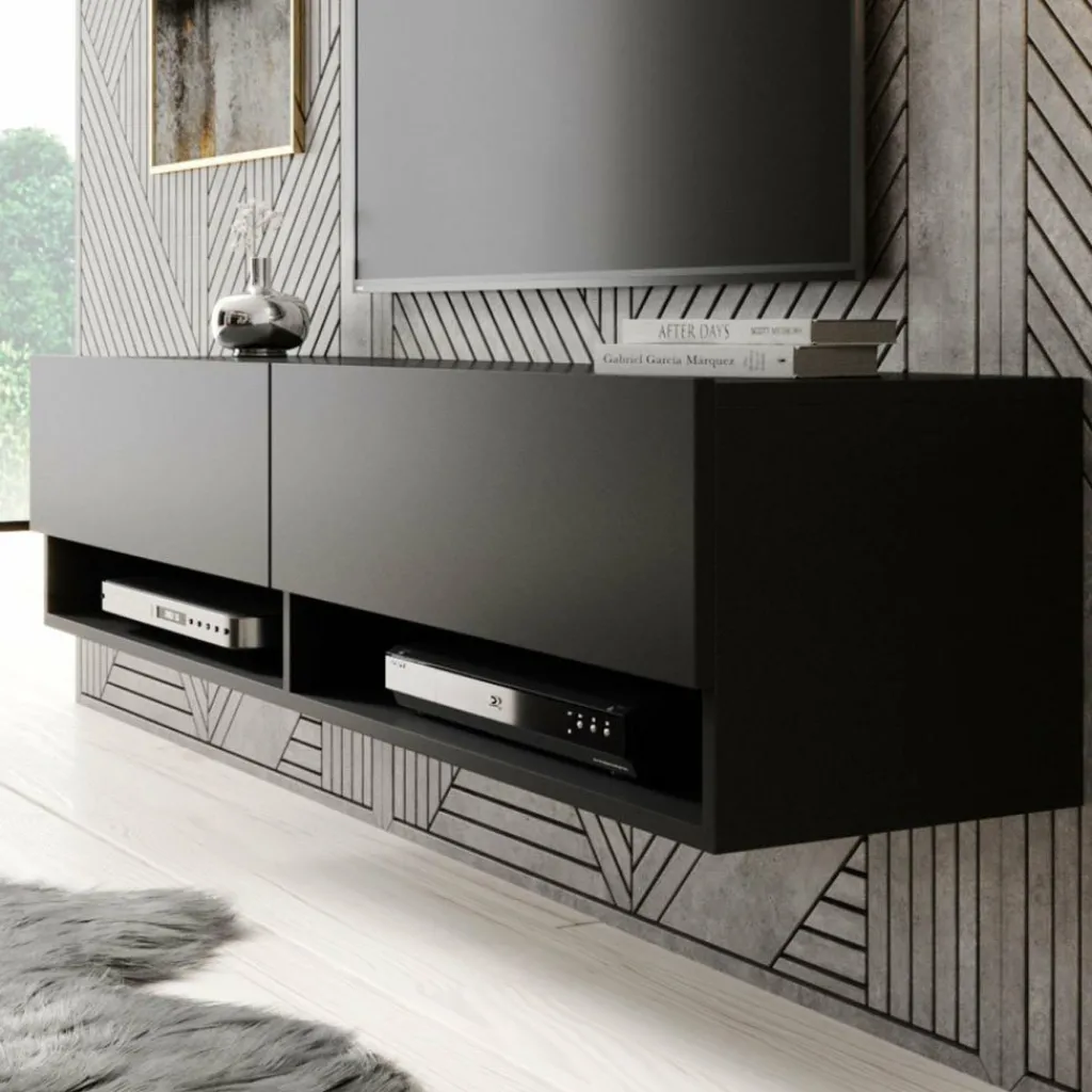 Het tv-meubel Asino is aan de muur op te hangen. Toch liever een staand model? Dat kan ook, door eenvoudig de bijgeleverde pootjes te monteren onder het meubel. De pootjes zijn zilverkleurig, gemaakt van kunststof en hebben een hoogte van 2 cm.
