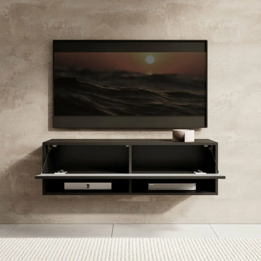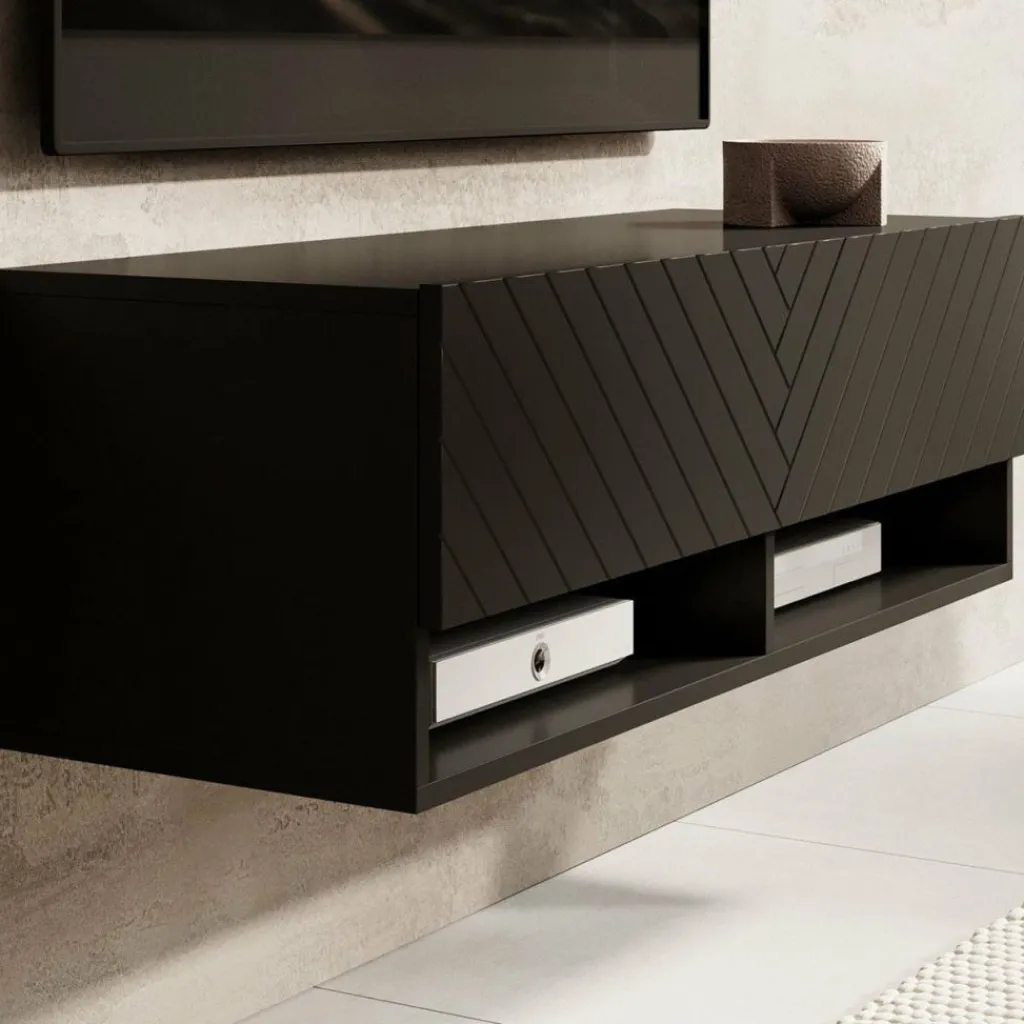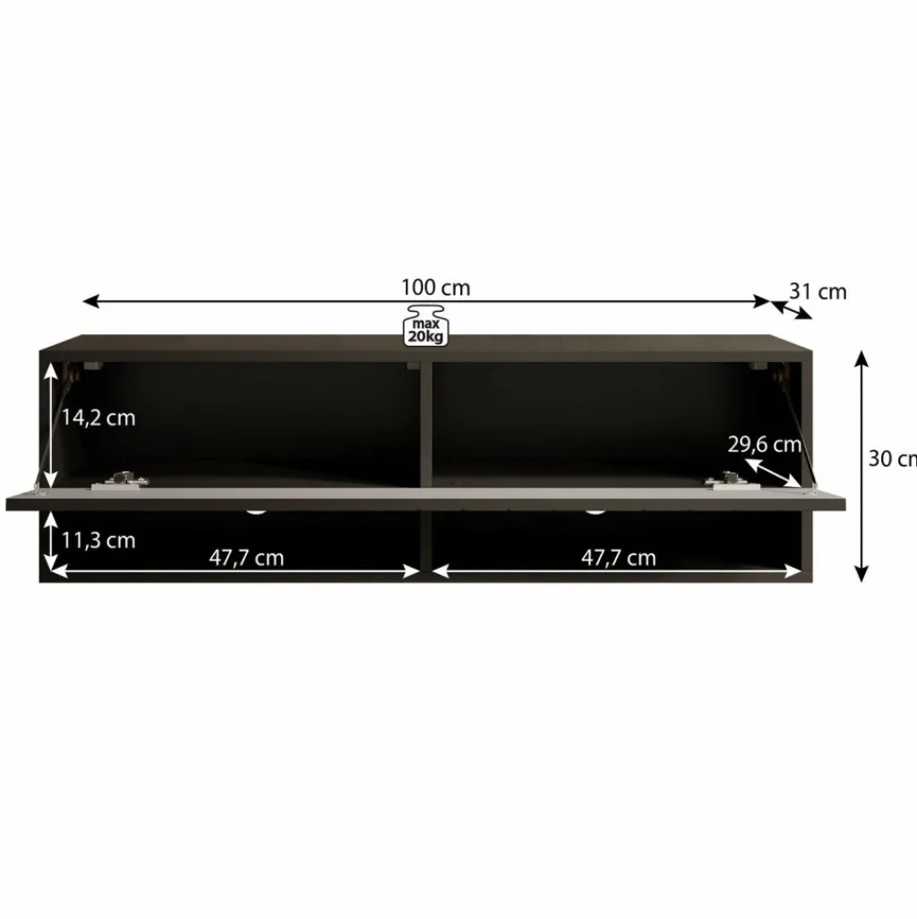 Het tv-meubel Asino is aan de muur op te hangen. Toch liever een staand model? Dat kan ook, door eenvoudig de bijgeleverde pootjes te monteren onder het meubel. De pootjes zijn zilverkleurig, gemaakt van kunststof en hebben een hoogte van 2 cm.