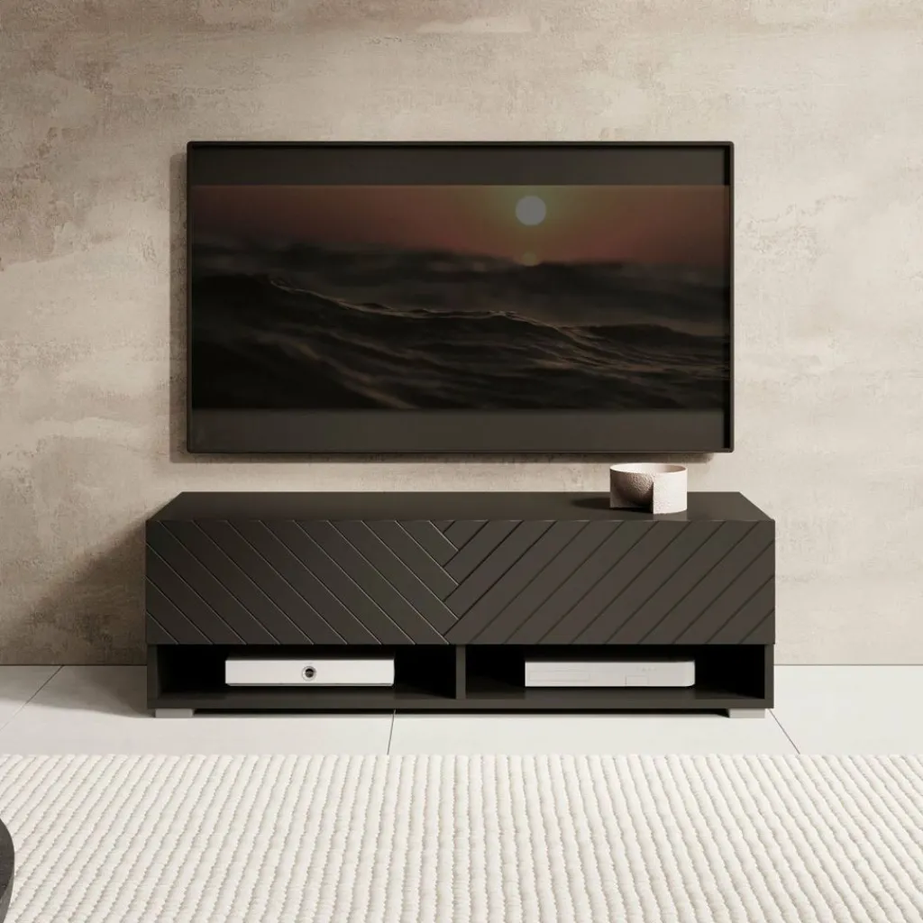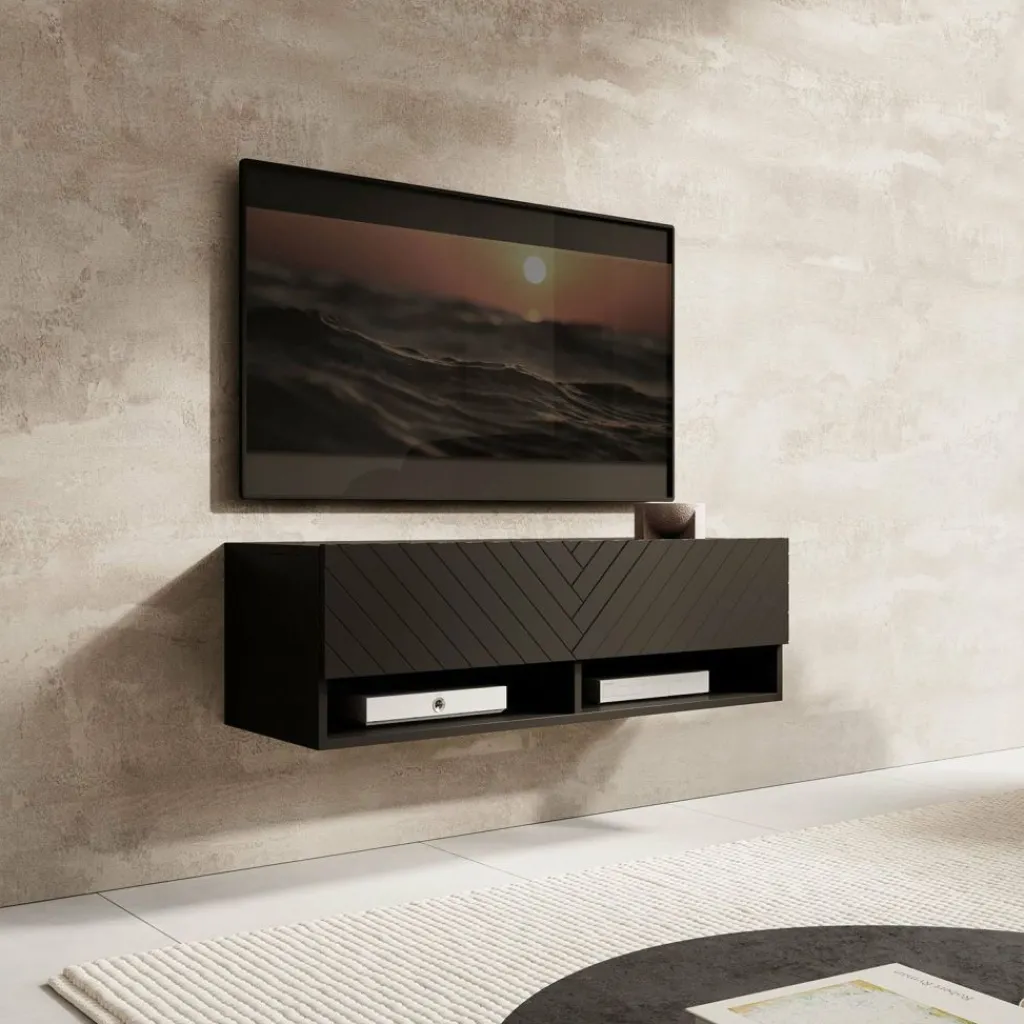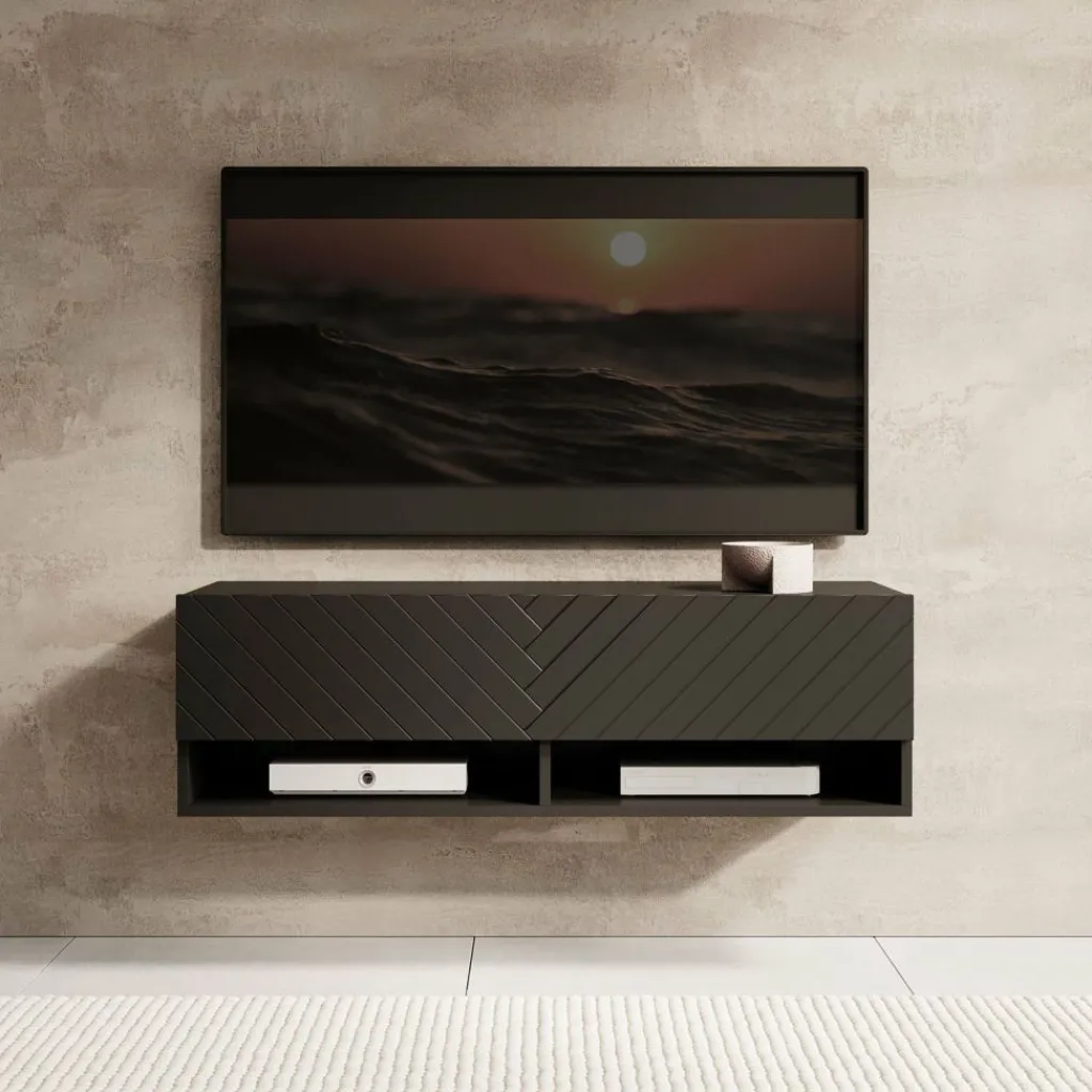 Het tv-meubel Asino is aan de muur op te hangen. Toch liever een staand model? Dat kan ook, door eenvoudig de bijgeleverde pootjes te monteren onder het meubel. De pootjes zijn zilverkleurig, gemaakt van kunststof en hebben een hoogte van 2 cm.