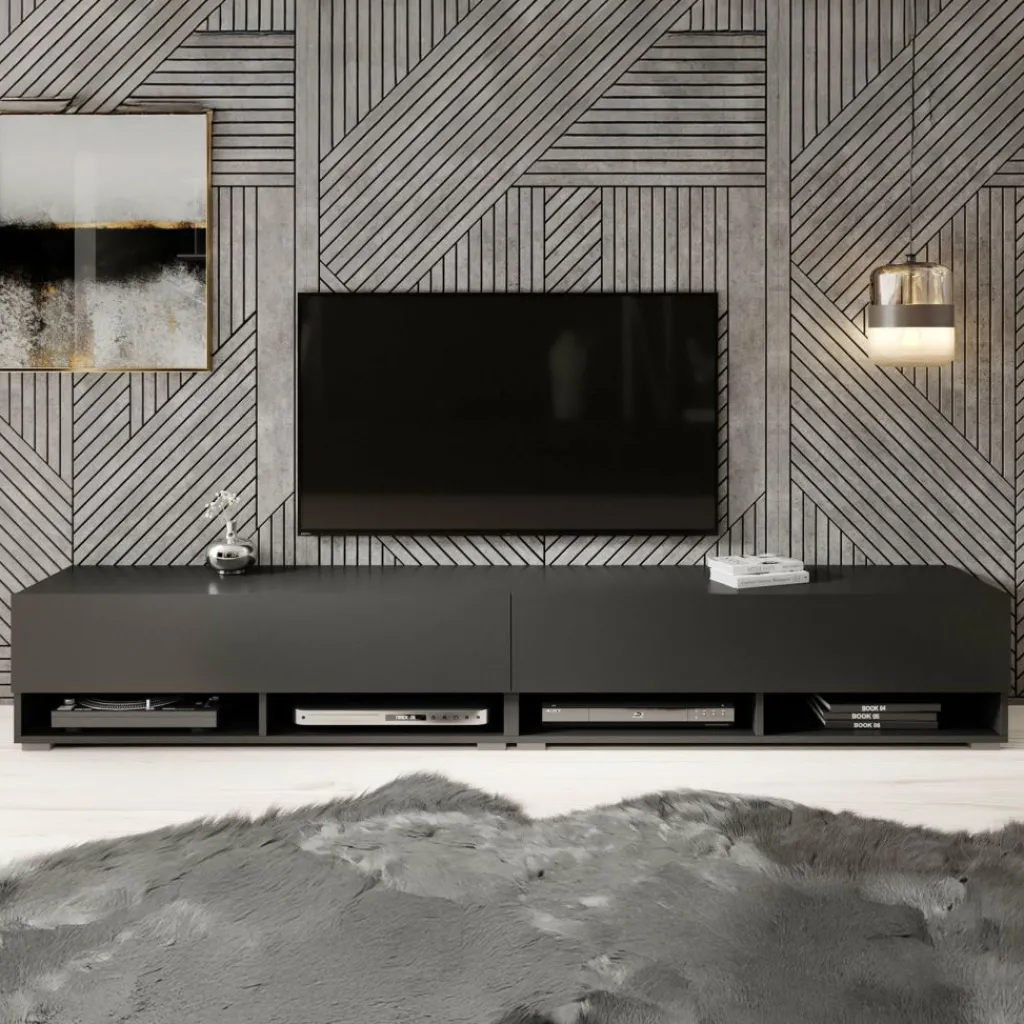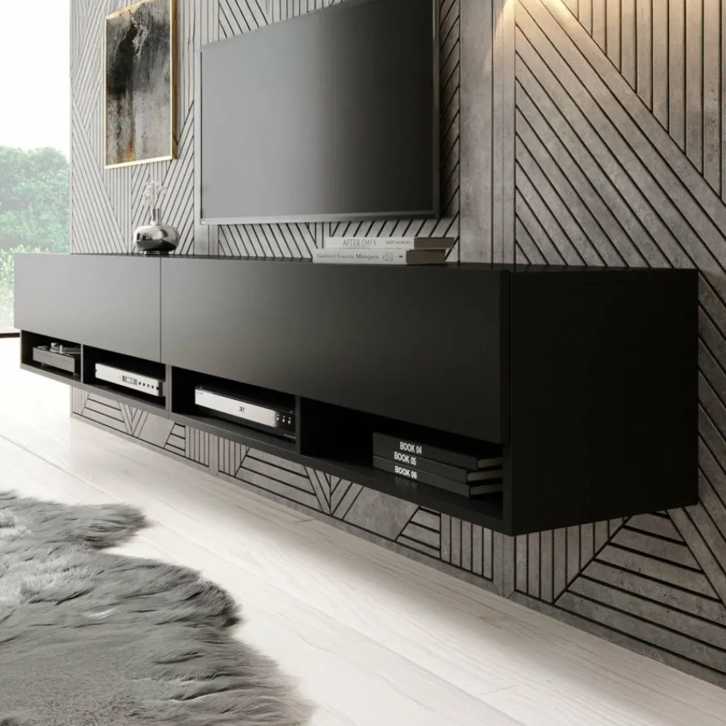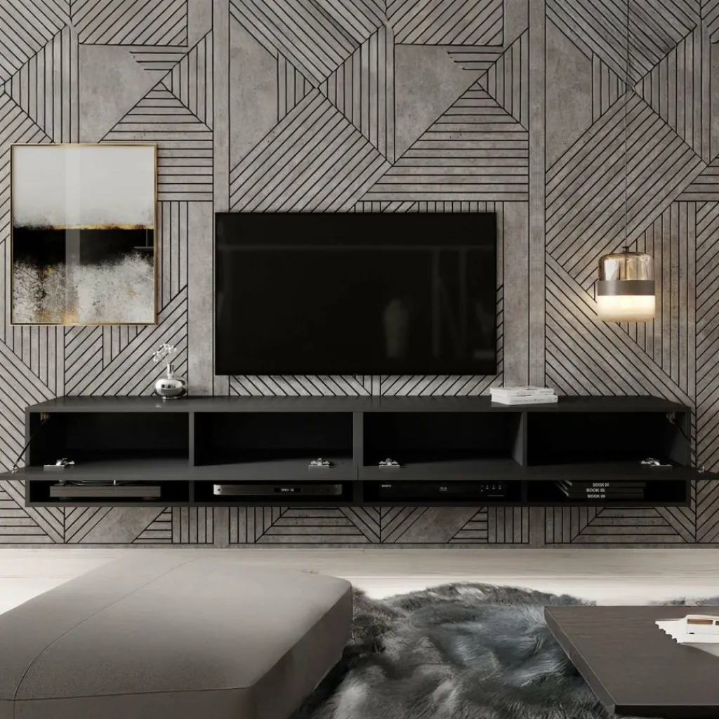Het tv-meubel Asino is aan de muur op te hangen. Toch liever een staand model? Dat kan ook, door eenvoudig de bijgeleverde pootjes te monteren onder het meubel. De pootjes zijn zilverkleurig, gemaakt van kunststof en hebben een hoogte van 2 cm.