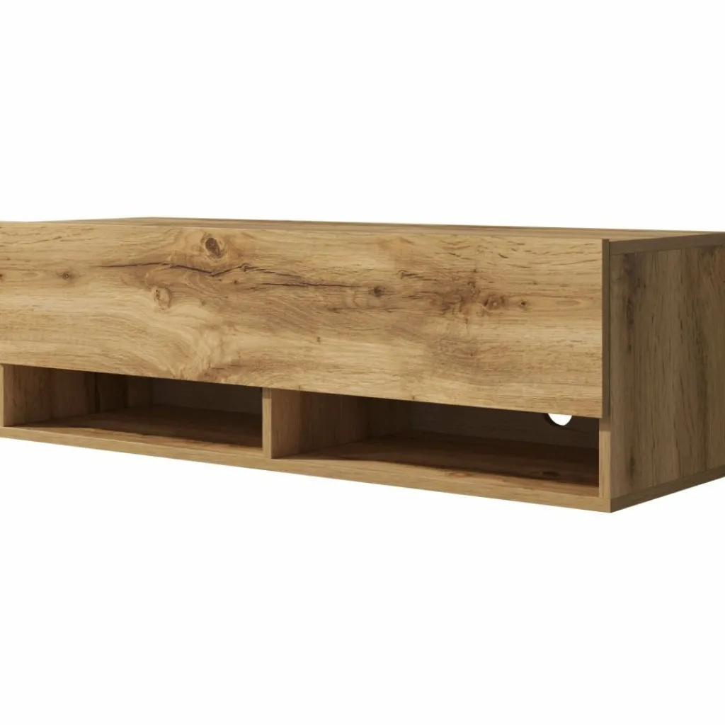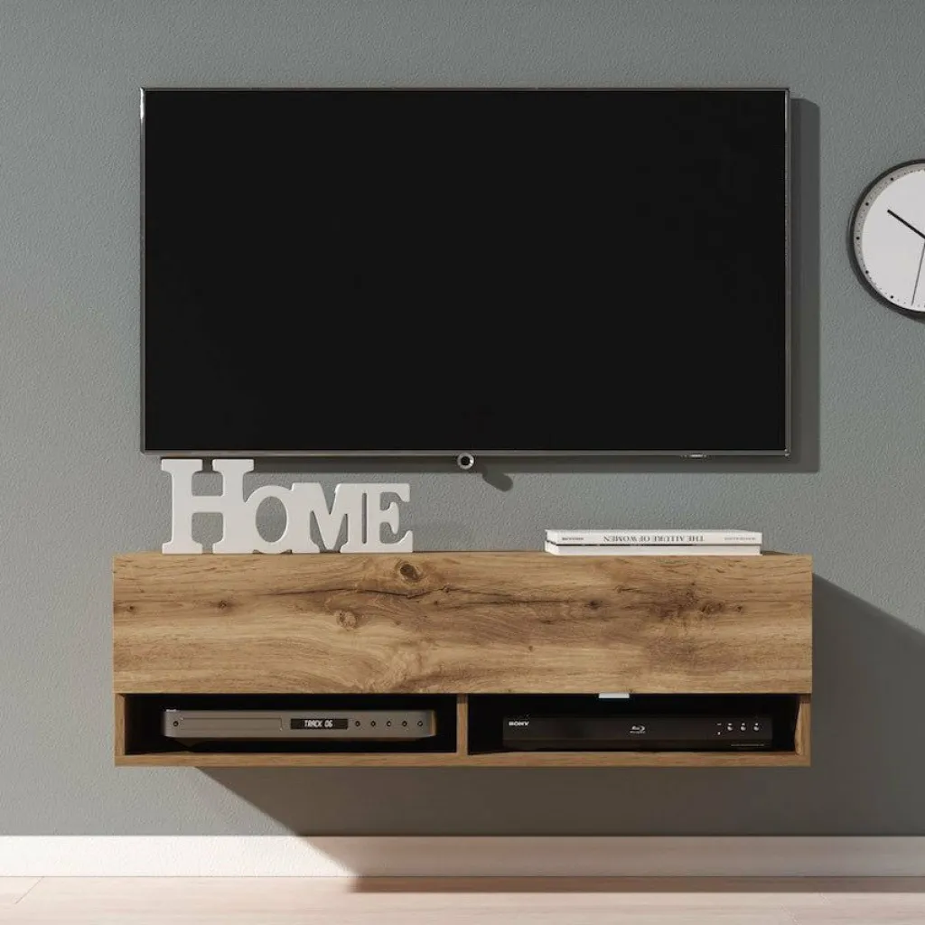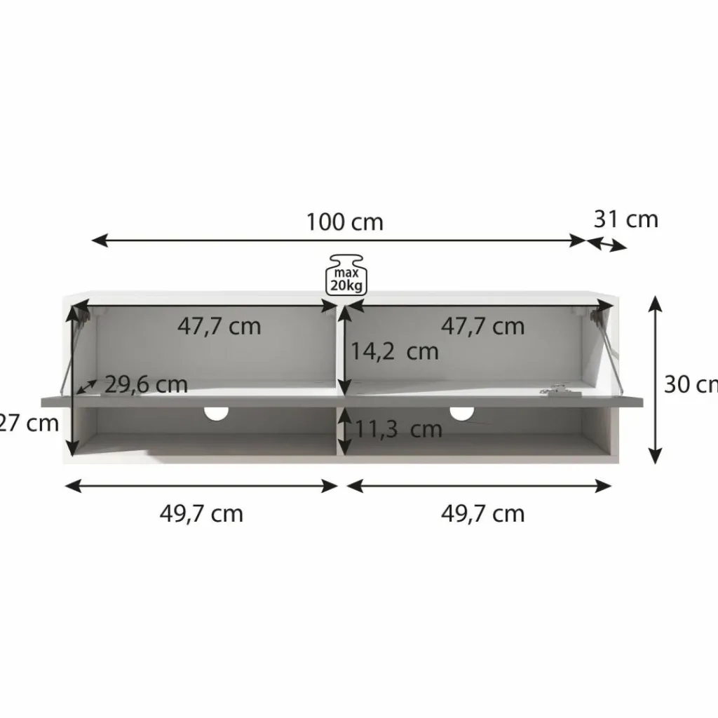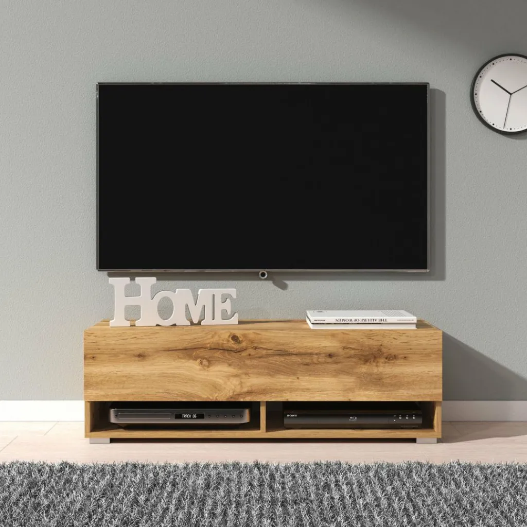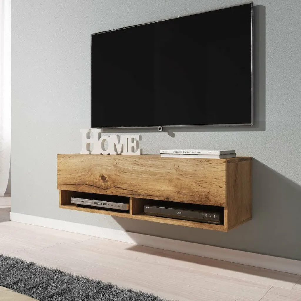 Het tv-meubel Asino is aan de muur op te hangen. Toch liever een staand model? Dat kan ook, door eenvoudig de bijgeleverde pootjes te monteren onder het meubel. De pootjes zijn zilverkleurig, gemaakt van kunststof en hebben een hoogte van 2 cm.