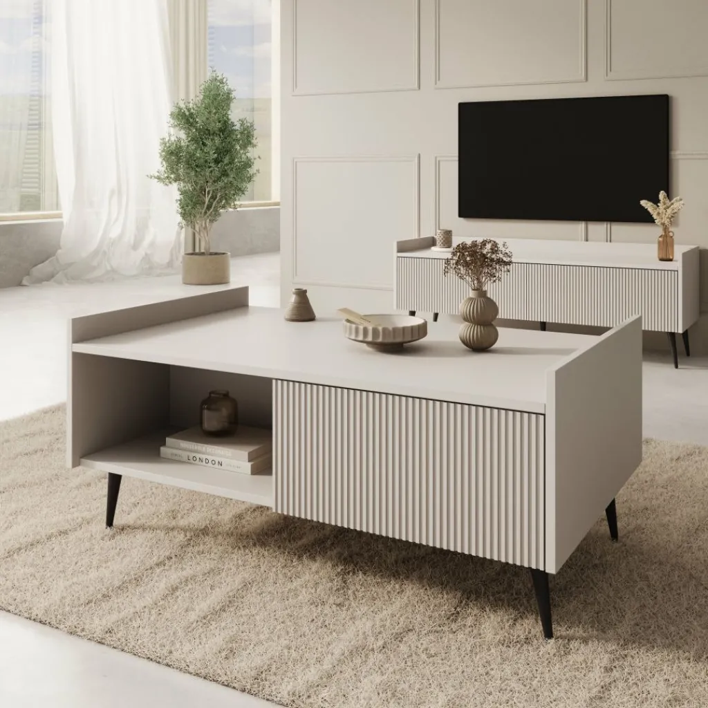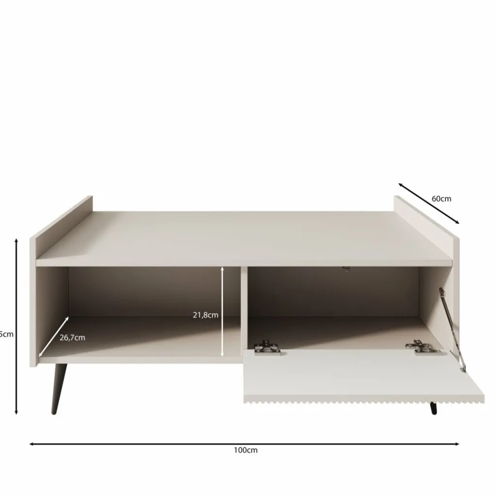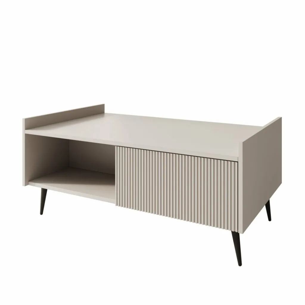 Salontafel Asty in beige is een moderne en elegante toevoeging aan de woonkamer. De subtiele verticale lijnen aan de voorkant geven het ontwerp een verfijnde, eigentijdse uitstraling, terwijl de beige tint rust en harmonie brengt in het interieur.