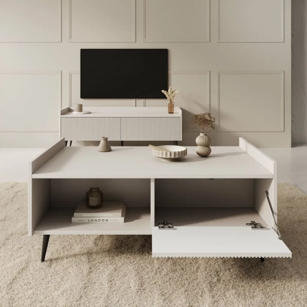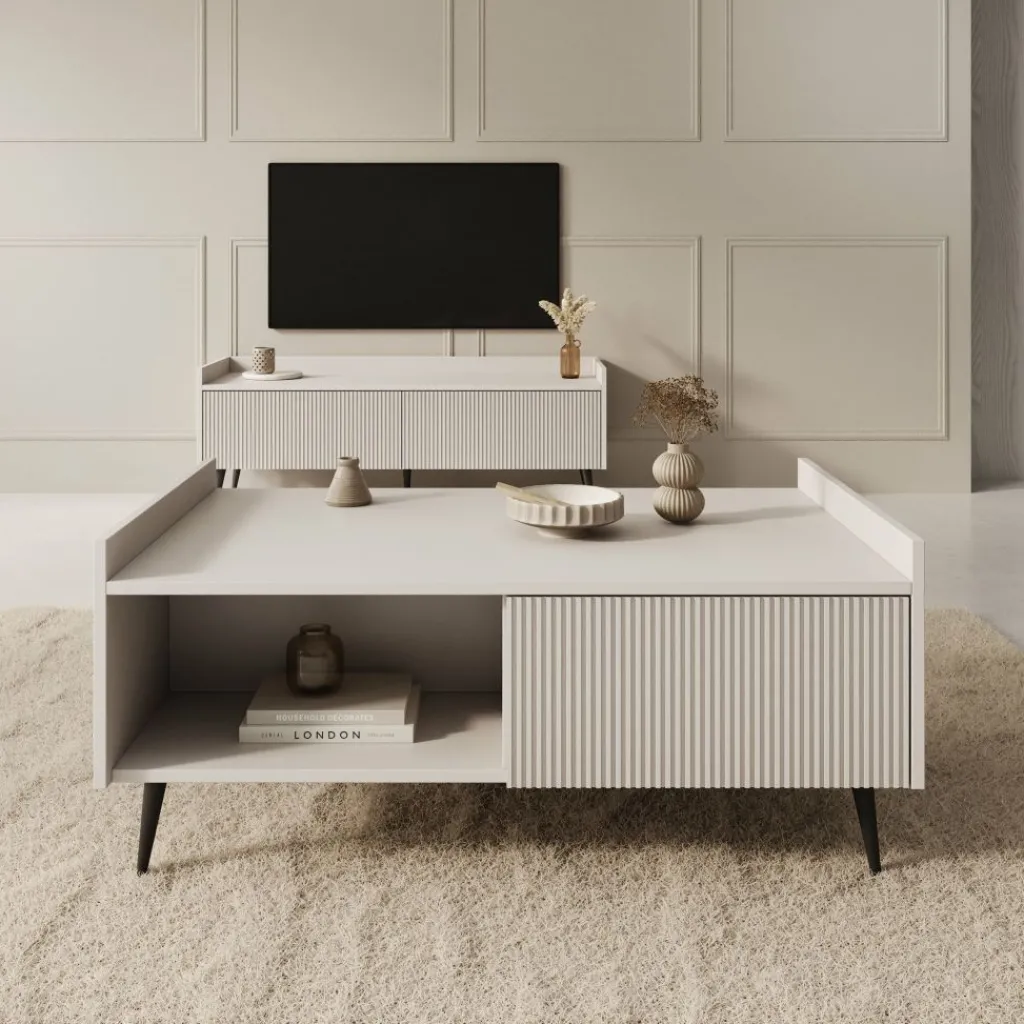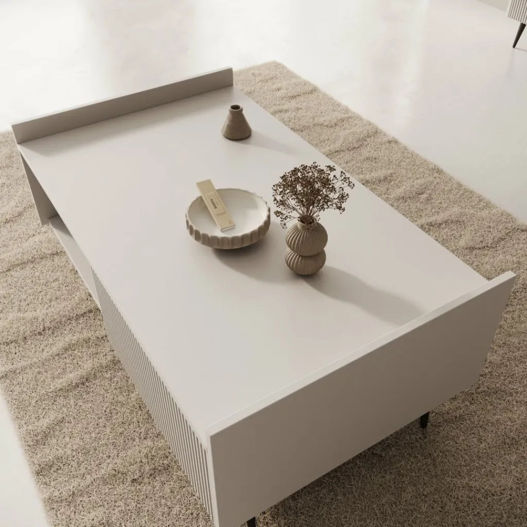 Salontafel Asty in beige is een moderne en elegante toevoeging aan de woonkamer. De subtiele verticale lijnen aan de voorkant geven het ontwerp een verfijnde, eigentijdse uitstraling, terwijl de beige tint rust en harmonie brengt in het interieur.