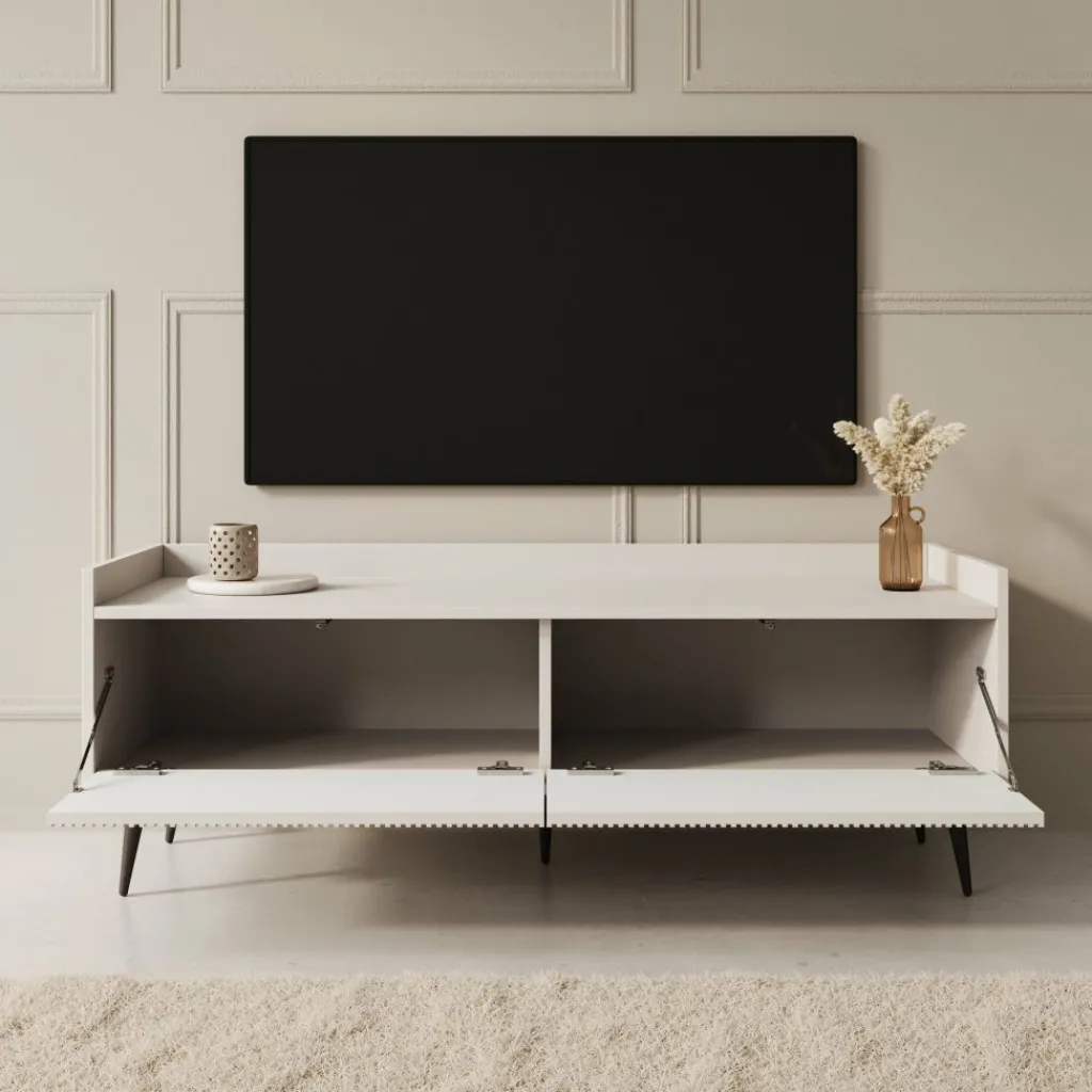 Het tv-meubel beschikt over meerdere opbergvakken waarin media-apparatuur, afstandsbedieningen en andere accessoires overzichtelijk kunnen worden opgeborgen. De fronten zijn uitgevoerd zonder zichtbare handgrepen, wat zorgt voor een strak geheel. Het meubel staat op slanke zwarte poten, waardoor het vrij van de vloer geplaatst is.