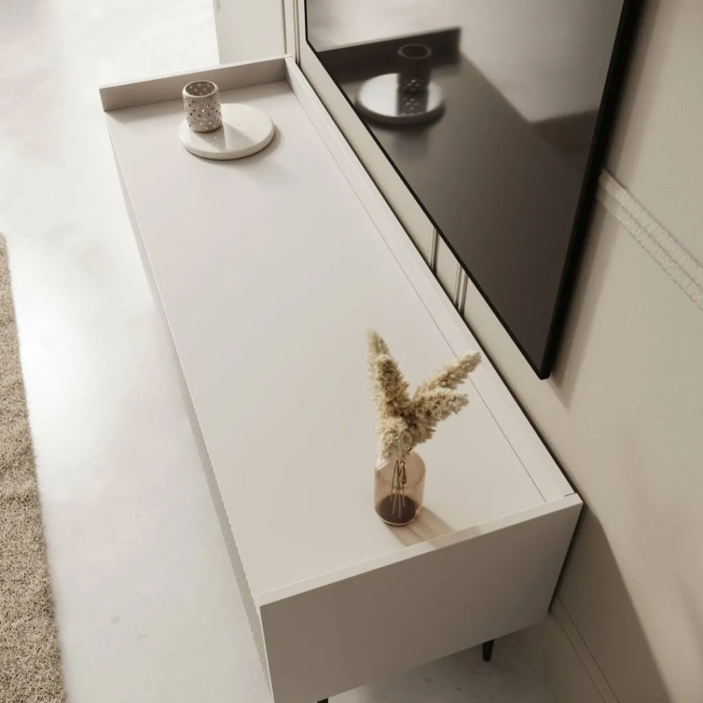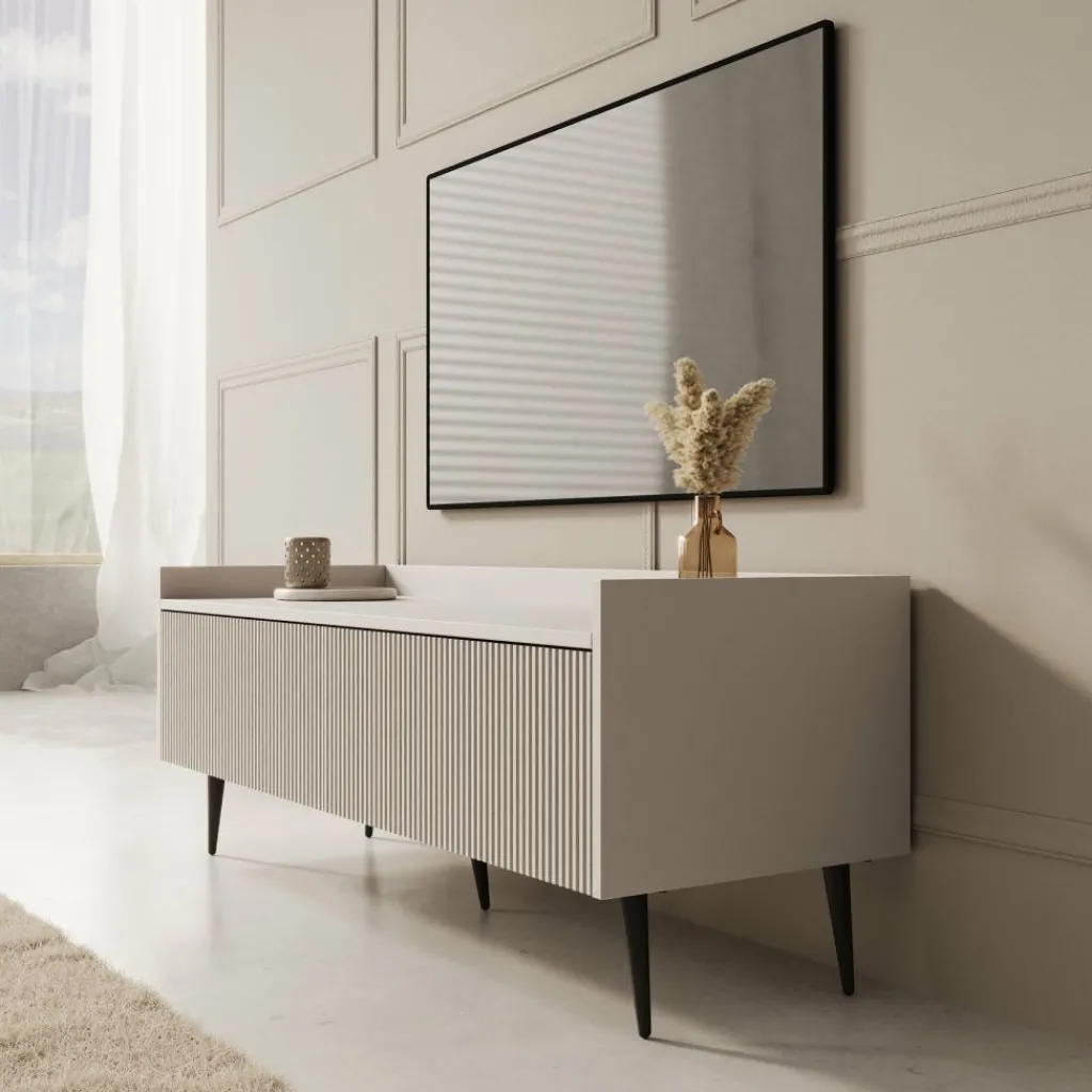 TV-meubel Asty in beige heeft een strak en modern ontwerp met verticale lijnen op de fronten. Deze lijnen zorgen voor een duidelijk gestructureerde uitstraling en geven het meubel een herkenbaar detail. De beige afwerking maakt het meubel geschikt voor verschillende woonruimtes.