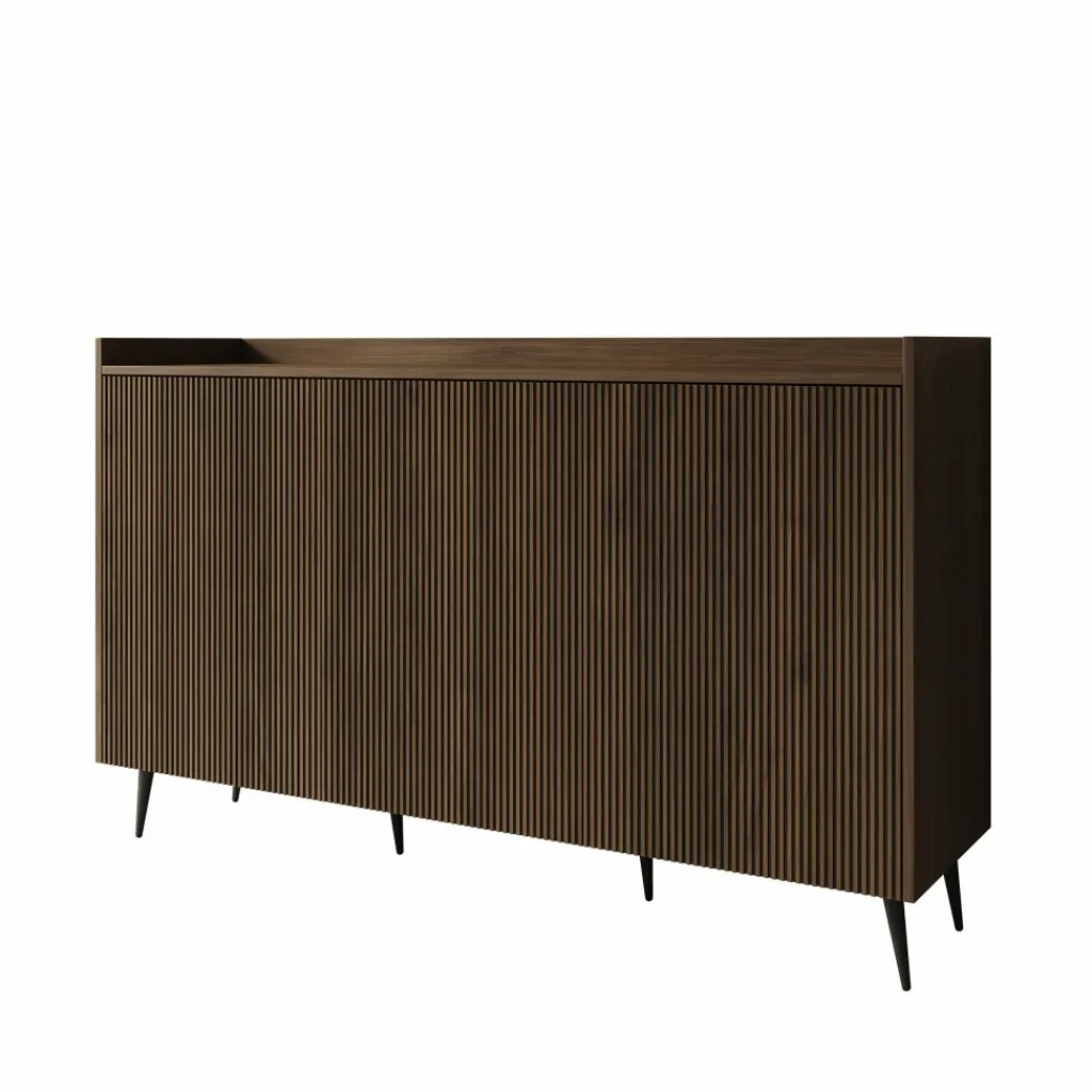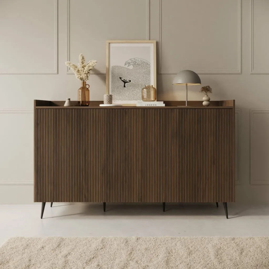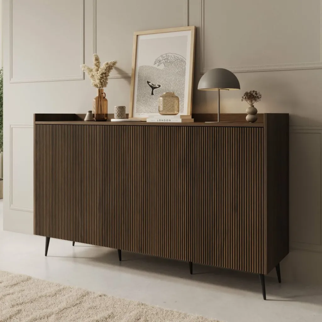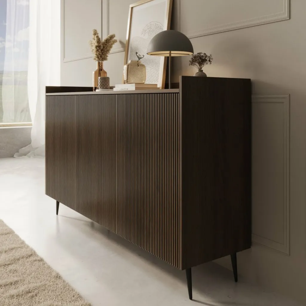 Dressoir Asty in donker eiken heeft een moderne en stijlvolle uitstraling met subtiele verticale lijnen die het ontwerp diepte en structuur geven. De donker eiken kleur brengt warmte en karakter in de ruimte, terwijl het slanke silhouet zorgt voor een eigentijds en evenwichtig geheel.