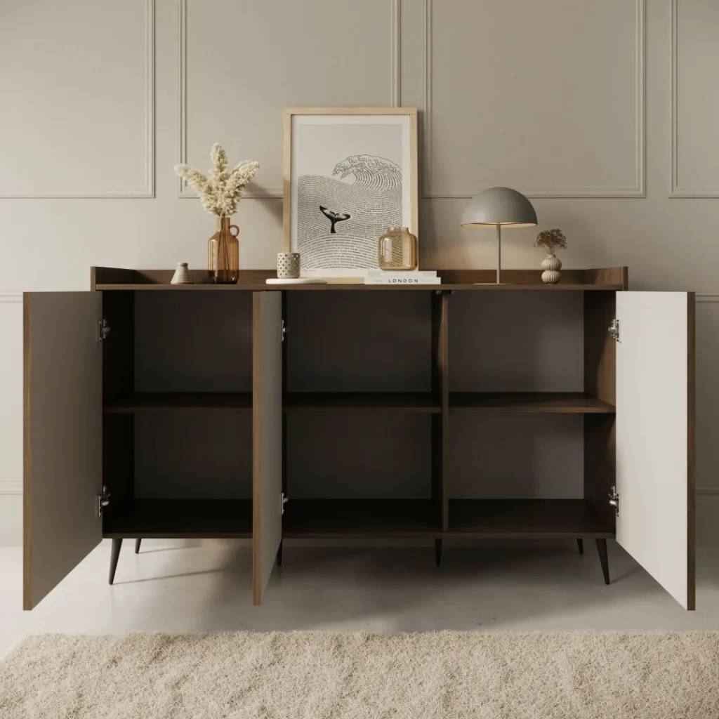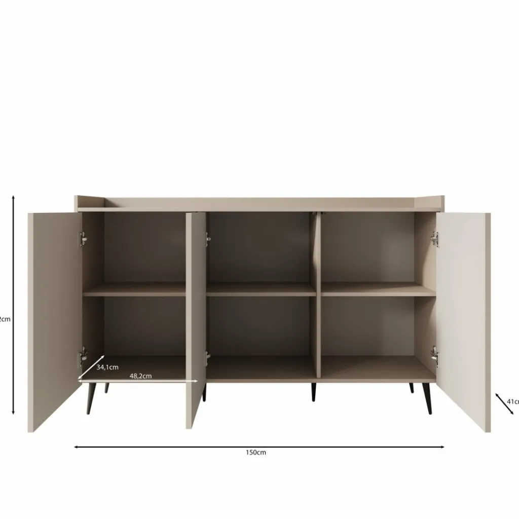 Achter de deuren bevindt zich ruime opbergruimte voor servies, woonaccessoires of andere benodigdheden. Dankzij de breedte van 150 cm biedt dit dressoir veel praktische opbergruimte zonder massief te ogen. De zwarte poten geven het meubel een moderne afwerking en zorgen voor stabiliteit.