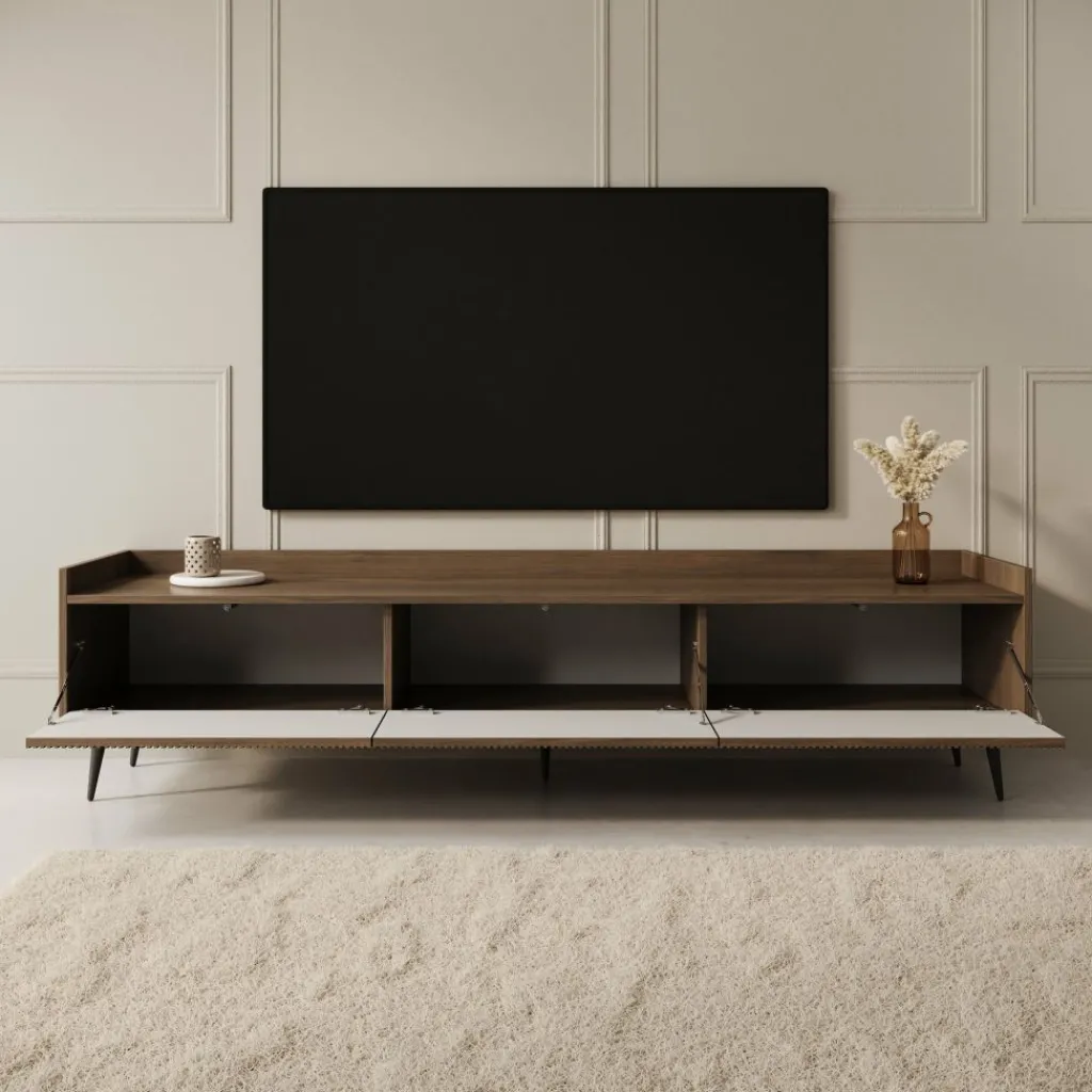 Het meubel biedt ruime opbergmogelijkheden achter de kleppen, zodat apparatuur, kabels en accessoires netjes uit het zicht blijven. De zwarte, smalle poten zorgen voor een stabiele basis en een luchtige vorm.