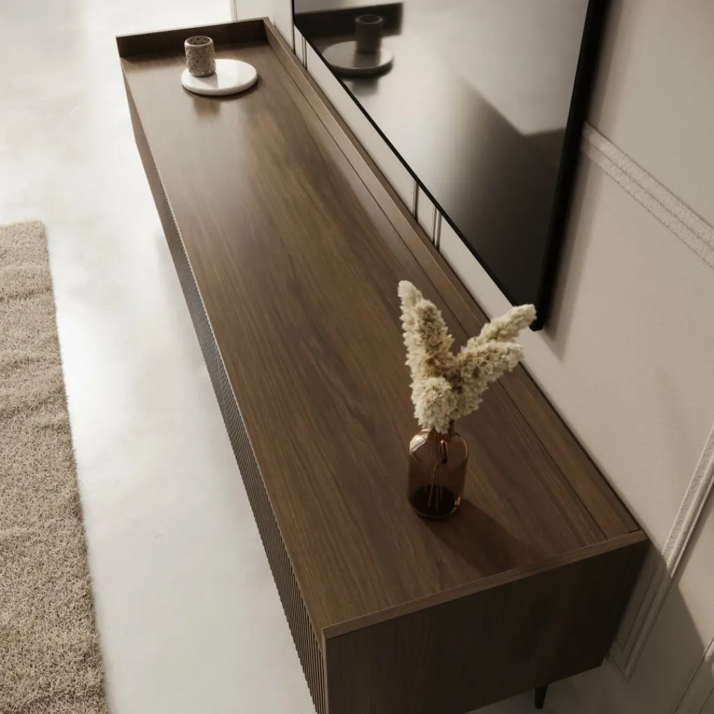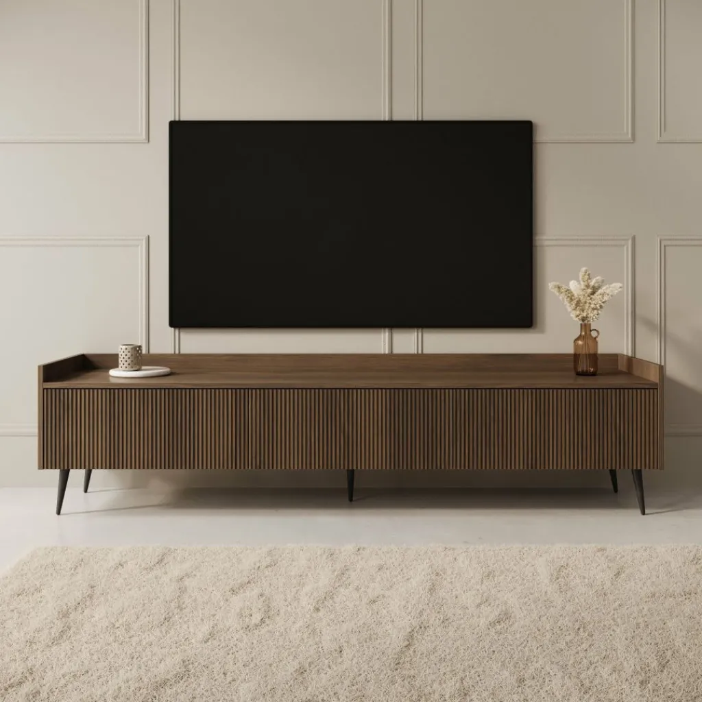 TV-meubel Asty in donker eiken heeft een strak en modern ontwerp met verticale lijnen aan de voorkant. De donker eiken kleur geeft het meubel een warme, natuurlijke uitstraling die goed past in diverse woonstijlen.