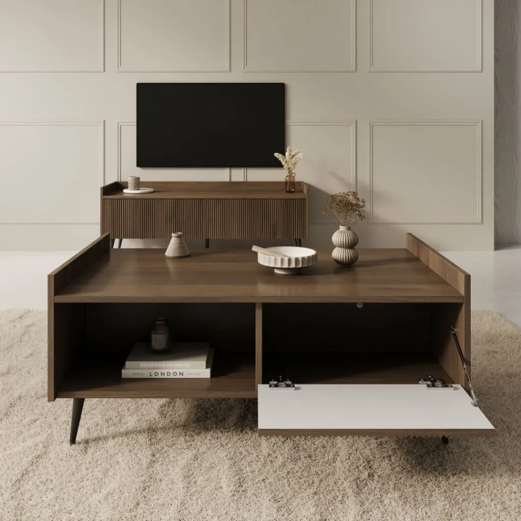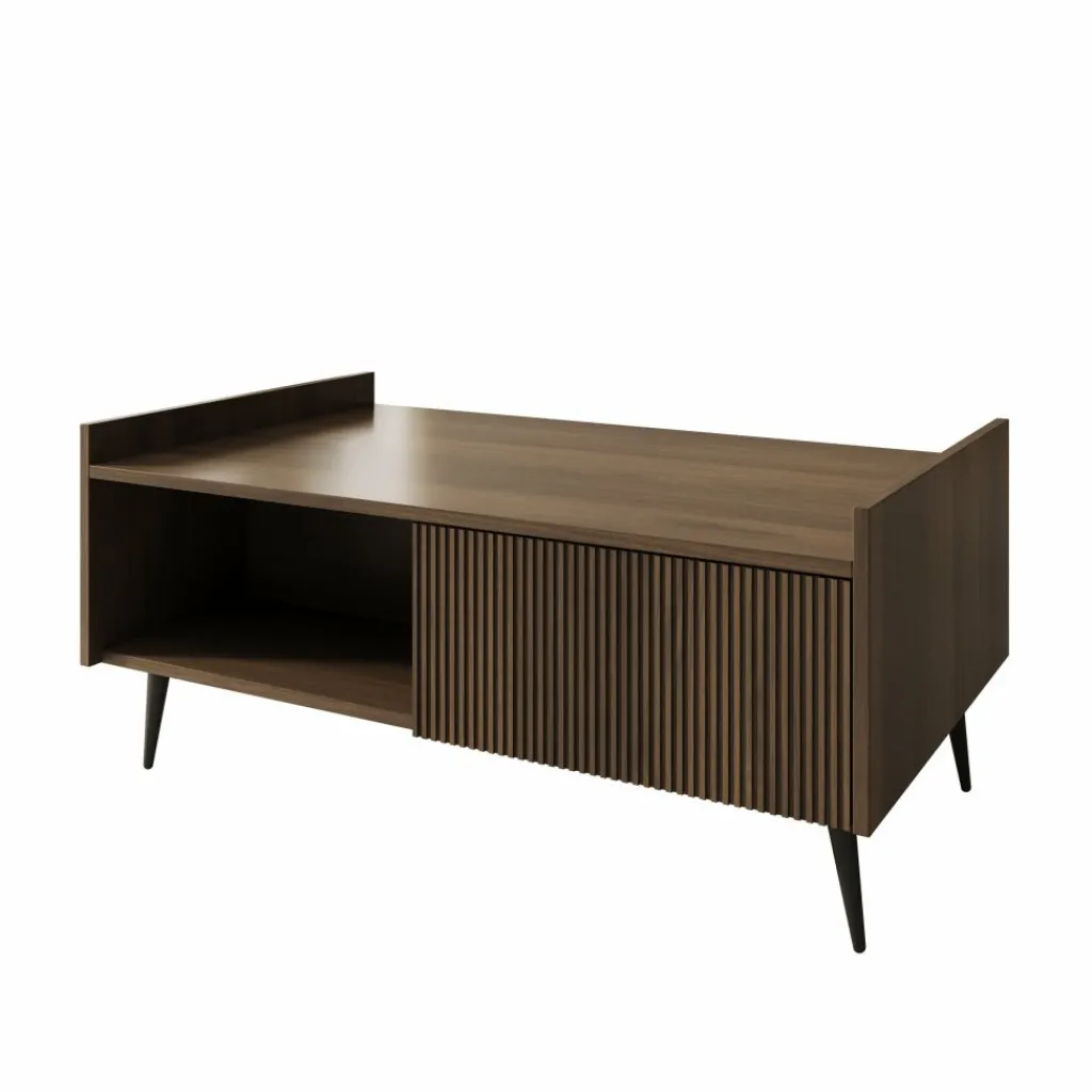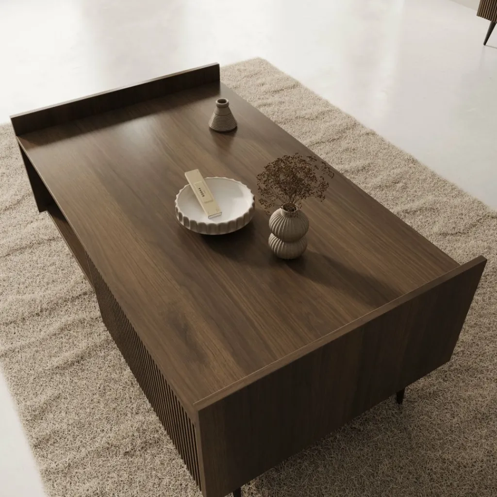 Salontafel Asty in donker eiken is een stijlvolle blikvanger met een warme, natuurlijke uitstraling. De verticale groeven aan de voorkant geven het meubel een moderne en verfijnde look, terwijl de donker eikenhoutkleur zorgt voor een luxe en sfeervol accent in de woonkamer.
