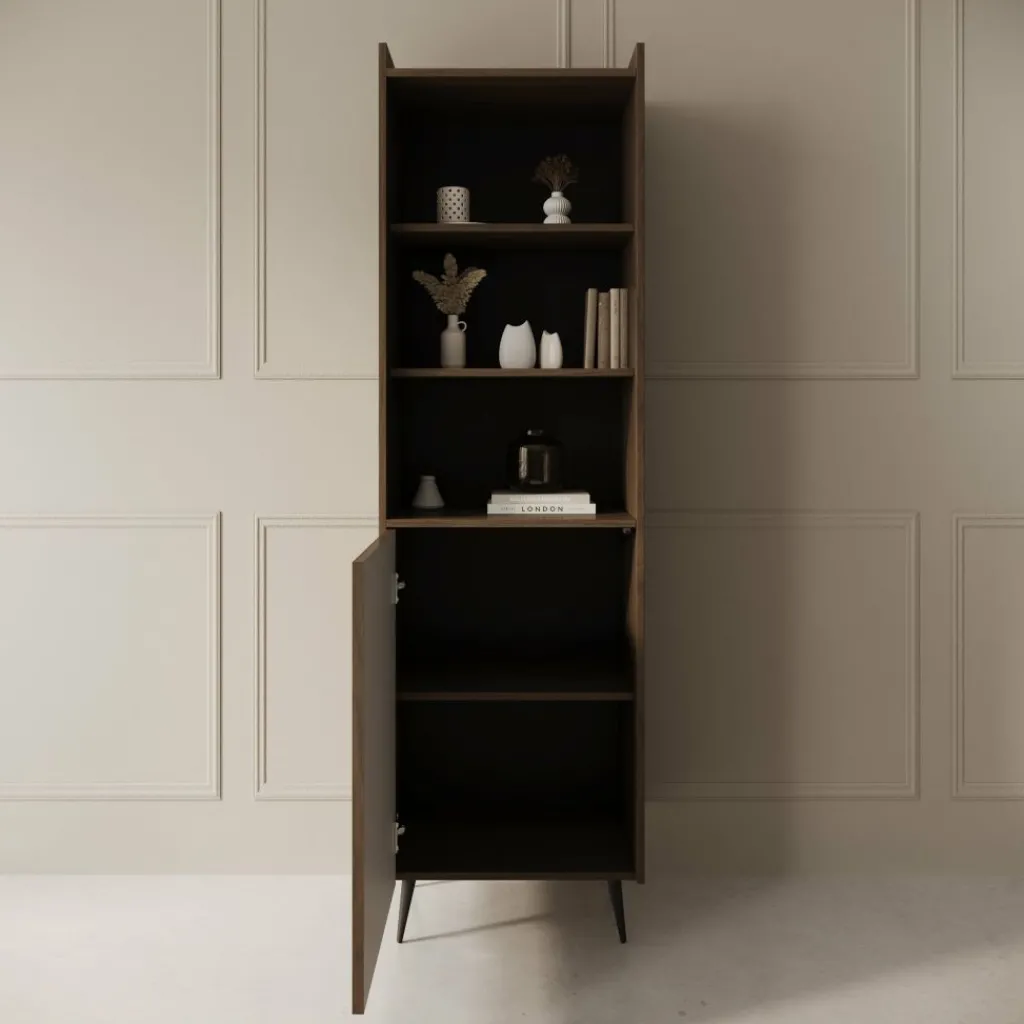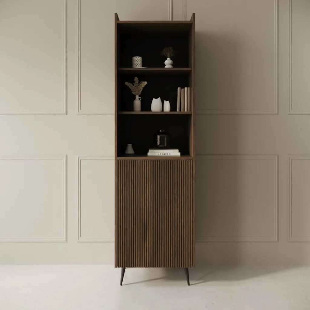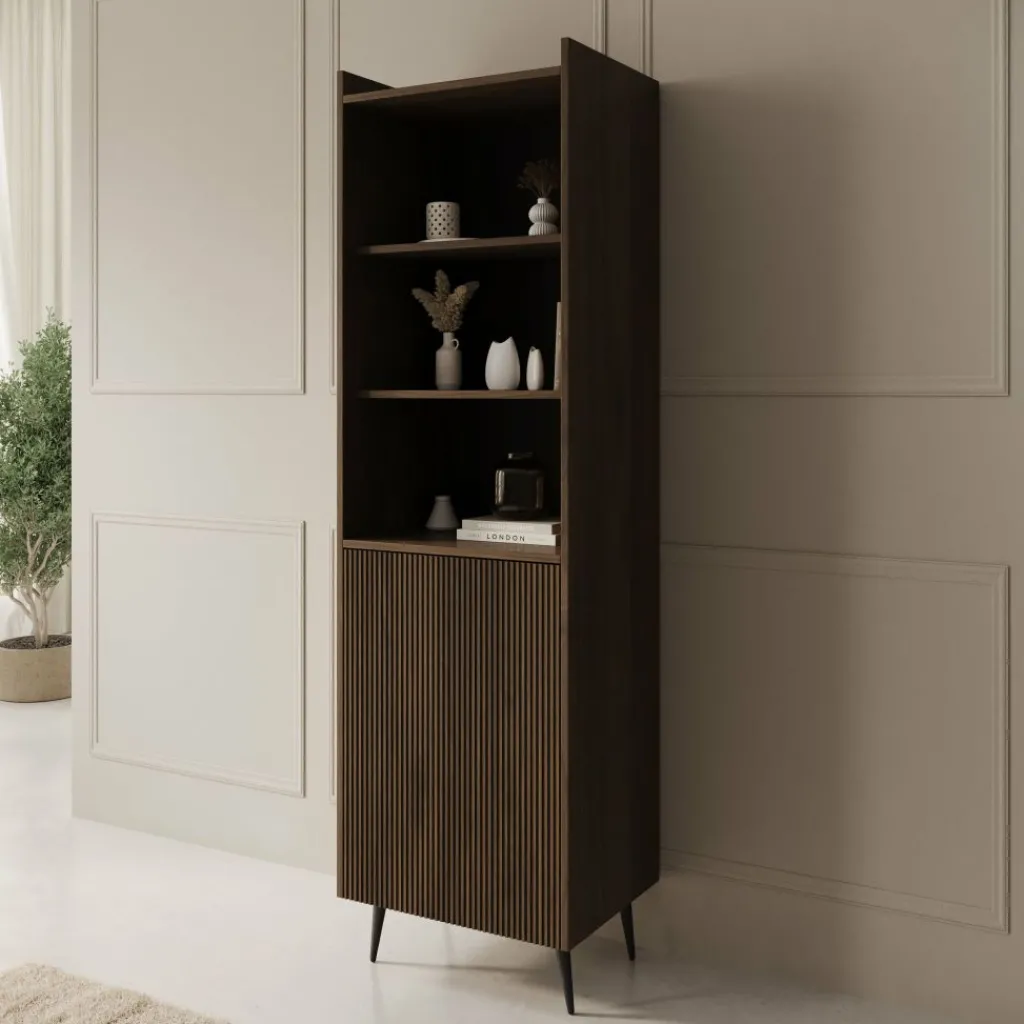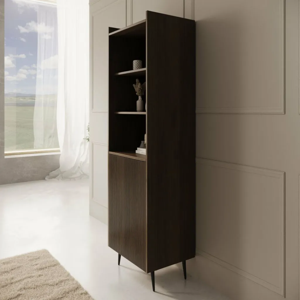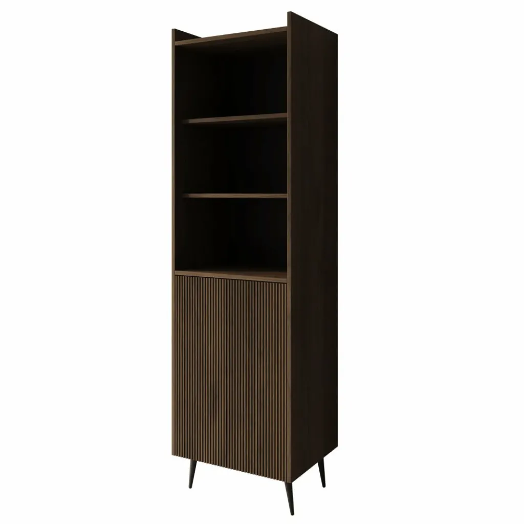 Boekenkast Asty in donker eiken combineert een warme houtlook met een strak, eigentijds design. De verticale lijnen op de deur en de donkere houttint geven het meubel een luxe en moderne uitstraling, terwijl de open vakken ruimte bieden voor boeken, accessoires of decoratieve objecten.