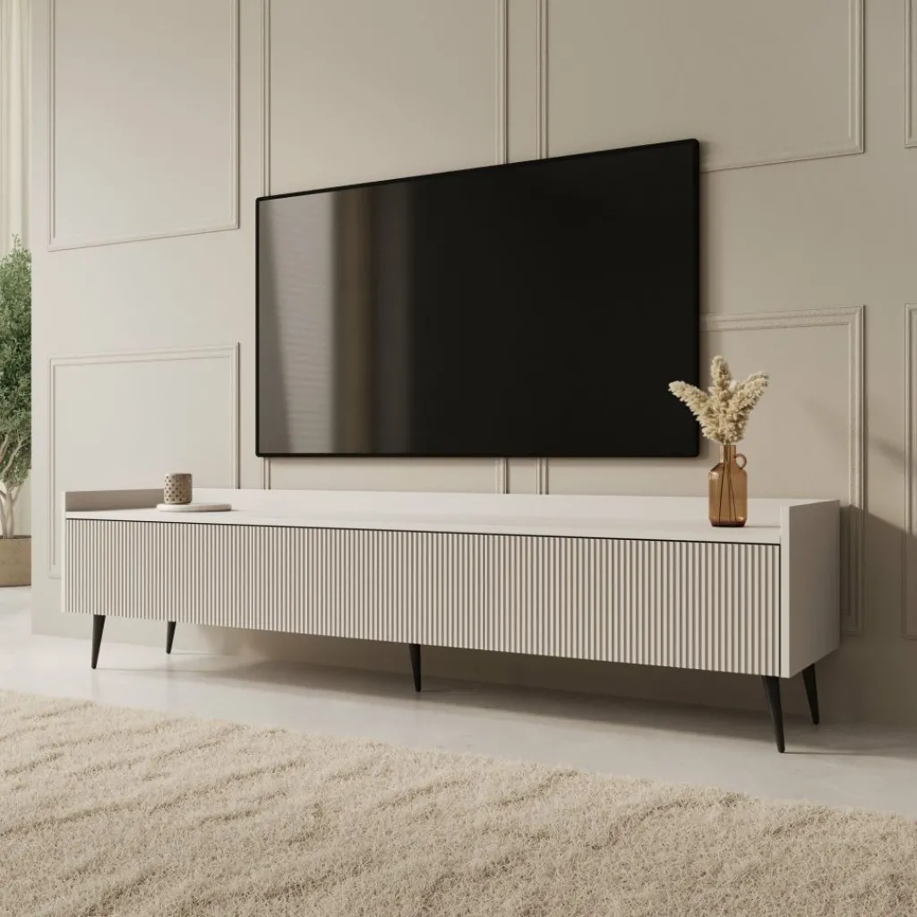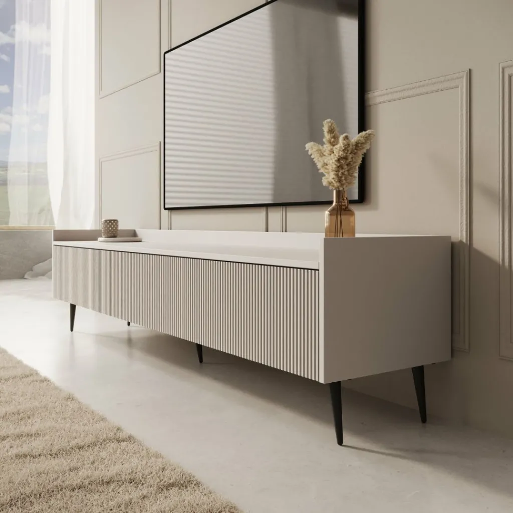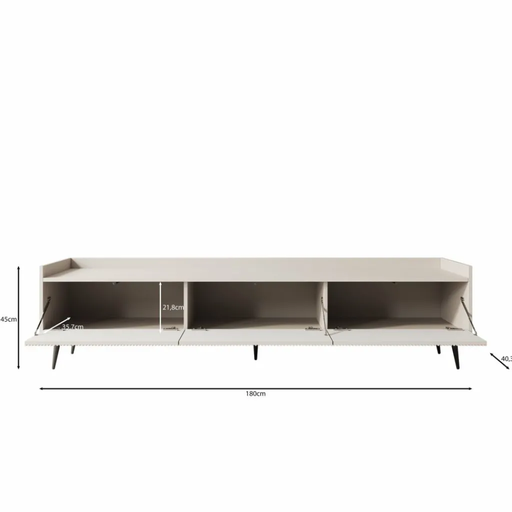 TV-meubel Asty in beige heeft een strak ontwerp met verticale lijnen aan de voorkant. Het model biedt ruime opbergmogelijkheden achter de kleppen, zodat apparatuur en accessoires netjes kunnen worden opgeborgen.