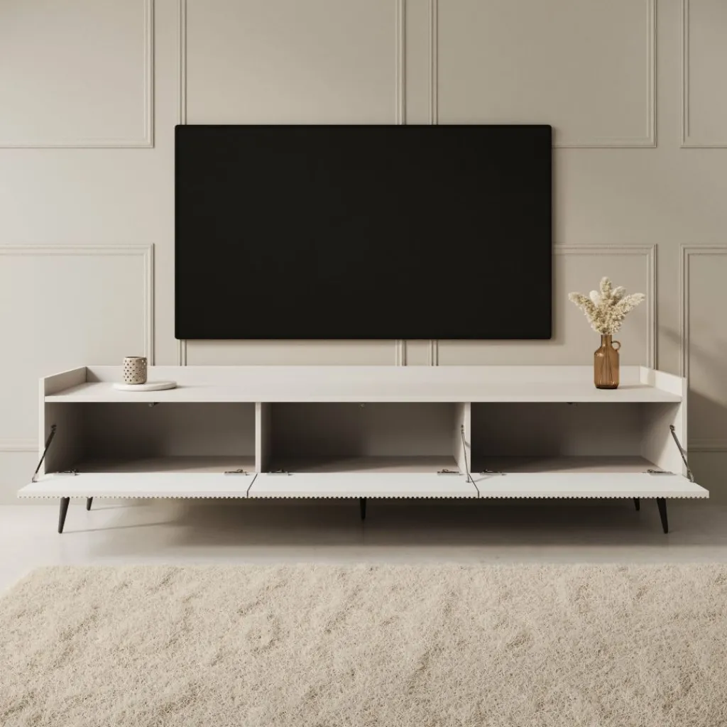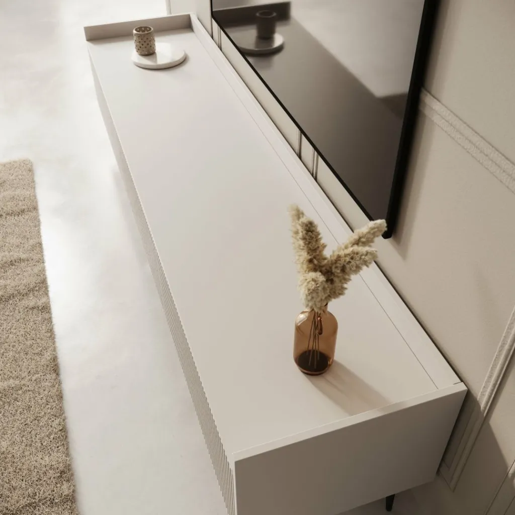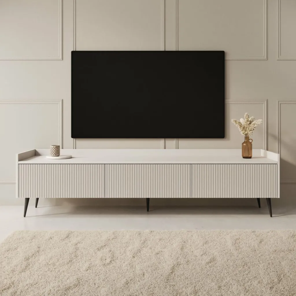 TV-meubel Asty in beige heeft een strak ontwerp met verticale lijnen aan de voorkant. Het model biedt ruime opbergmogelijkheden achter de kleppen, zodat apparatuur en accessoires netjes kunnen worden opgeborgen.