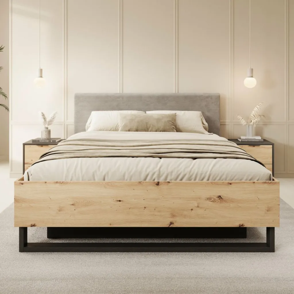 Tweepersoonsbed Augustus is een stijlvol bed met een eikenhout-look frame en een zacht stoffen hoofdboard.