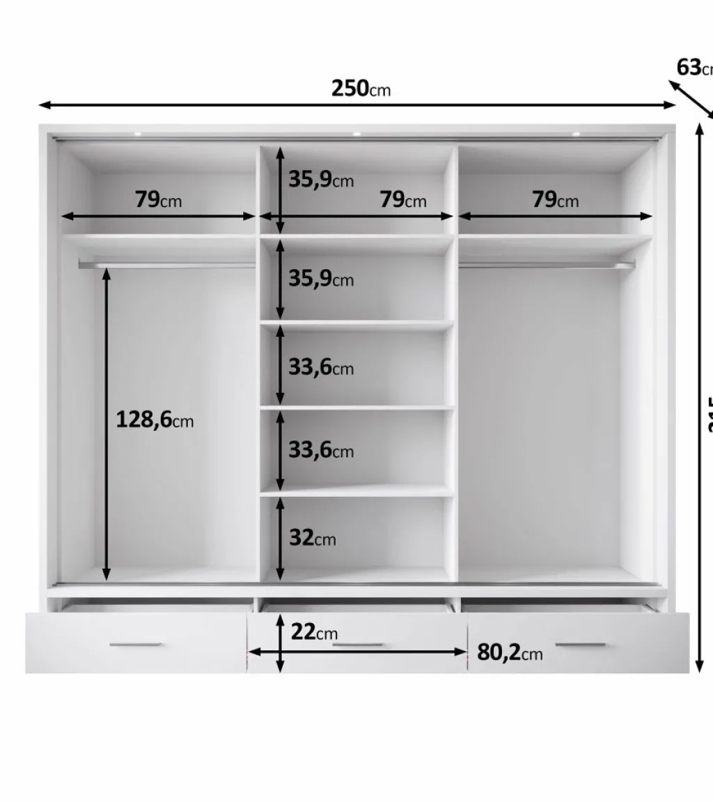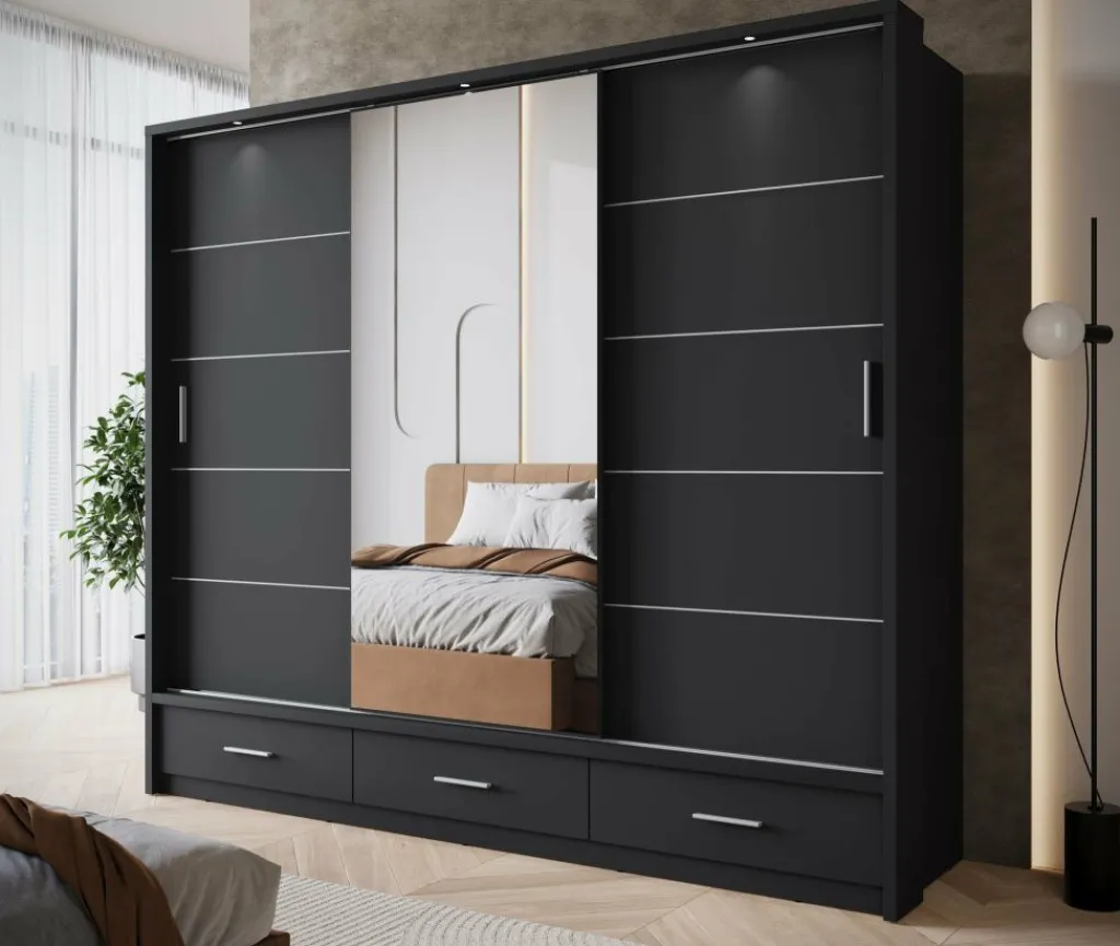 Kledingkast Autumn is een garderobekast met ruime opbergmogelijkheden in een moderne stijl. Dit model beschikt over 3 schuifdeuren en 3 lades die openen met zwarte handgrepen. De middelste deur is voorzien van een spiegel. De binnenkant van de kast bestaat uit 2 kledingroedes en 7 opbergvakken. De Autumn is uitgevoerd in een zwarte kleur. Ten slotte beschikt het meubel over LED-verlichting.