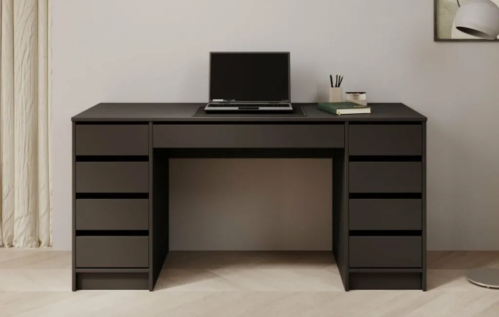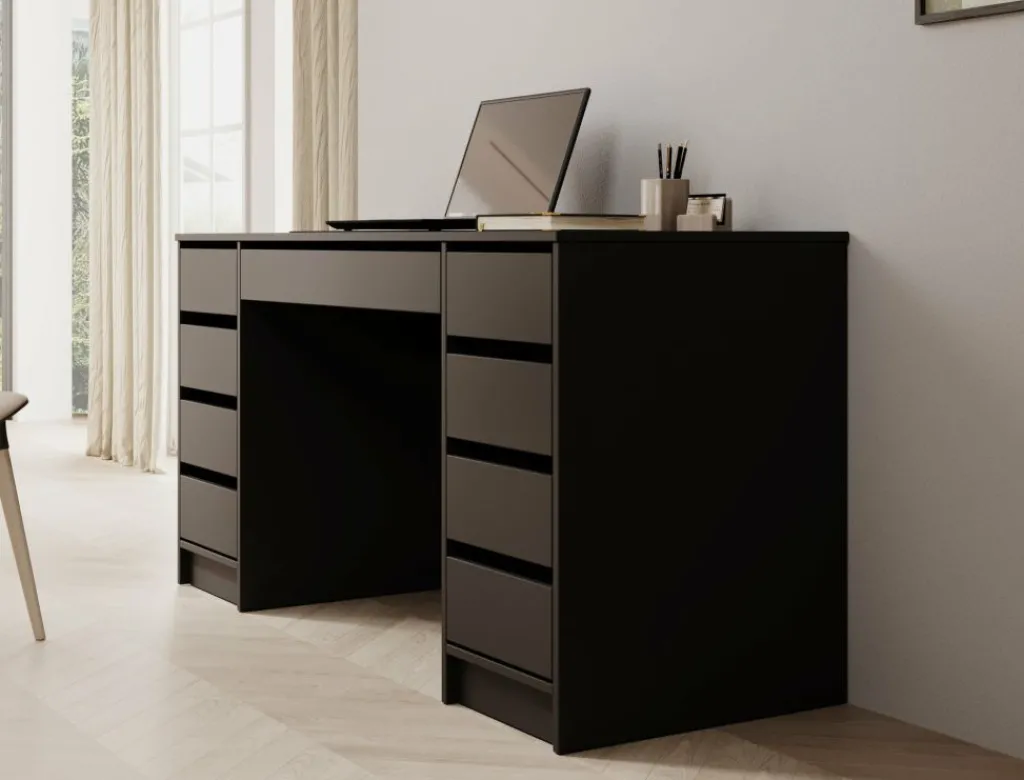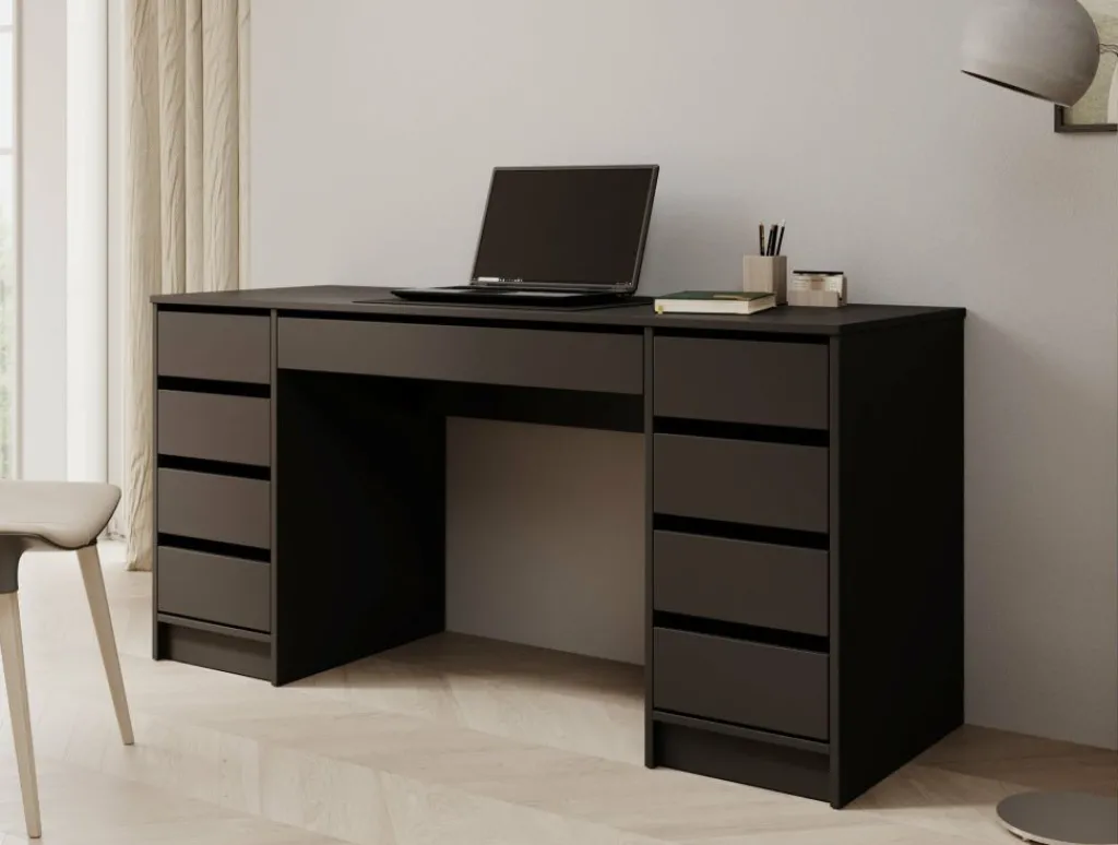 Bureau Avio 2 is een praktische werkplek met een moderne uitstraling in de kleur zwart. Het bureau is een praktisch bureau met enorm veel opbergruimte. De Avio 2 beschikt namelijk over in totaal 9 lades. Deze lades zijn te openen via de inkepingen aan de bovenkant.