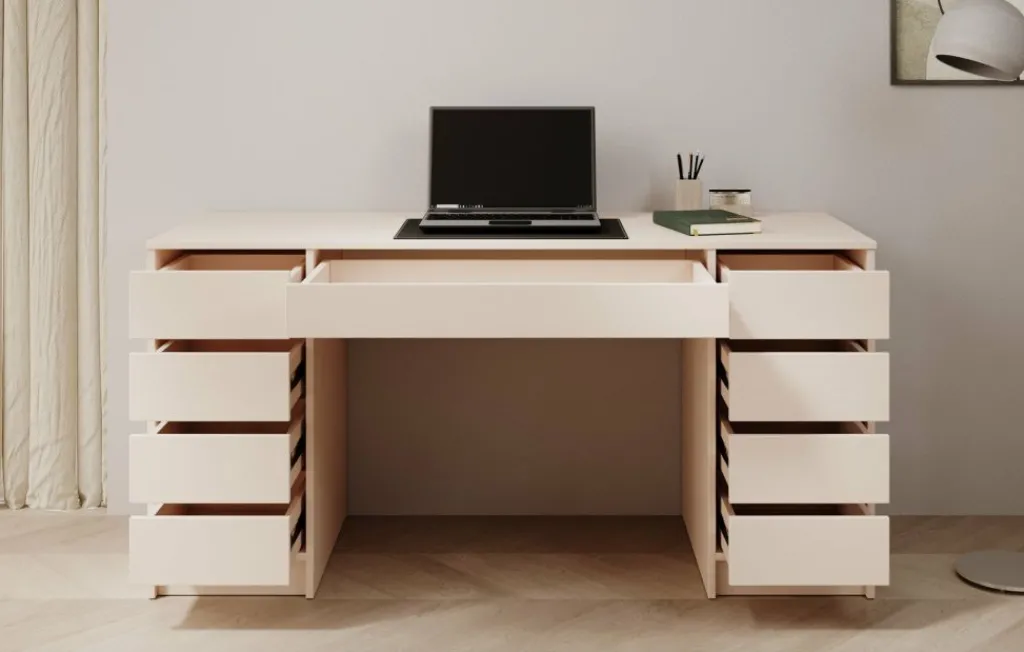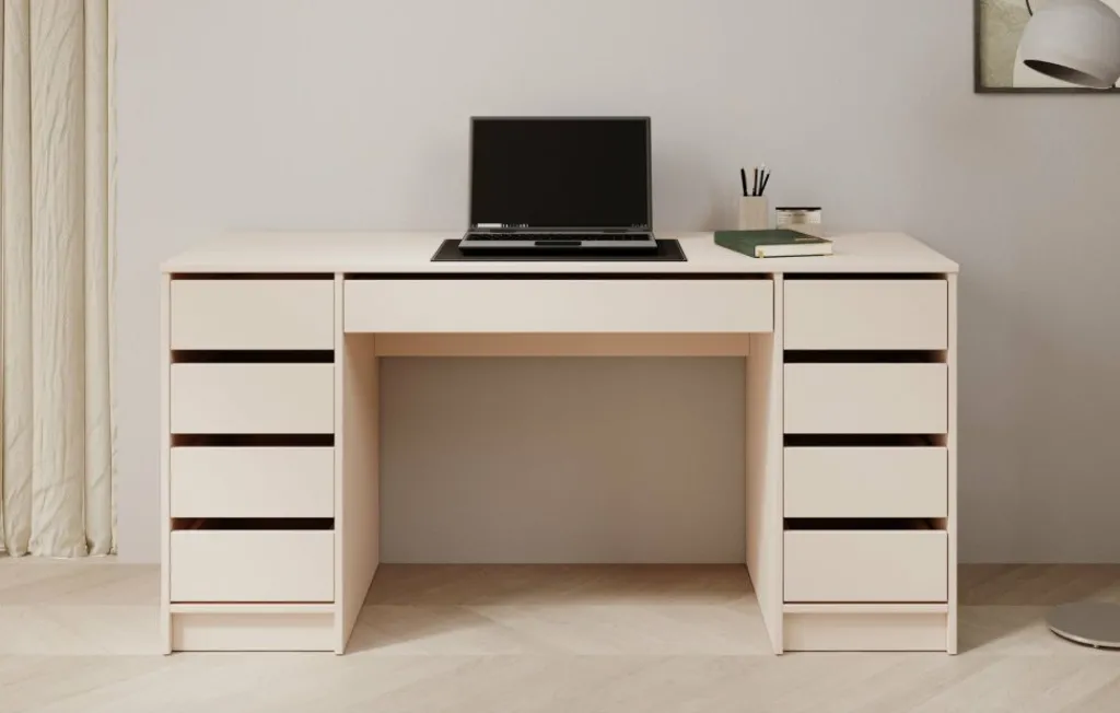 Bureau Avio 2 is een praktische werkplek met een moderne uitstraling in de kleur beige. Het bureau is een praktisch bureau met enorm veel opbergruimte. De Avio 2 beschikt namelijk over in totaal 9 lades. Deze lades zijn te openen via de inkepingen aan de bovenkant.