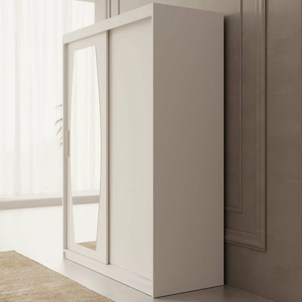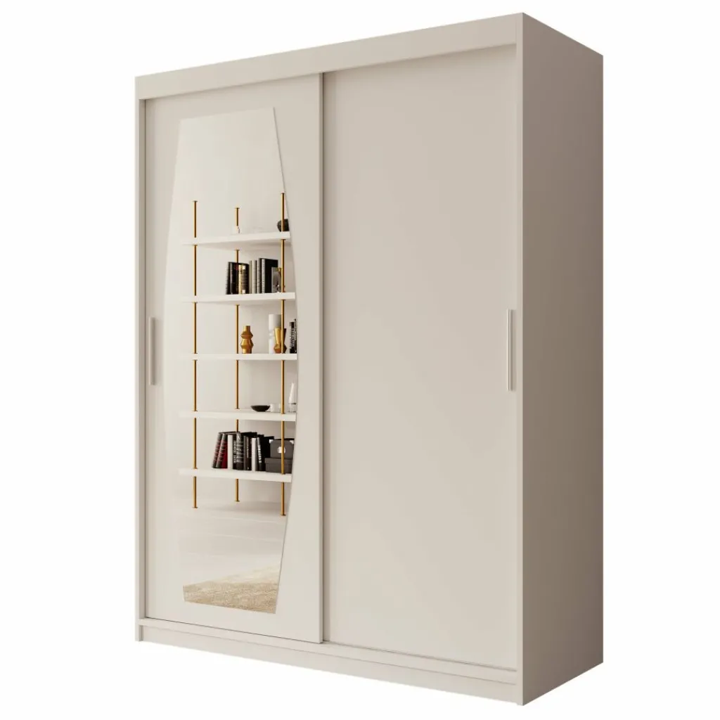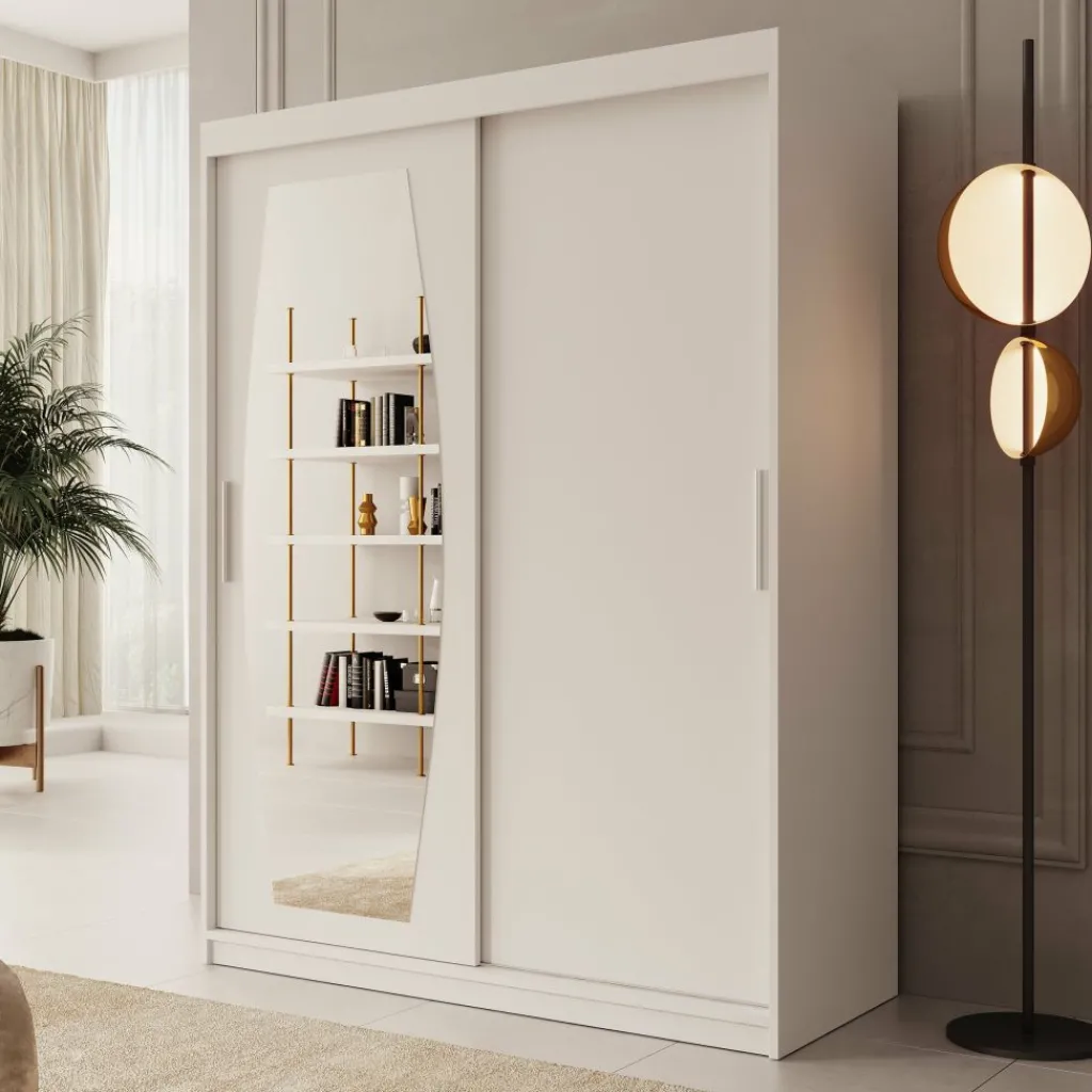 Kledingkast Azai is een schuifdeurkast van 150 cm breed, uitgevoerd in wit. De kast is voorzien van een opvallend spiegelpaneel in organische vorm, en beschikt over twee schuifdeuren met strakke verticale grepen in zilverkleur.
