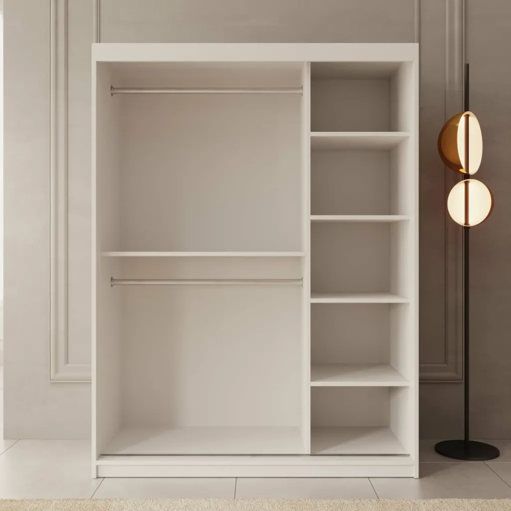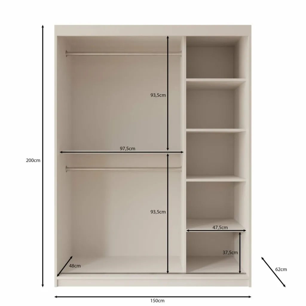 Aan de binnenzijde biedt Azai volop opbergruimte: twee hanggedeeltes van elk 93,5 cm hoog en een kolom met vijf legplanken. De vakken aan de rechterzijde hebben verschillende afmetingen, ideaal voor kleding, linnengoed of accessoires. Dankzij de schuifdeuren blijft de kast ruimtebesparend in gebruik – praktisch voor kleinere slaapkamers of smalle doorgangen.