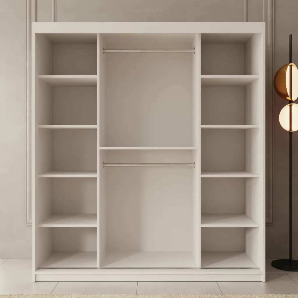 Achter de twee schuifdeuren vind je een overzichtelijke indeling: twee hanggedeeltes van elk 93,5 cm hoog en 78,5 cm breed, ideaal voor lange kledingstukken of overhemden. Daarnaast beschikt de kast over maar liefst acht legvakken – vier aan beide zijden – met een diepte van 48 cm en een breedte van 47,5 cm. De onderste vakken zijn 37,5 cm hoog. Dankzij de spiegel op de linker schuifdeur kun je outfits meteen bekijken, terwijl de schuifdeuren ruimtebesparend zijn in kleinere kamers.
