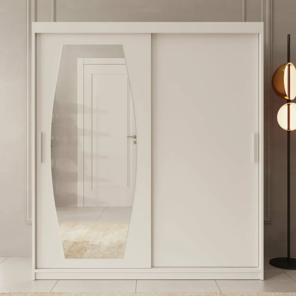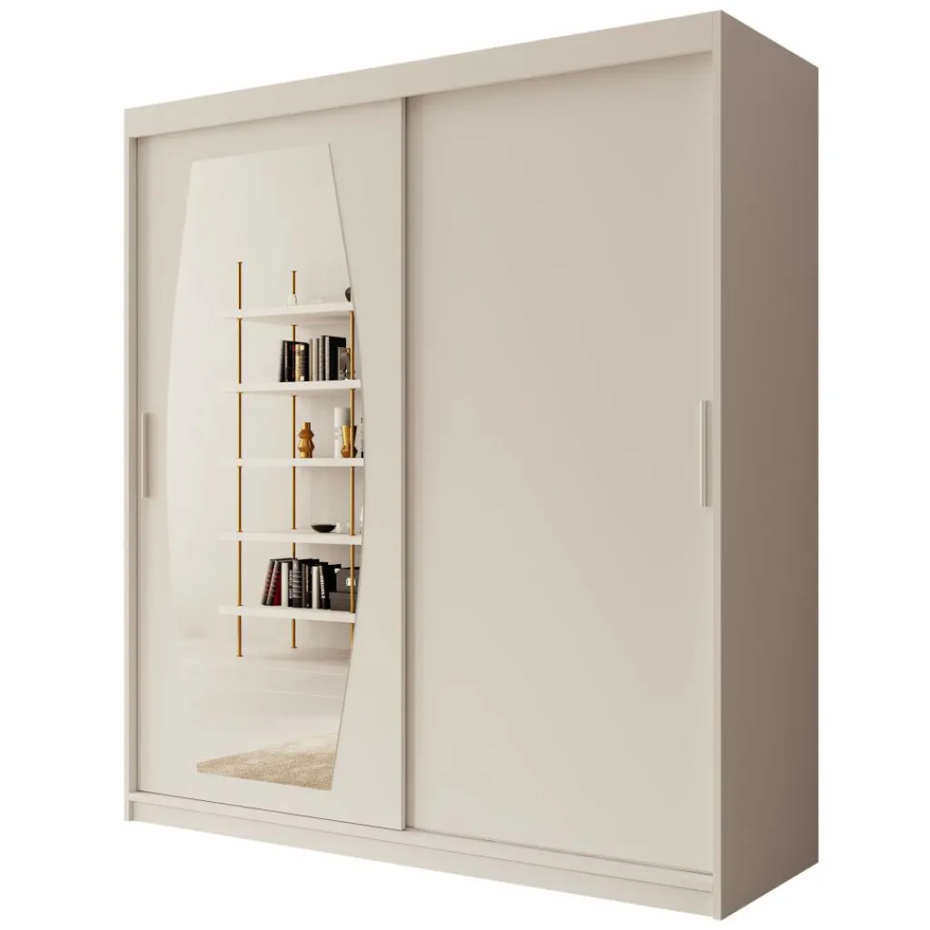 Kledingkast Azai combineert een frisse witte look met slimme opbergruimte en een grote spiegel. De kast is 180 cm breed, 200 cm hoog en 62 cm diep – ruim genoeg voor het netjes opbergen van al je kleding.