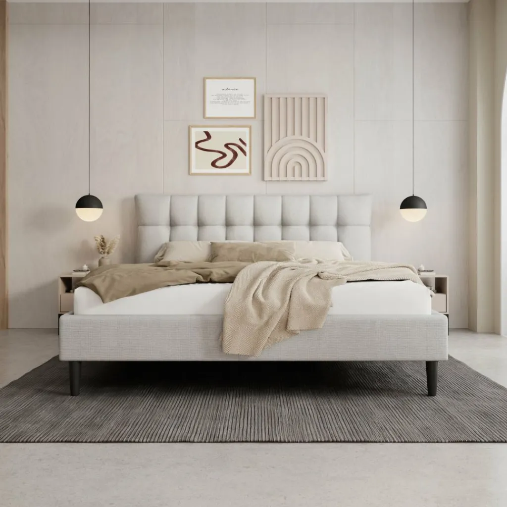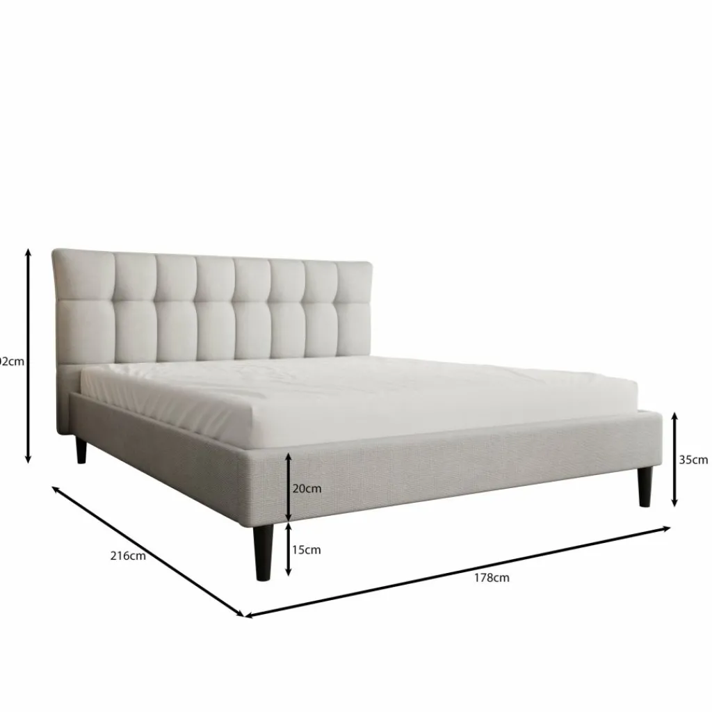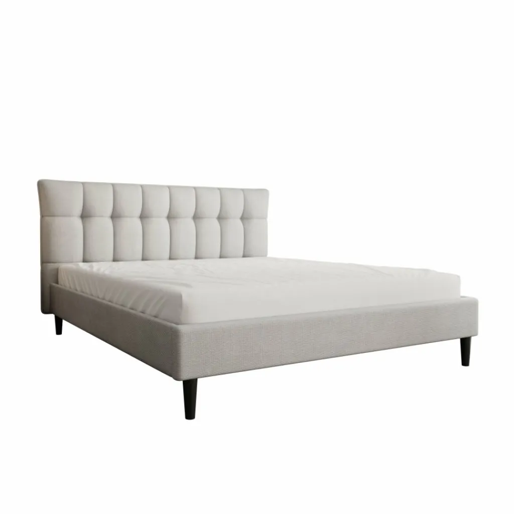 Het Azulita tweepersoonsbed heeft een gestoffeerd ontwerp in lichtgrijze stof met een hoog, gecapitonneerd hoofdbord. De verticale en horizontale stiklijnen geven het hoofdbord een duidelijk blokpatroon, waardoor het bed direct opvalt zonder druk te ogen. Dankzij de rustige kleur en strakke afwerking past het bed goed in moderne en minimalistische slaapkamers.