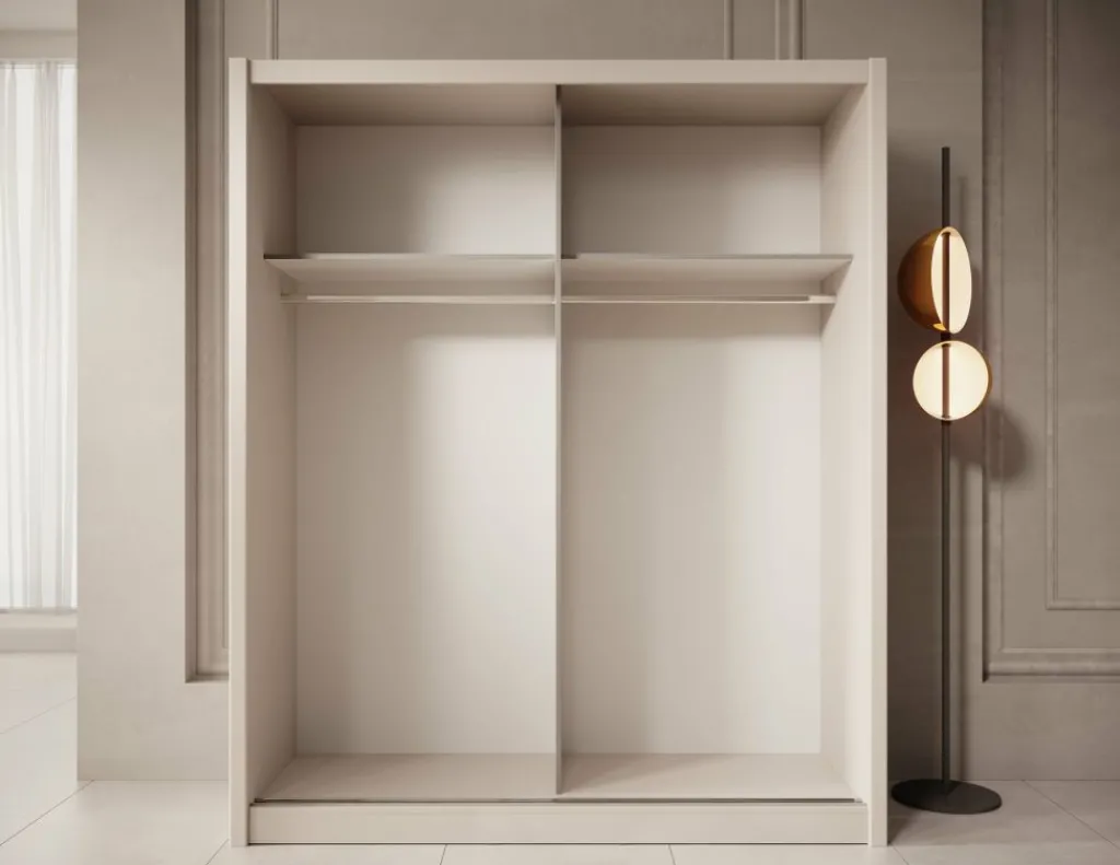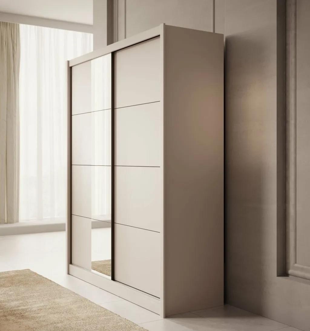 Kledingkast Azul is een garderobekast met ruime opbergmogelijkheden in een moderne stijl. Dit model beschikt over 2 schuifdeuren waarvan de linker deur voorzien is van een spiegel. De binnenkant van de kast bestaat uit 2 kledingroedes en 2 opbergvakken. De Azul is uitgevoerd in een beige kleur.