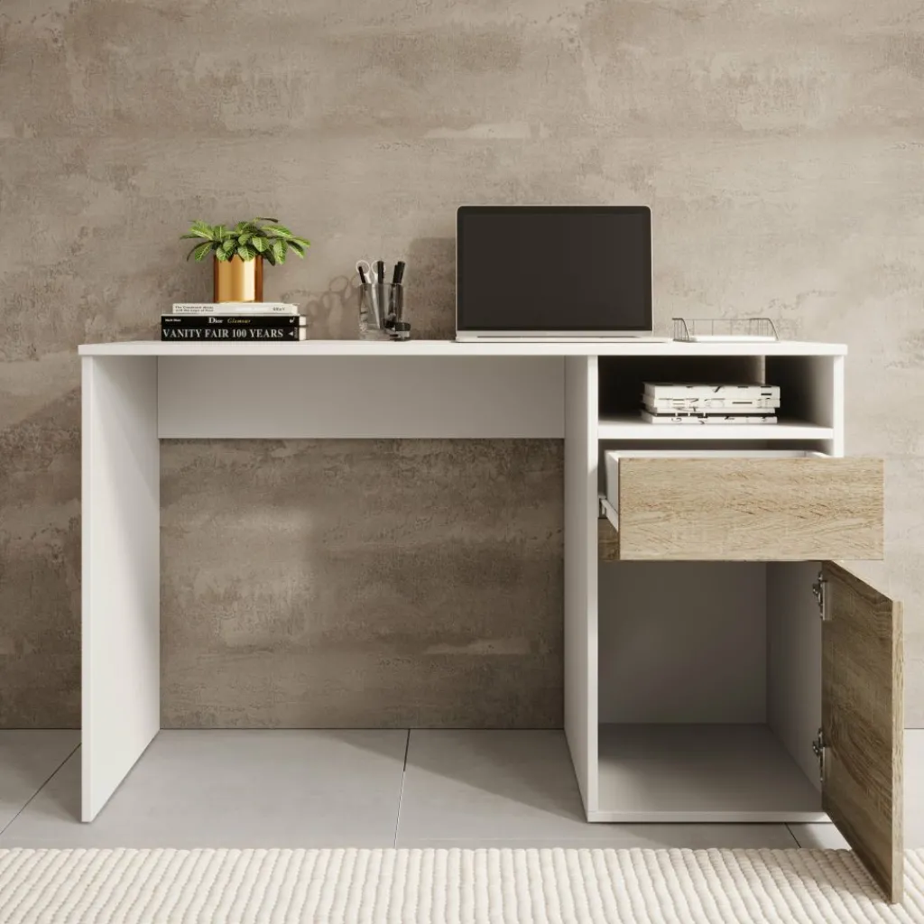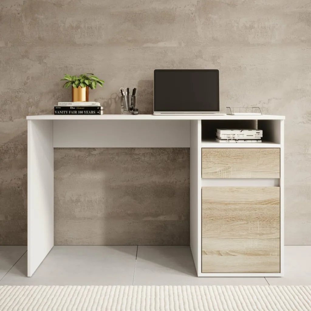 Bureau Babot is een moderne werkplek uitgevoerd in een wit met eiken kleur. Het meubel bestaat uit 1 deur, 1 lade en 1 open vak. Achter de deur zit 1 groot opbergvak.