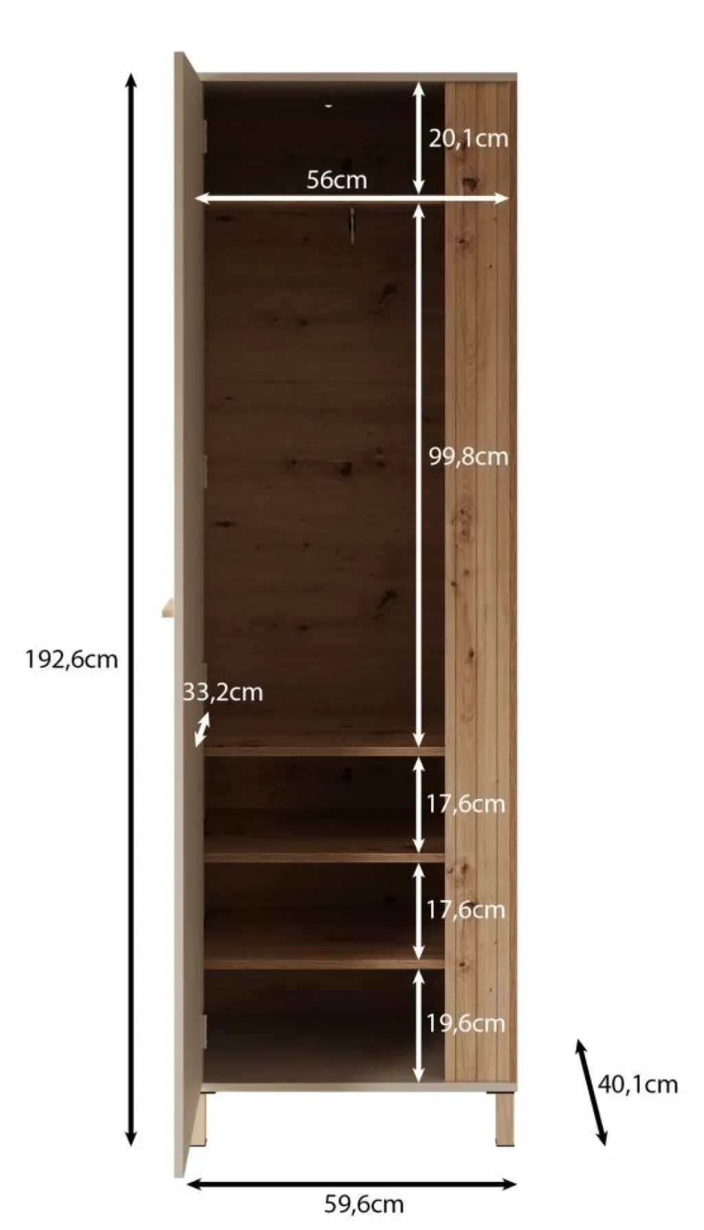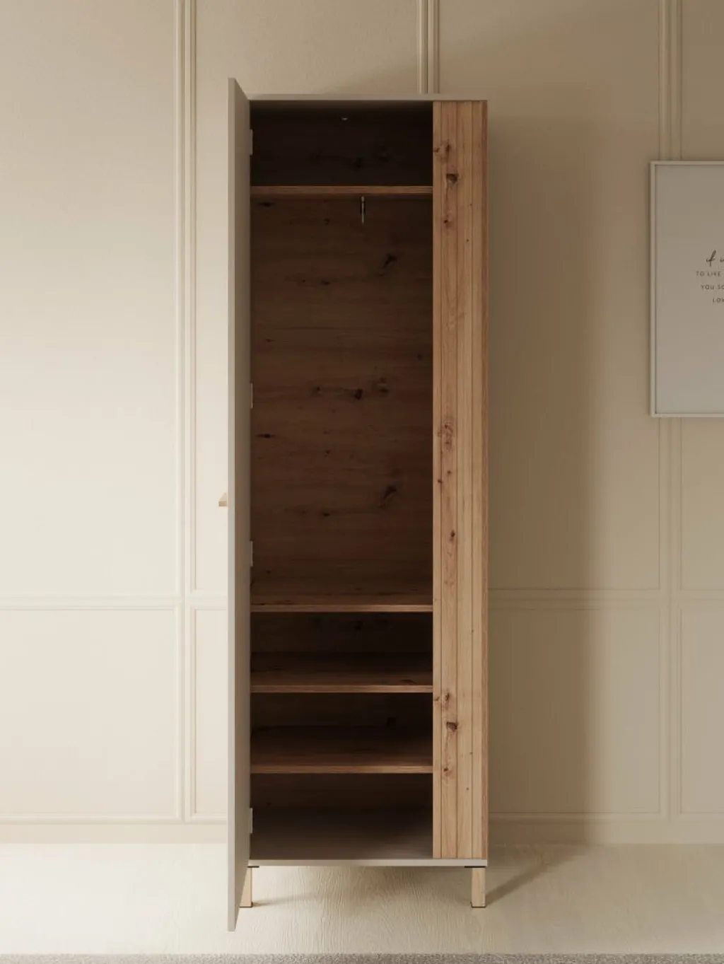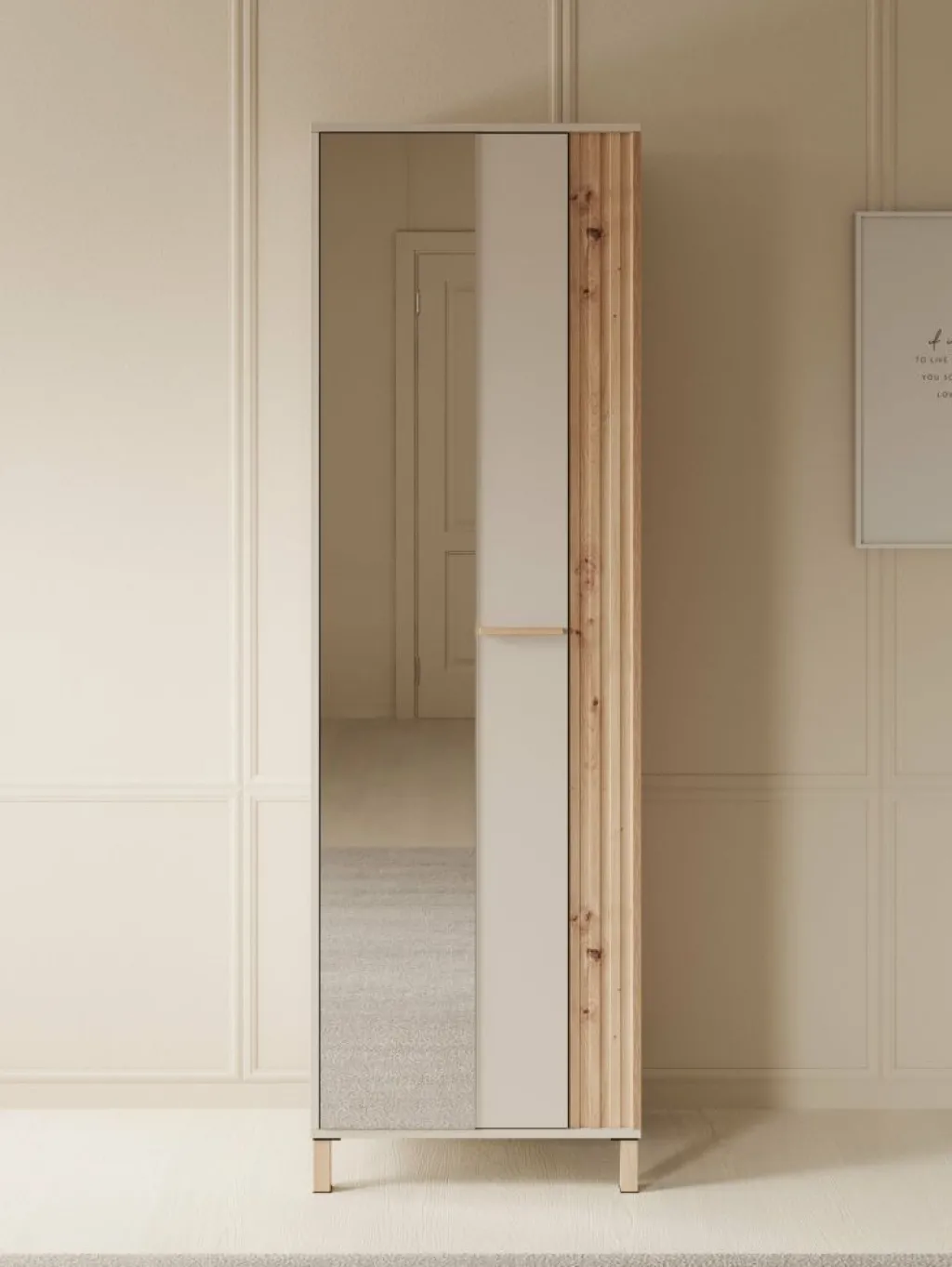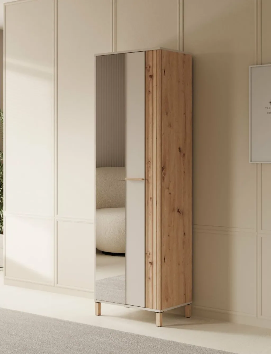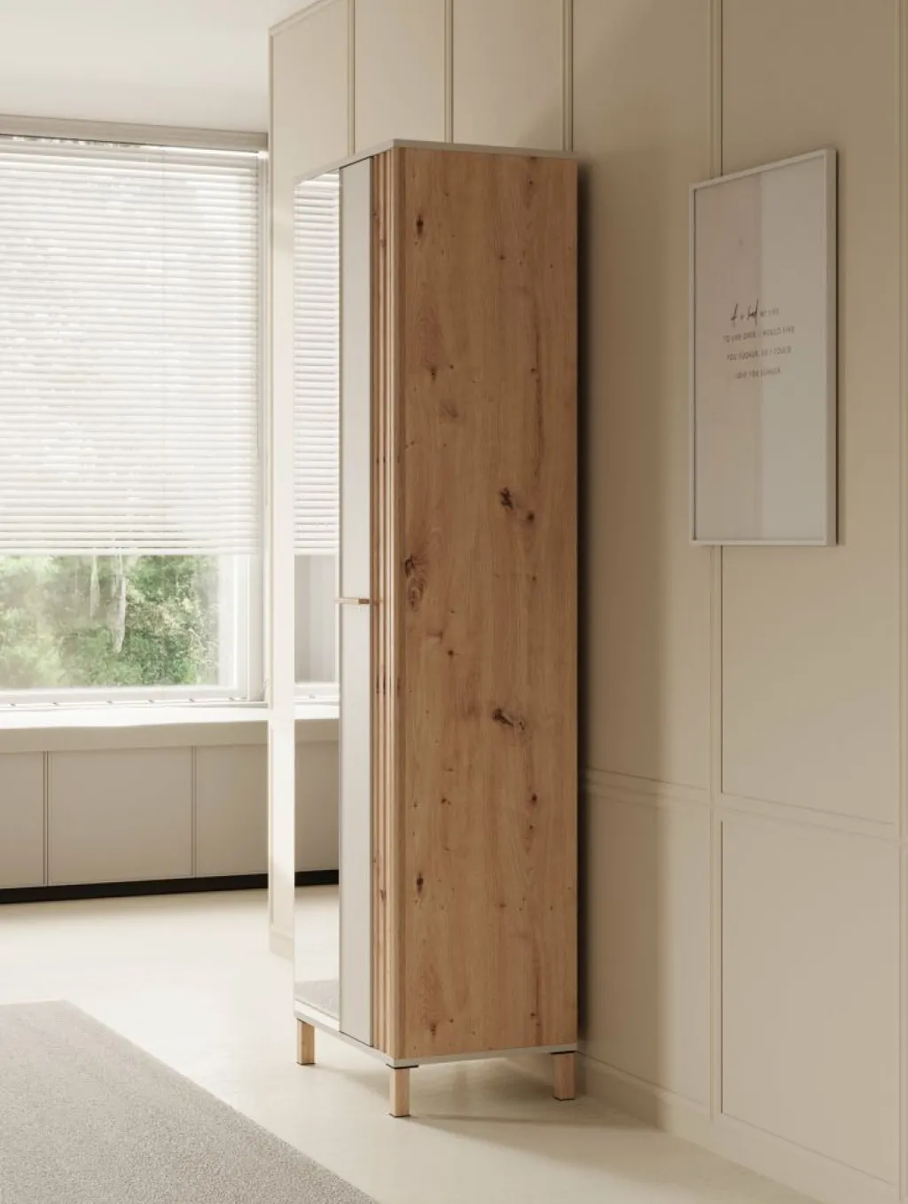 Halkast Bahia is een moderne garderobekast in de kleur eiken met beige. De kast heeft 1 deur die opent met een eiken kleurige handgreep. De voorkant van de deur is voorzien van een spiegel. De binnenkant van de kast bestaat uit 4 opbergvakken en 1 kledingroede.