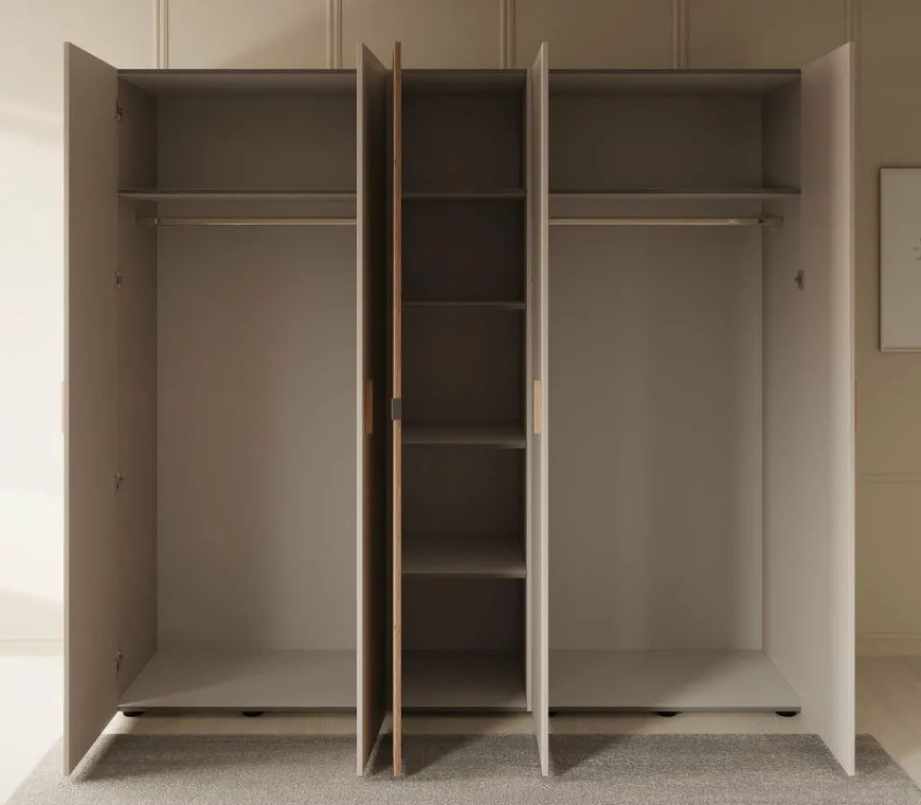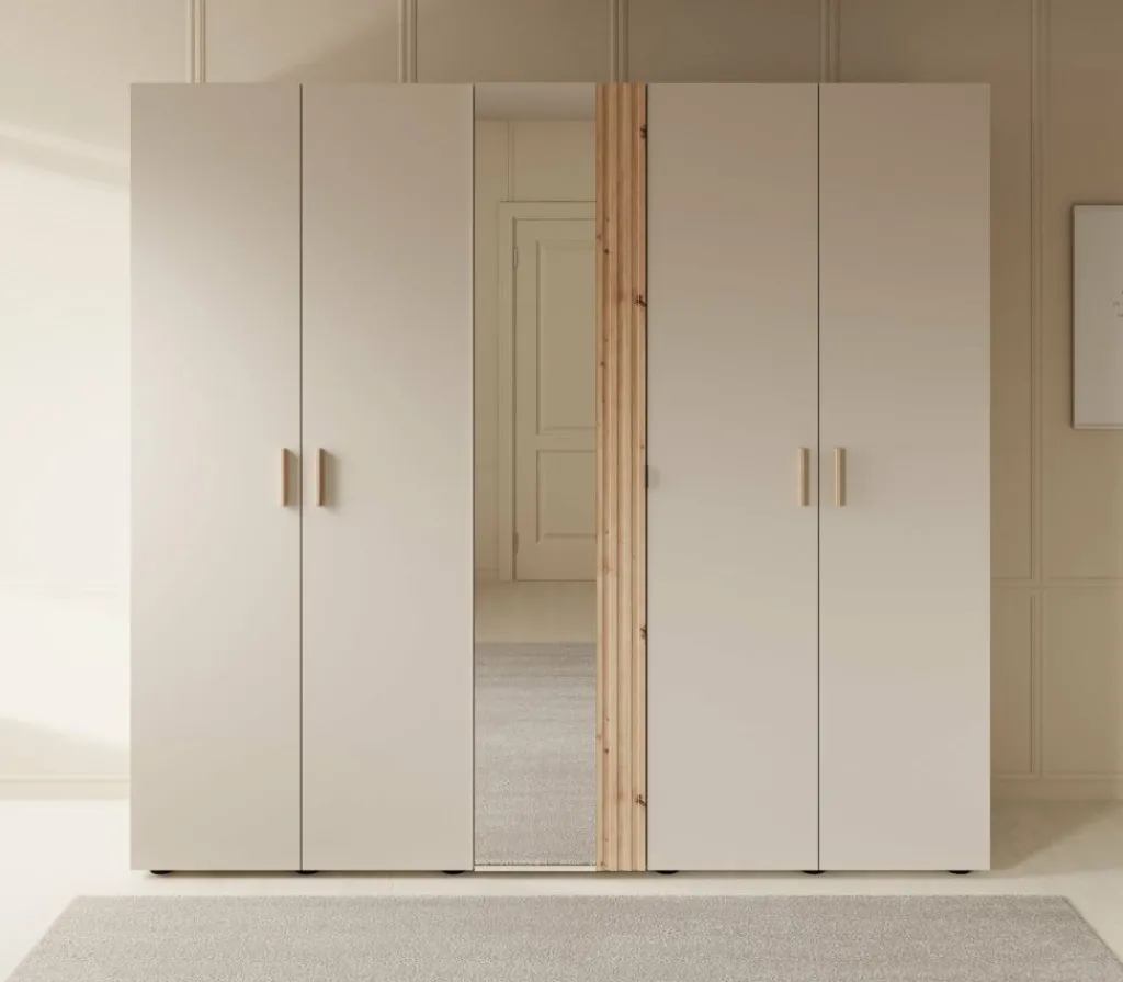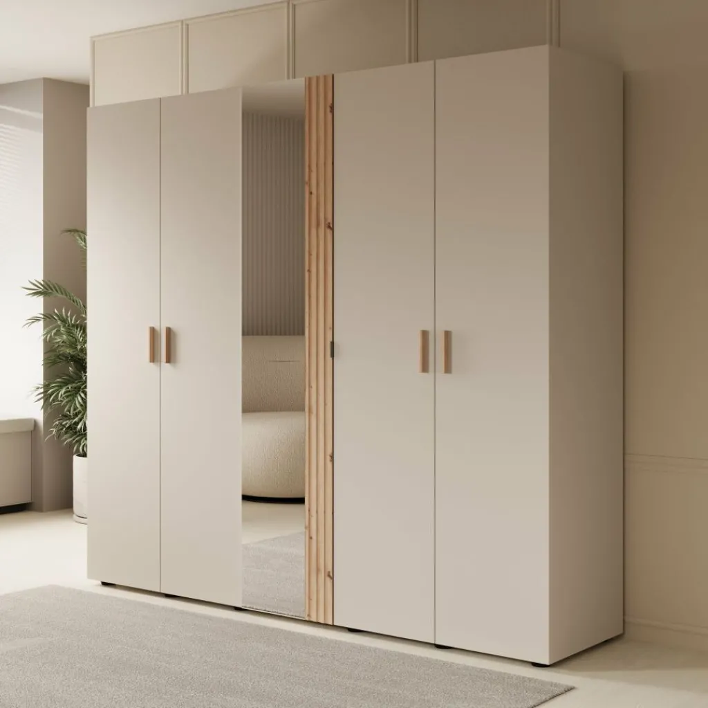 Kledingkast Bahia is een garderobekast met ruime opbergmogelijkheden in een moderne stijl. Dit model beschikt over 5 scharnierdeuren die te openen zijn met handgrepen. De middelste deur is voorzien van een spiegel. De binnenkant van de kast bestaat uit 2 kledingroedes en 7 opbergvakken. De Bahia is uitgevoerd in een beige met eiken kleur.