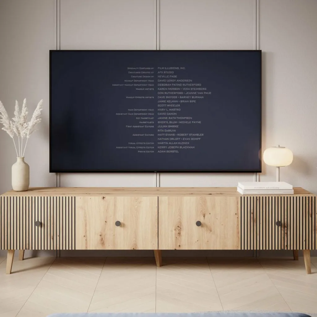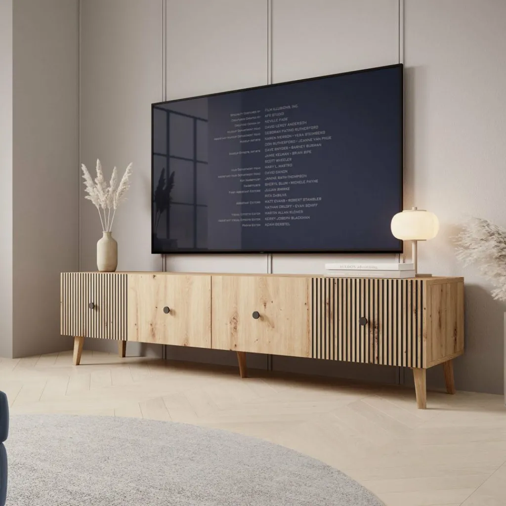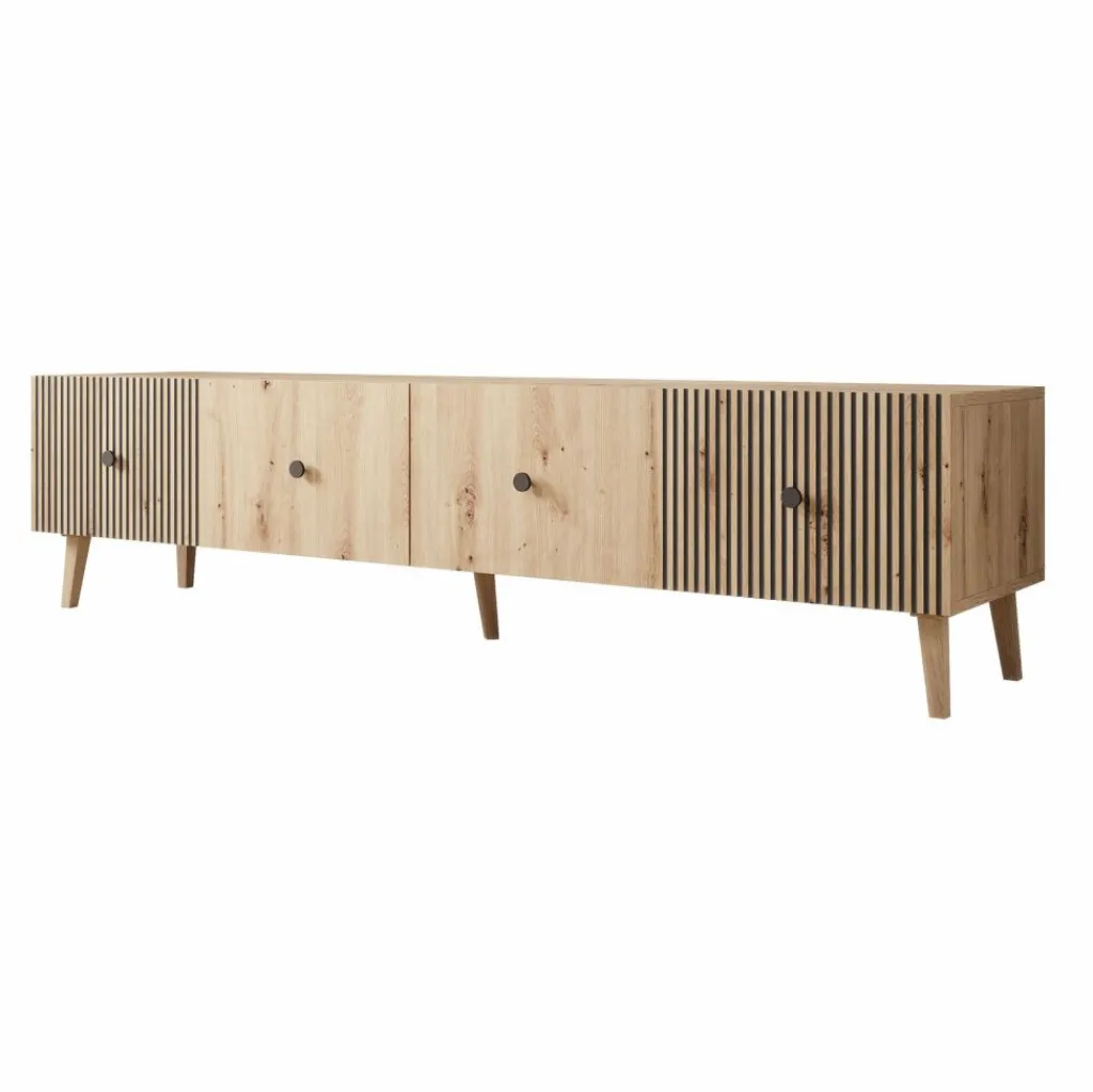 De Bali heeft 2 kleppen die openen met een zwarte handgreep. Daarachter bevindt zich een groot opbergvak. Op de voorkant van de klep zit een lattenpatroon. Het tv-meubel staat op hoge pootjes.