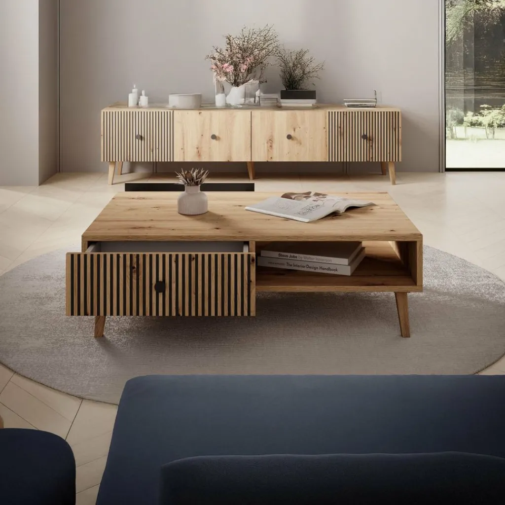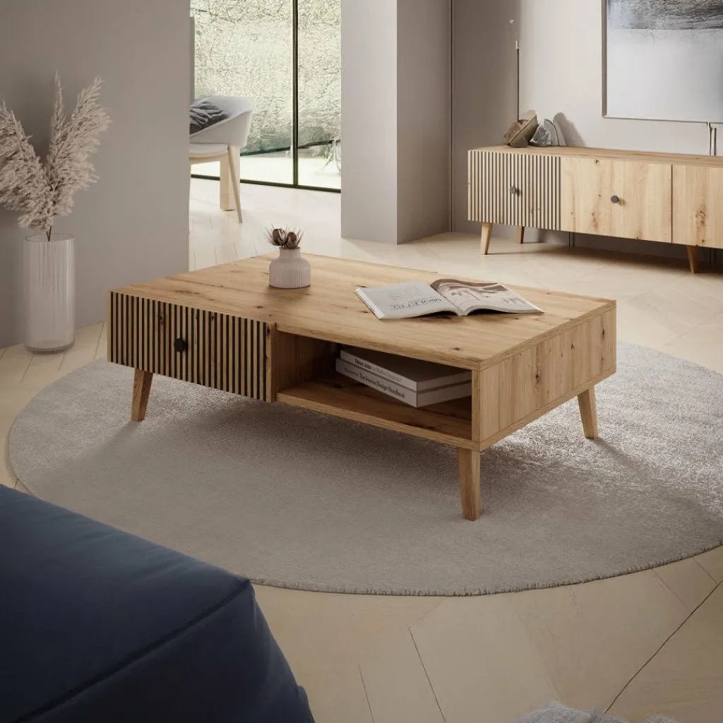 Salontafel Bali is een salontafel met een moderne, warme uitstraling. De tafel beschikt over 2 lades onder het blad. Deze openen via een zwarte knop. Op de voorkant van de lades zit een lattenpatroon. De salontafel staat op eikenkleurige, hoge pootjes.