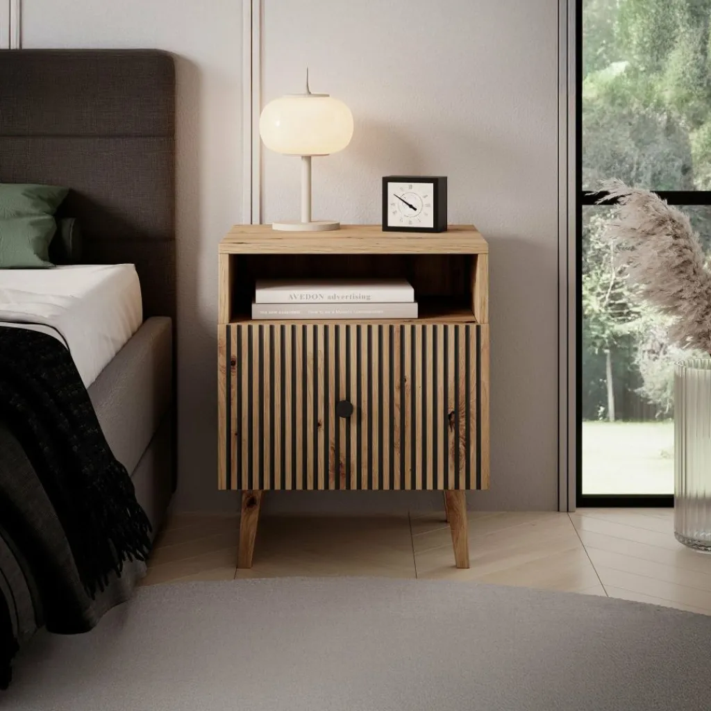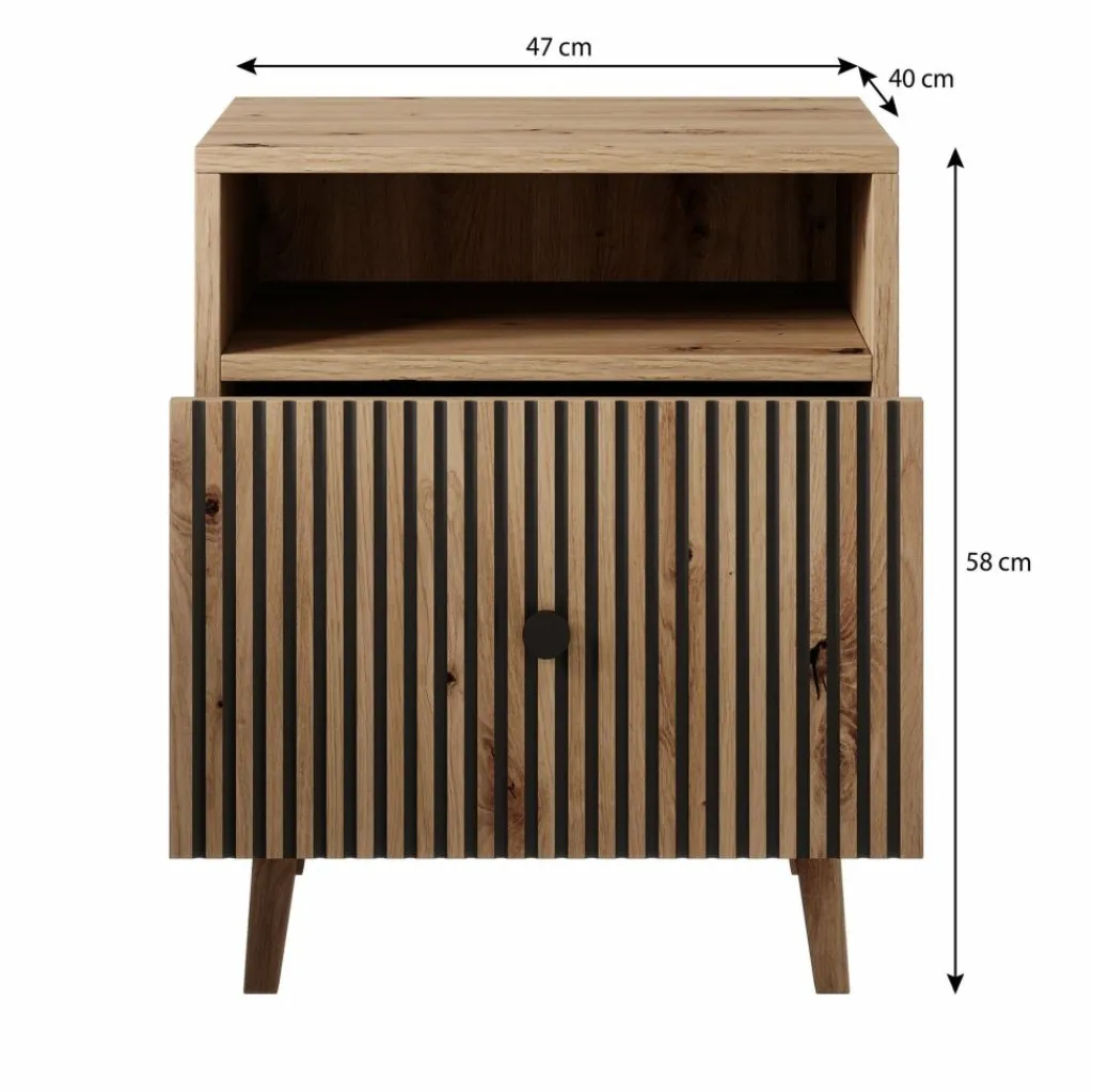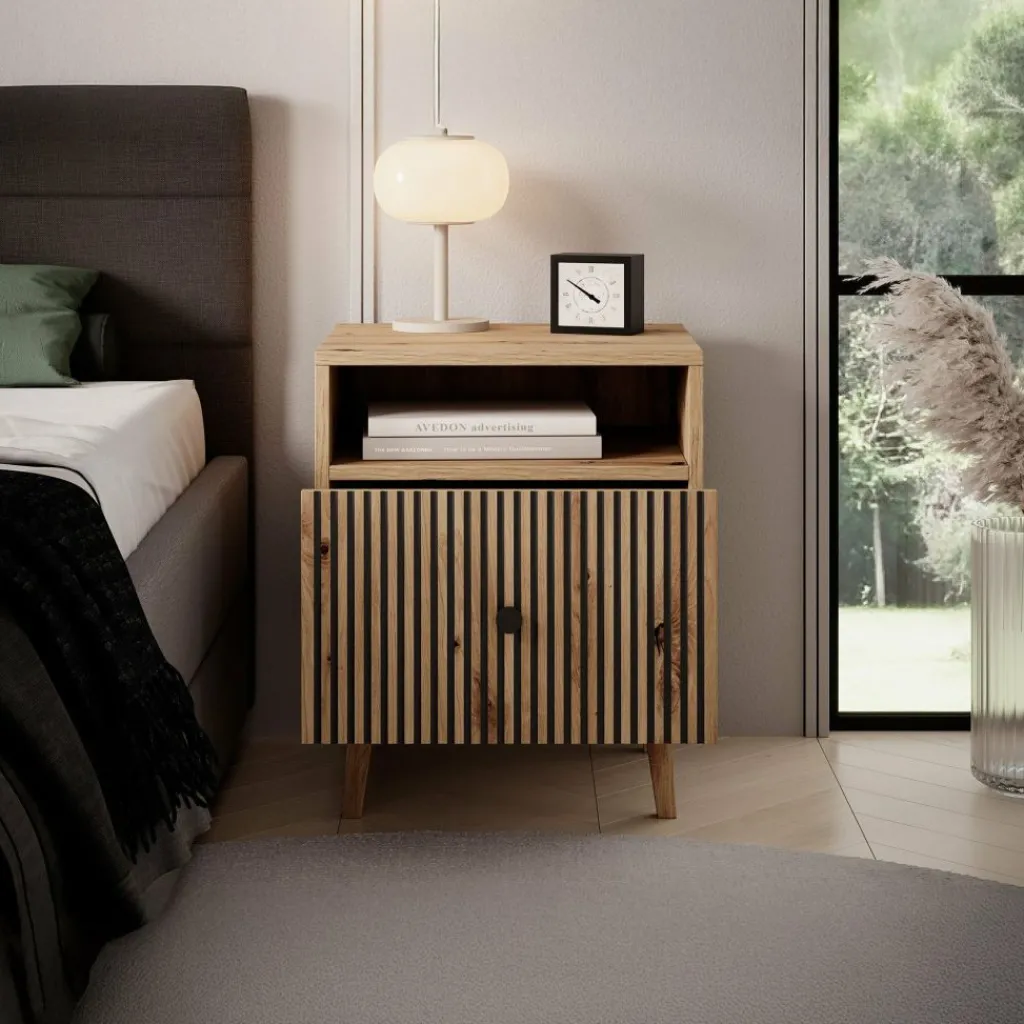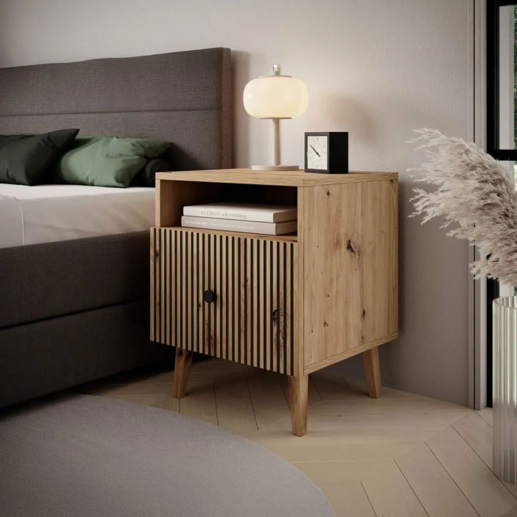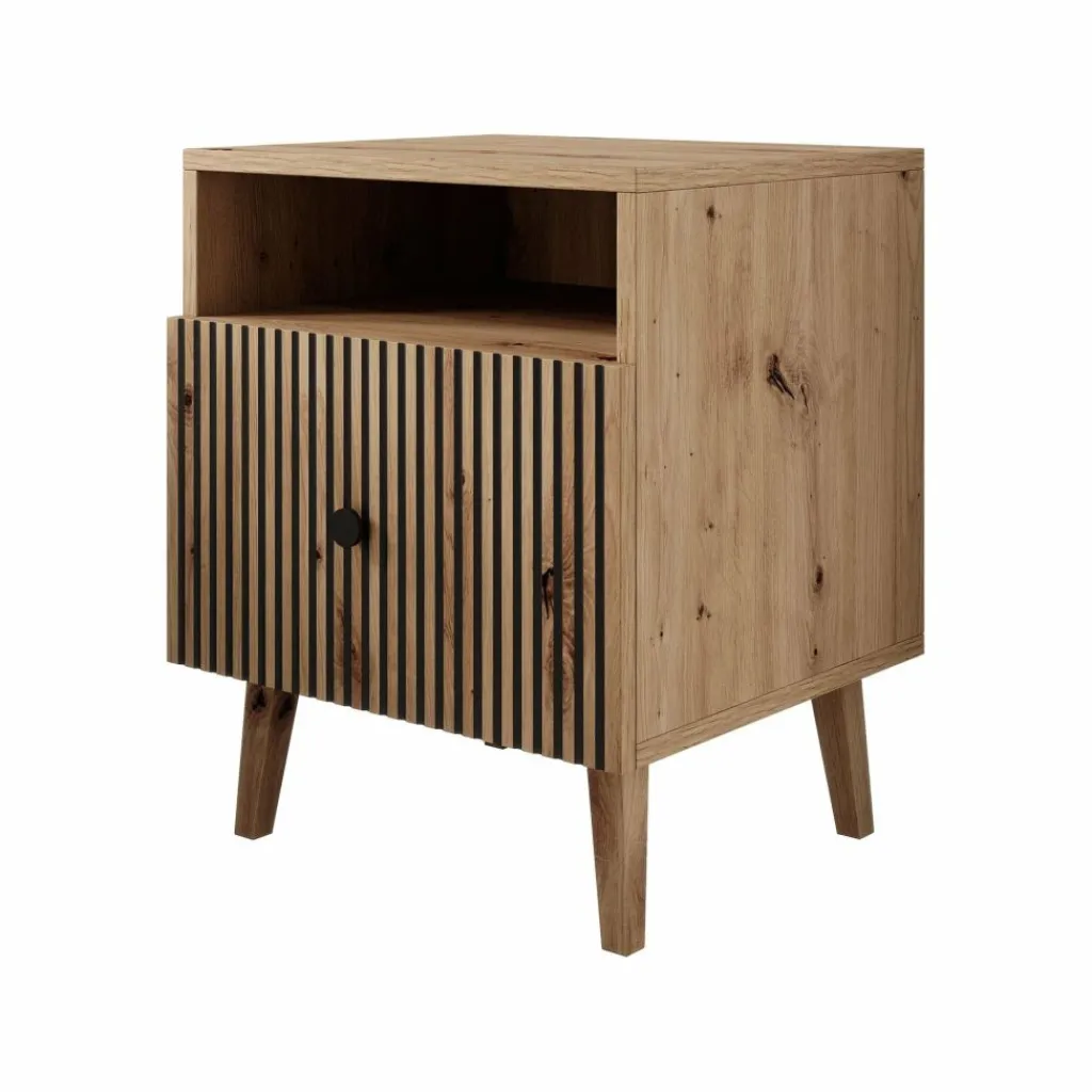 De Bali beschikt over 1 lade die via een zwarte handgreep te openen is. De voorkant van de lade heeft een lattenpatroon. Het nachtkastje staat op eikenkleurige, hoge pootjes.