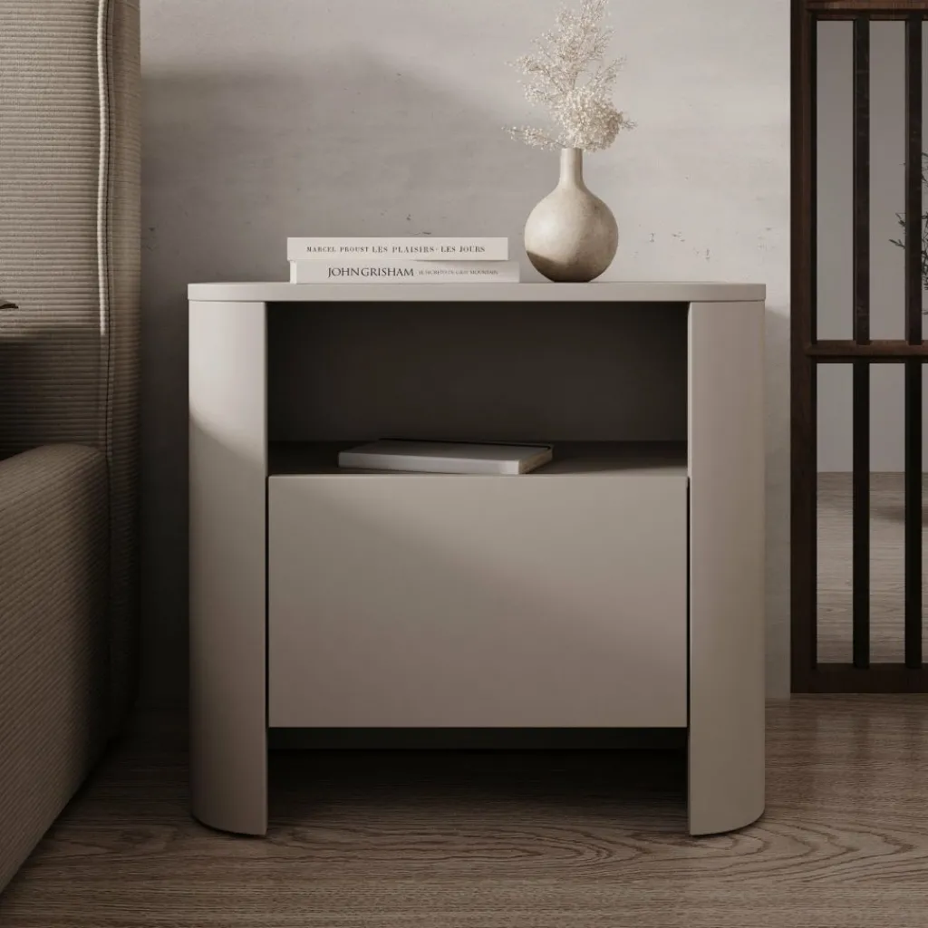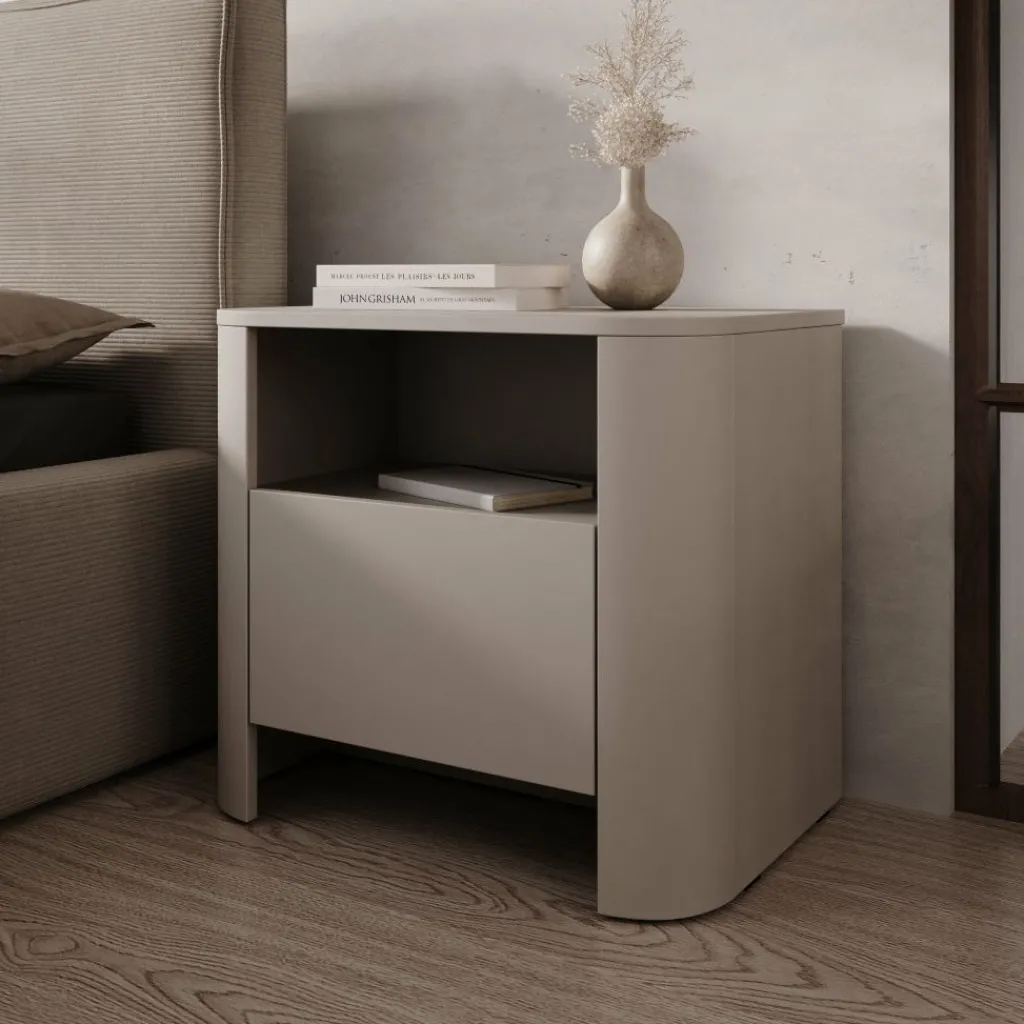 Nachtkastje Barbados is een stijlvol en praktisch meubel uitgevoerd in een beige kleur. Het moderne design met afgeronde hoeken geeft het kastje een zachte en elegante uitstraling die perfect past in iedere slaapkamer.