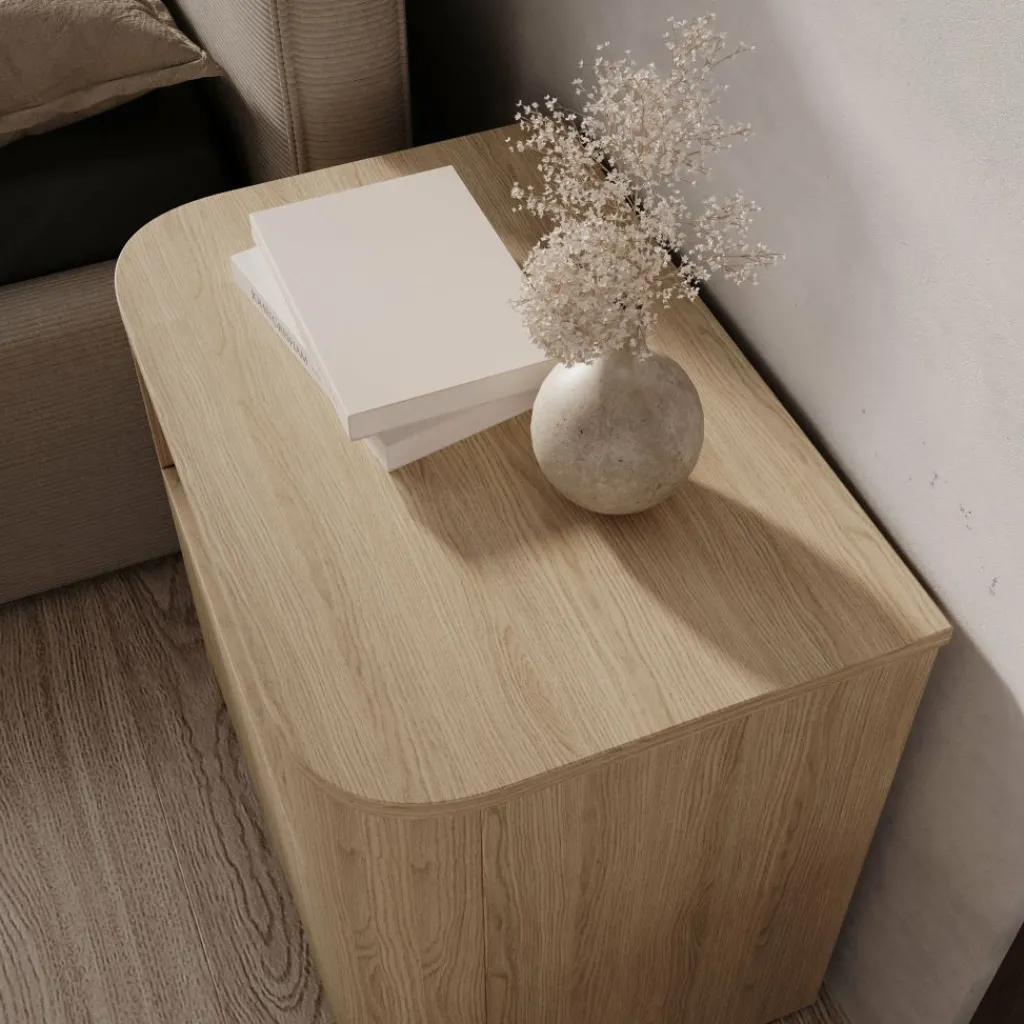 Nachtkastje Barbados is een praktisch en stijlvol meubel uitgevoerd in een warme eiken kleur. Het moderne design met afgeronde hoeken en strakke lijnen geeft het kastje een rustige en natuurlijke uitstraling.