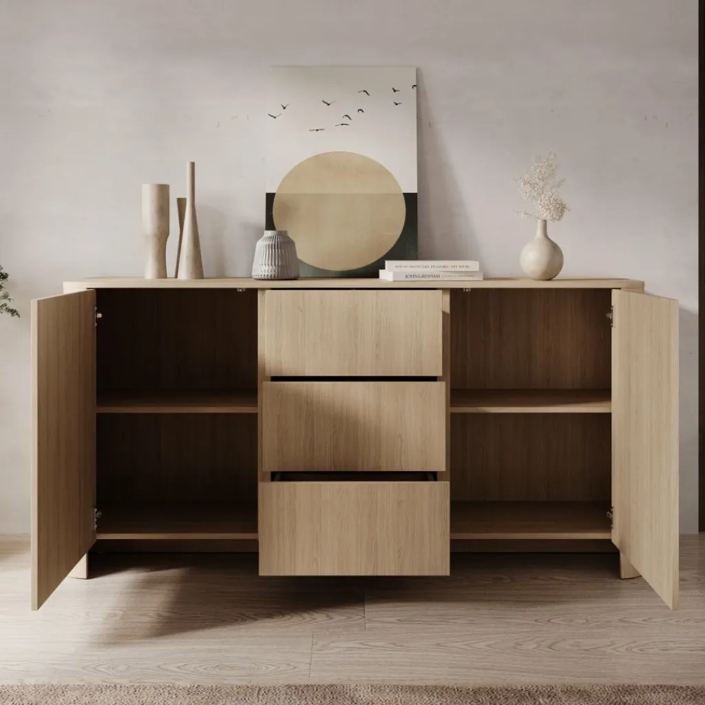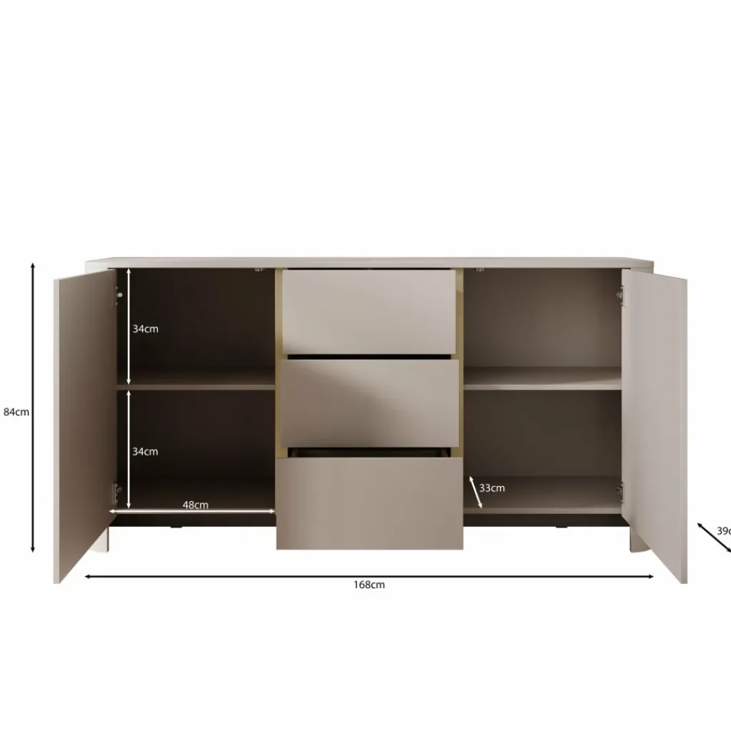 Het dressoir beschikt over twee deuren en drie greeploze lades, waardoor je zowel gesloten opbergruimte als handige indelingsmogelijkheden hebt. Met een afmeting van 168x39x84 cm biedt de Barbados veel opbergruimte zonder dat het meubel te veel ruimte inneemt in de kamer.