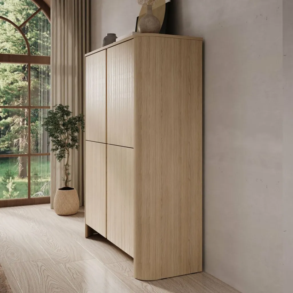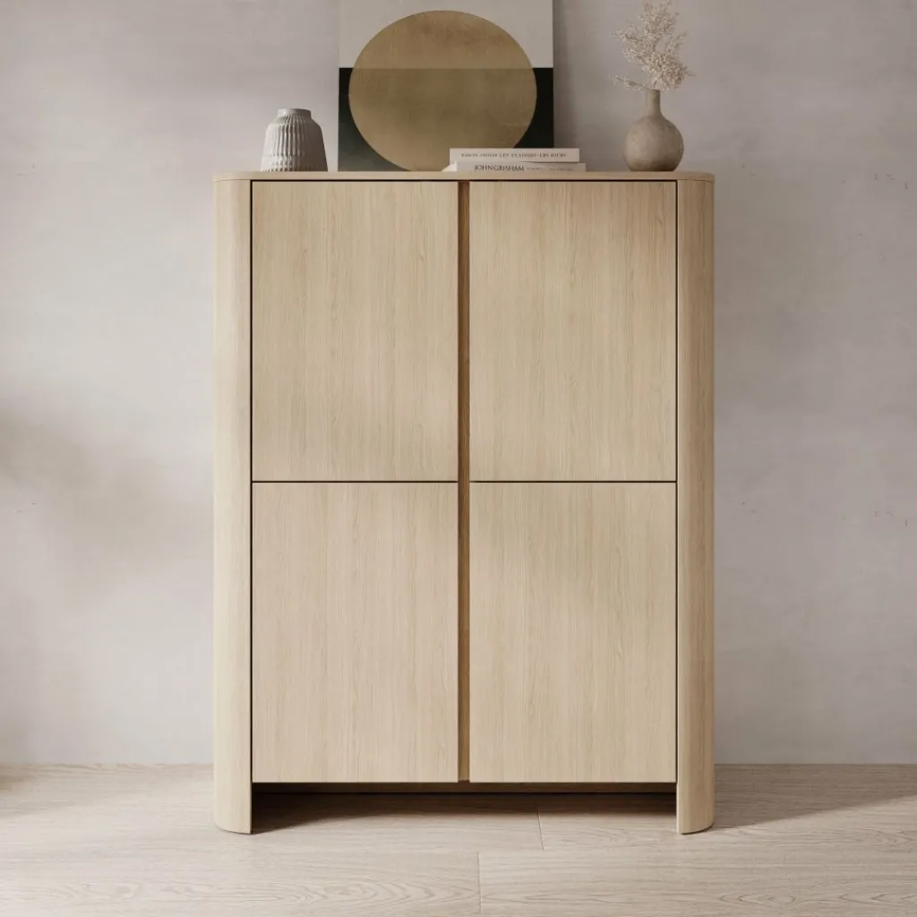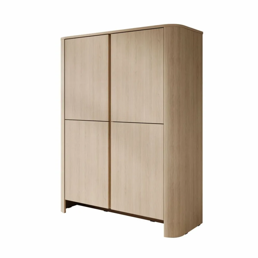 Achter de vier greeploze deuren vind je ruime opbergvakken, ideaal om je spullen netjes en uit het zicht te bewaren. Met een afmeting van 103x39x132 cm combineert dit dressoir een compact formaat met veel opbergruimte, waardoor het zowel in kleinere als grotere ruimtes tot zijn recht komt.