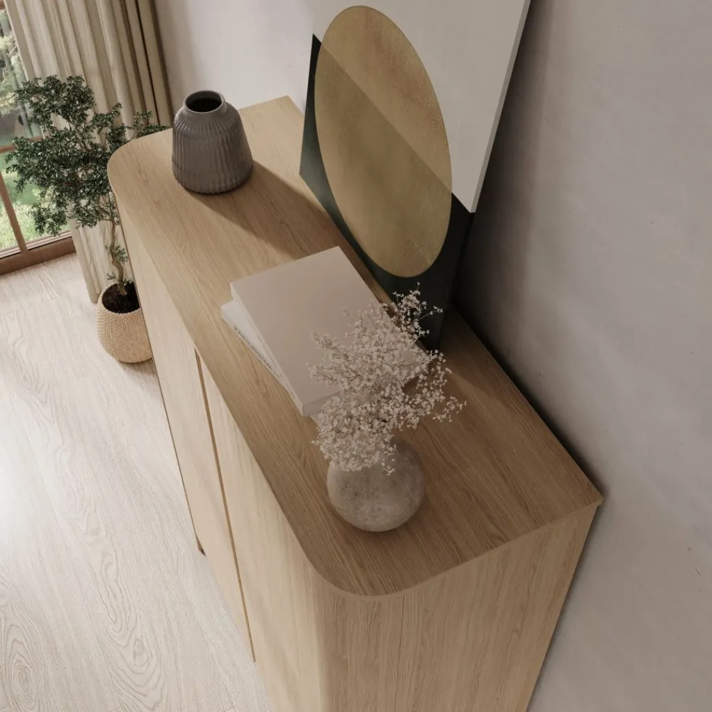 Dressoir Barbados is een stijlvol en praktisch meubel uitgevoerd in een warme eiken kleur. Het moderne design met afgeronde hoeken en een natuurlijke houtlook geeft het dressoir een rustige en sfeervolle uitstraling.